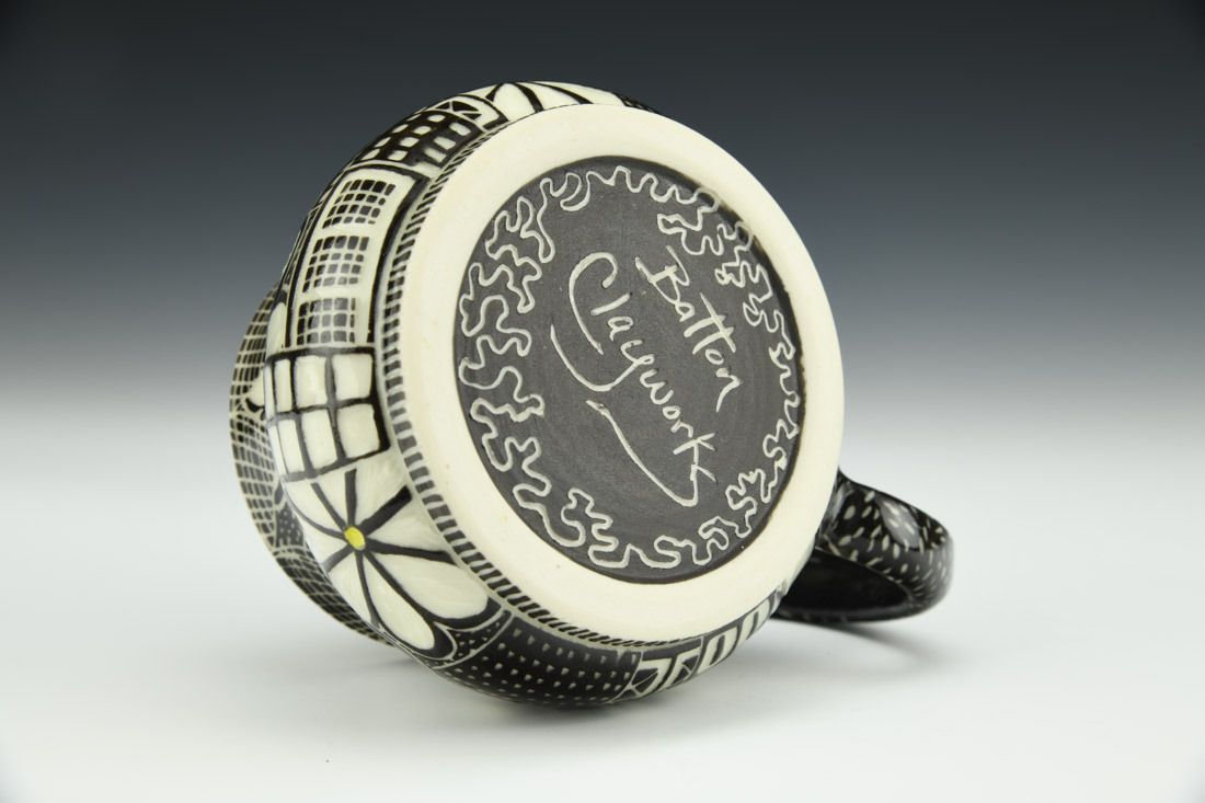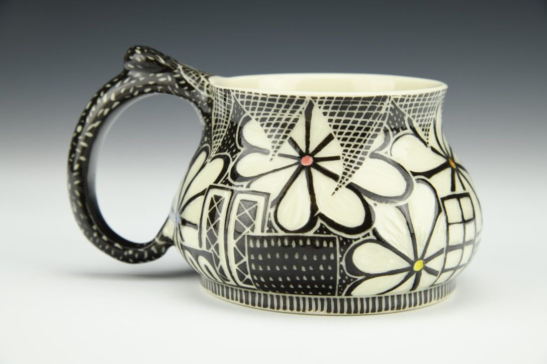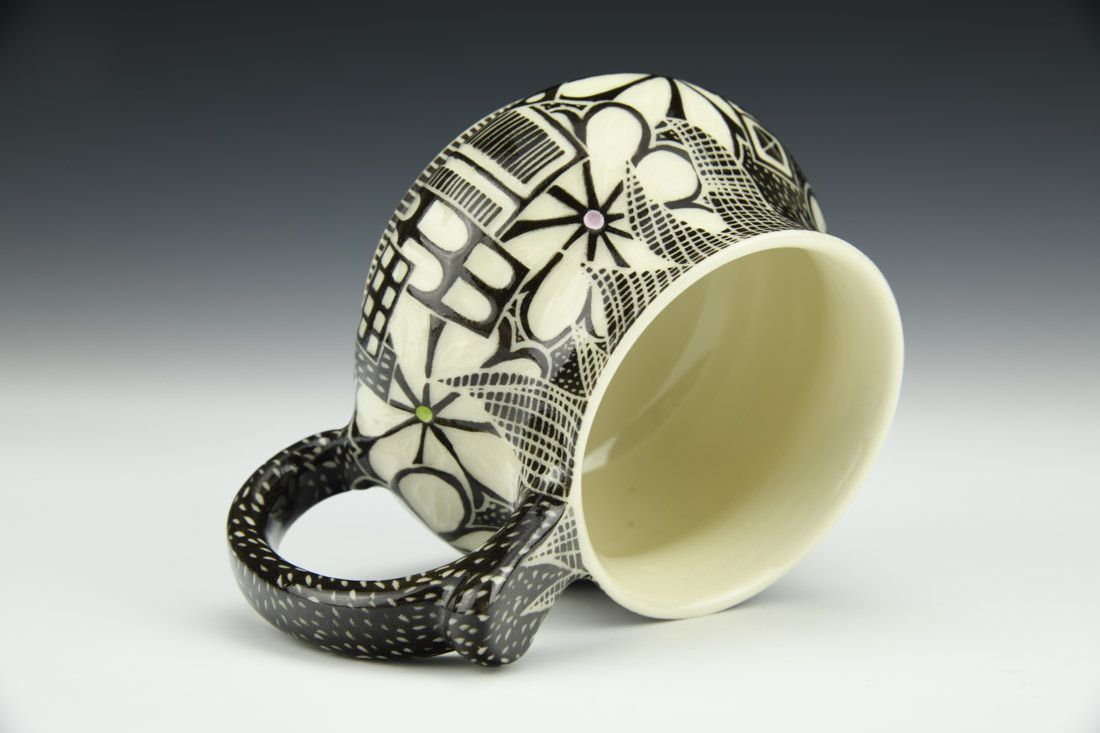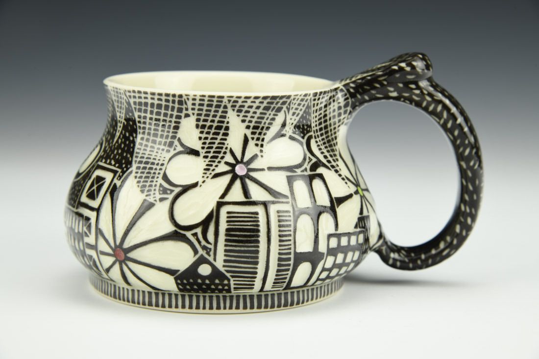 Porcelain, wheel thrown, sgraffito, cone 7 electric fired, 3 x 5.5 x 4 inches.