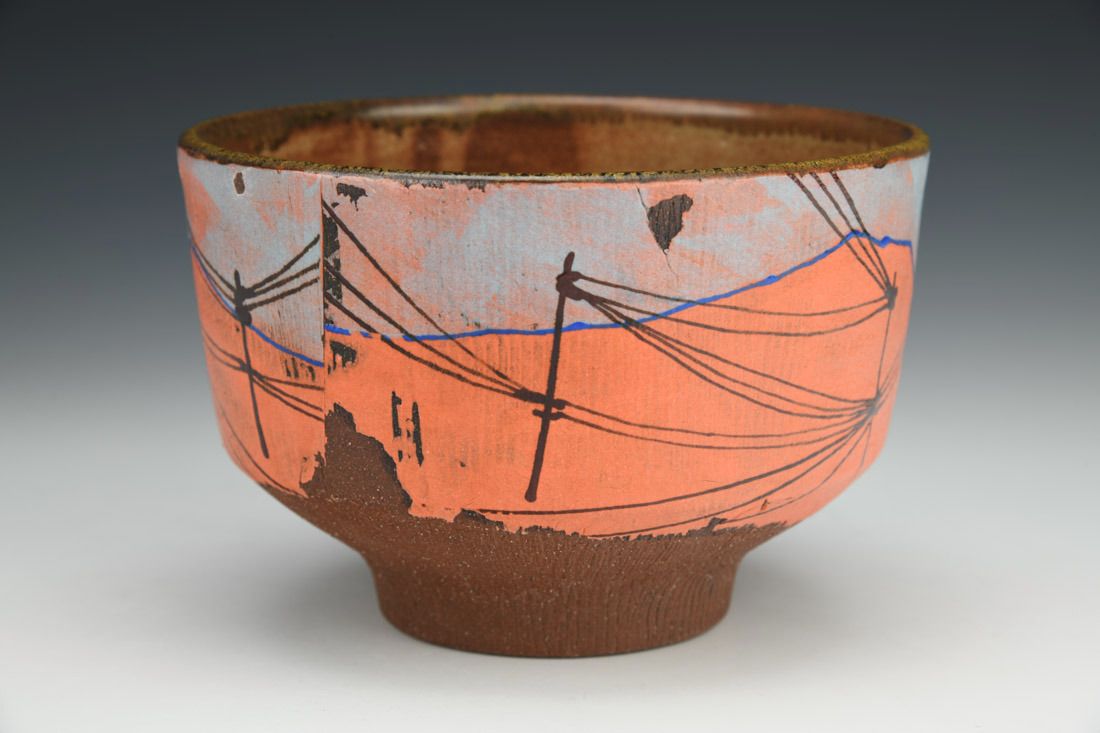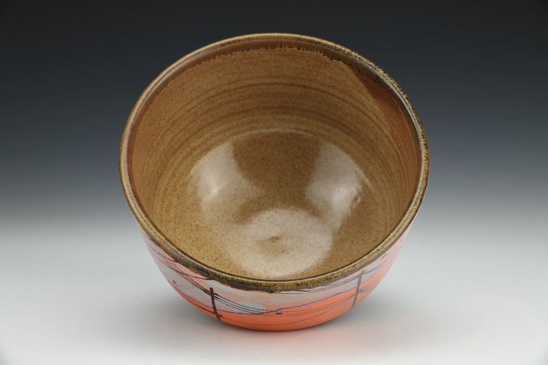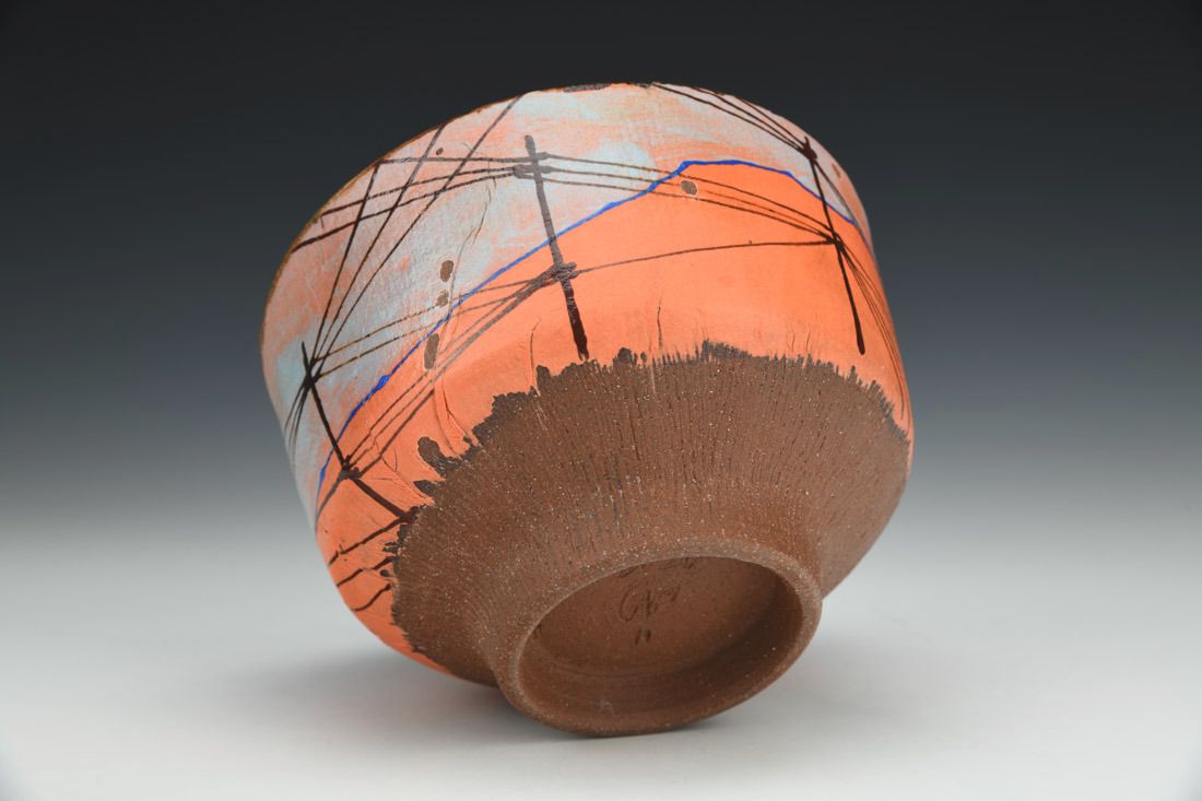 Red stoneware, wheel thrown, slip transfer, cone 6 oxidation fired, 3.5 x 5.75 x 5.75 inches.
