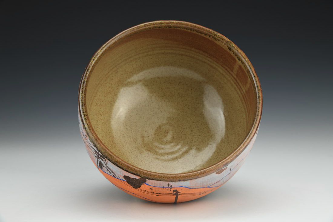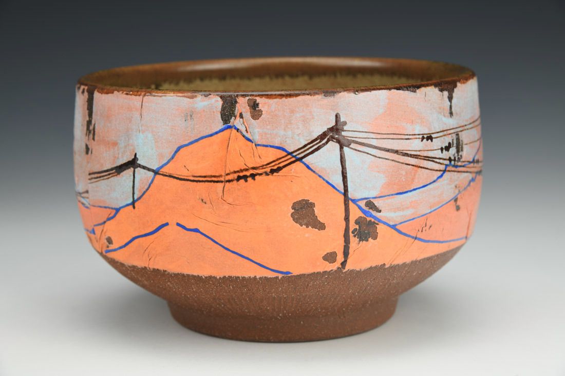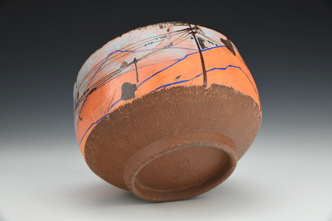 Red stoneware, wheel thrown, slip transfer, cone 6 oxidation fired, 4.25 x 6 x 6 inches.