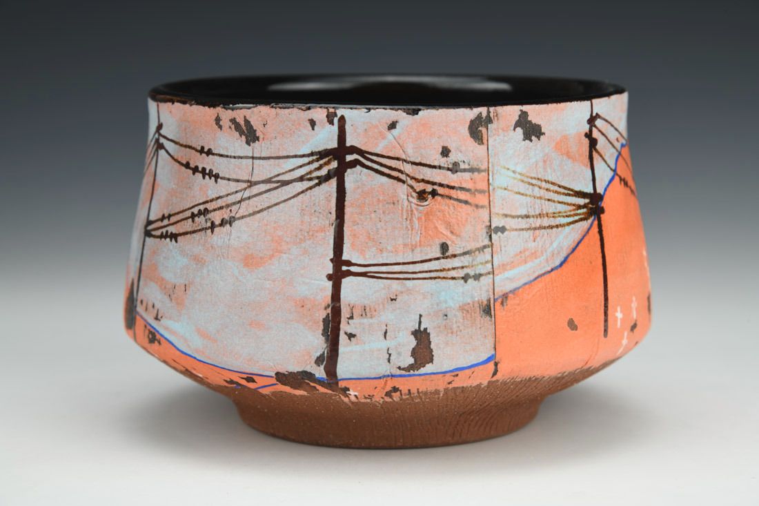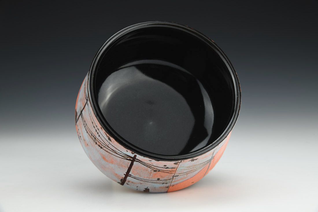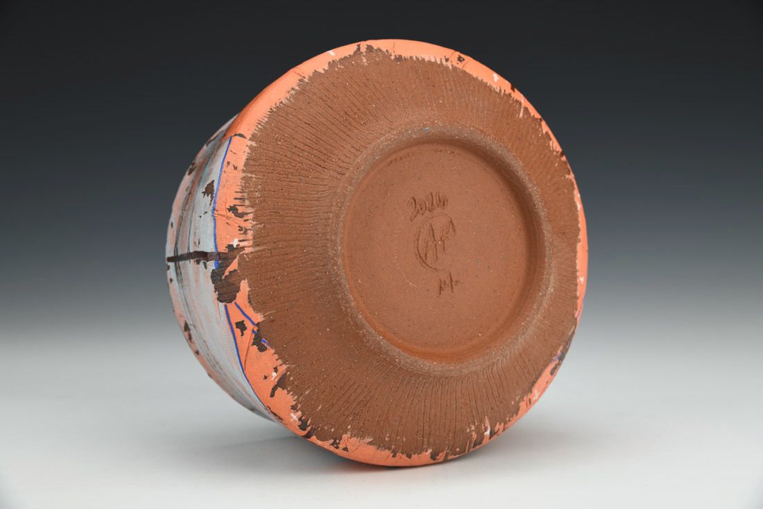 Red stoneware, wheel thrown, slip transfer, cone 6 oxidation fired, 3.5 x 5.5 x 5.5 inches.