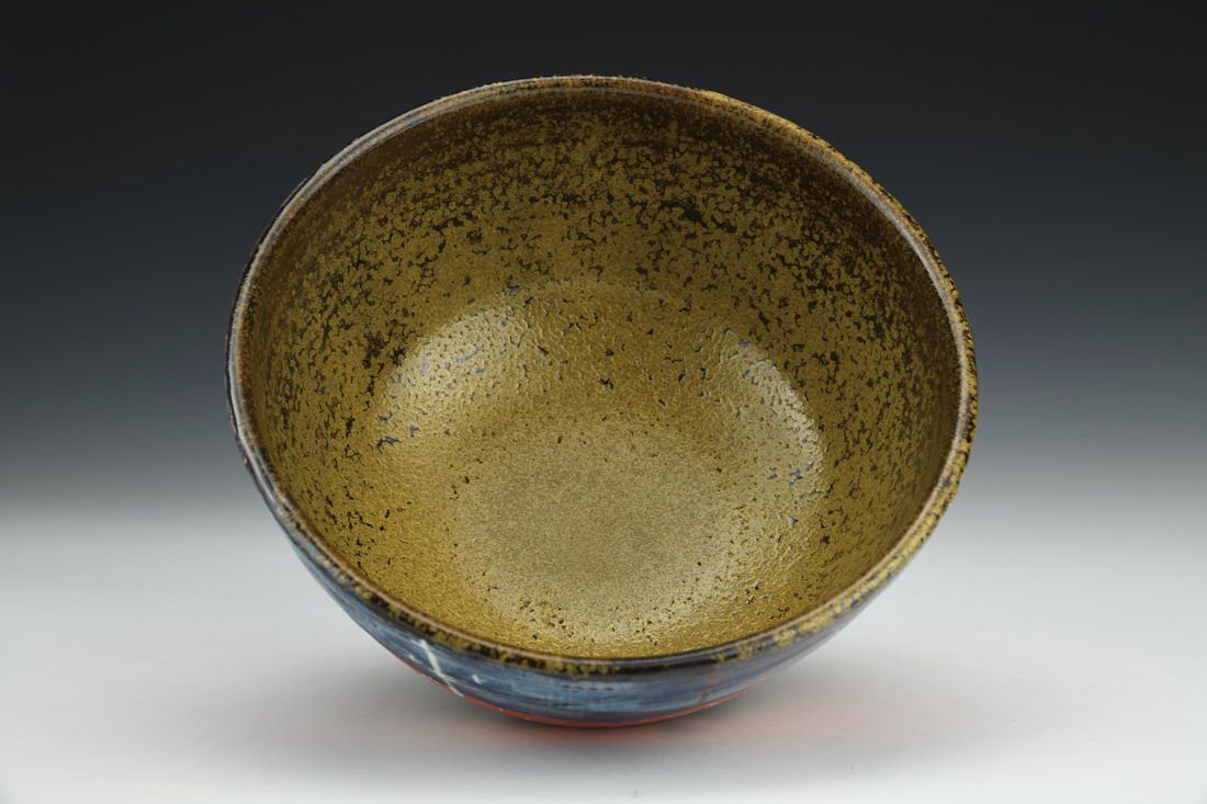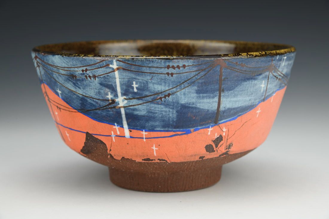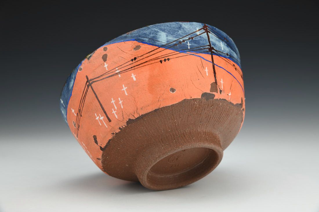 Red stoneware, wheel thrown, slip transfer, cone 6 oxidation fired, 3.5 x 6.5 x 6.5 inches.