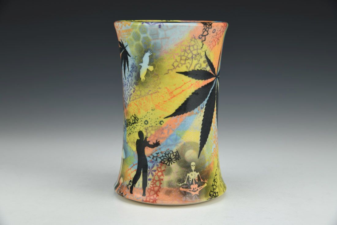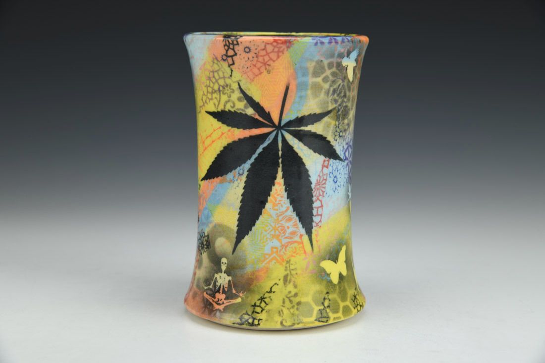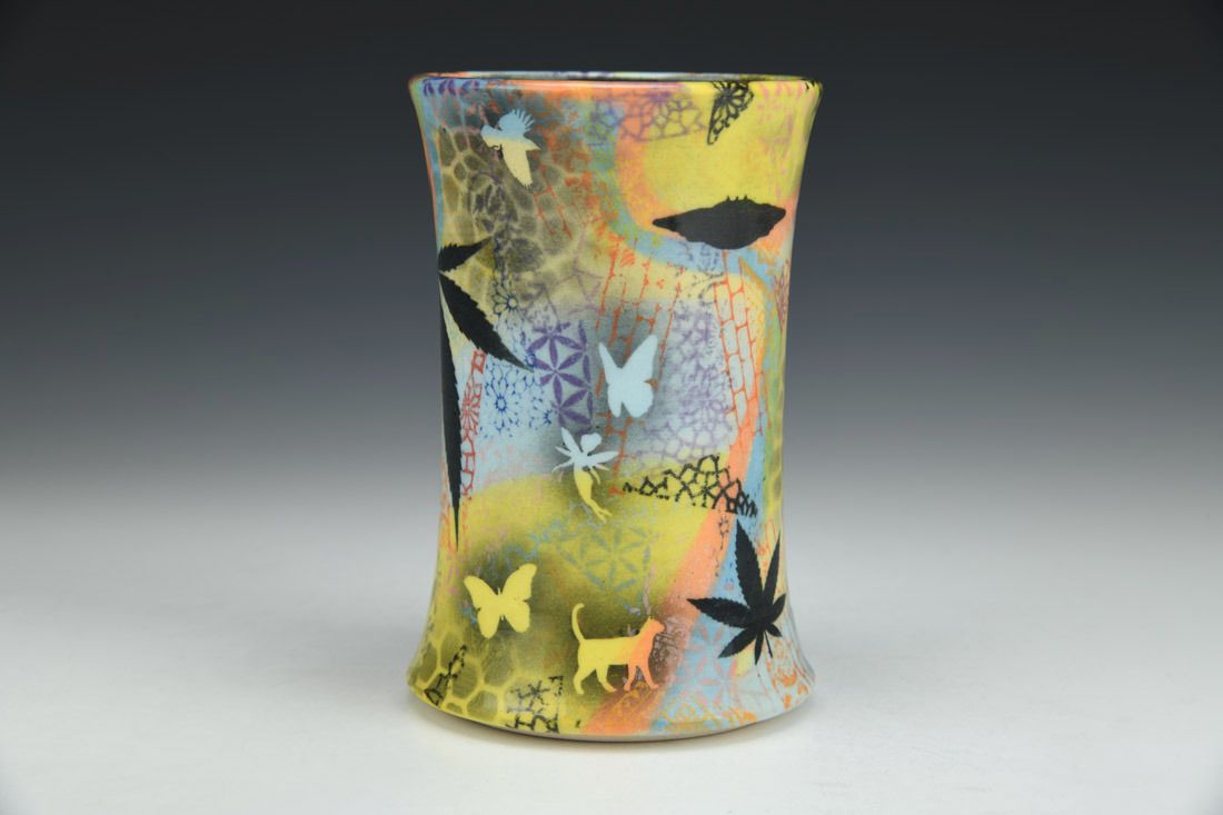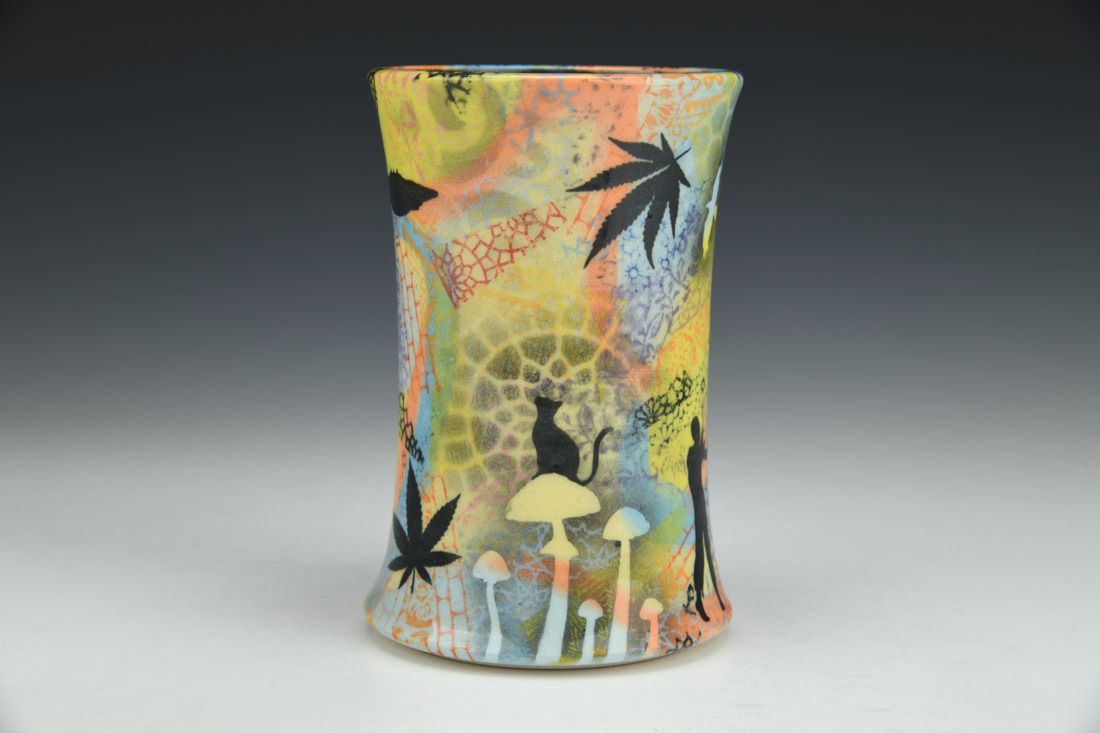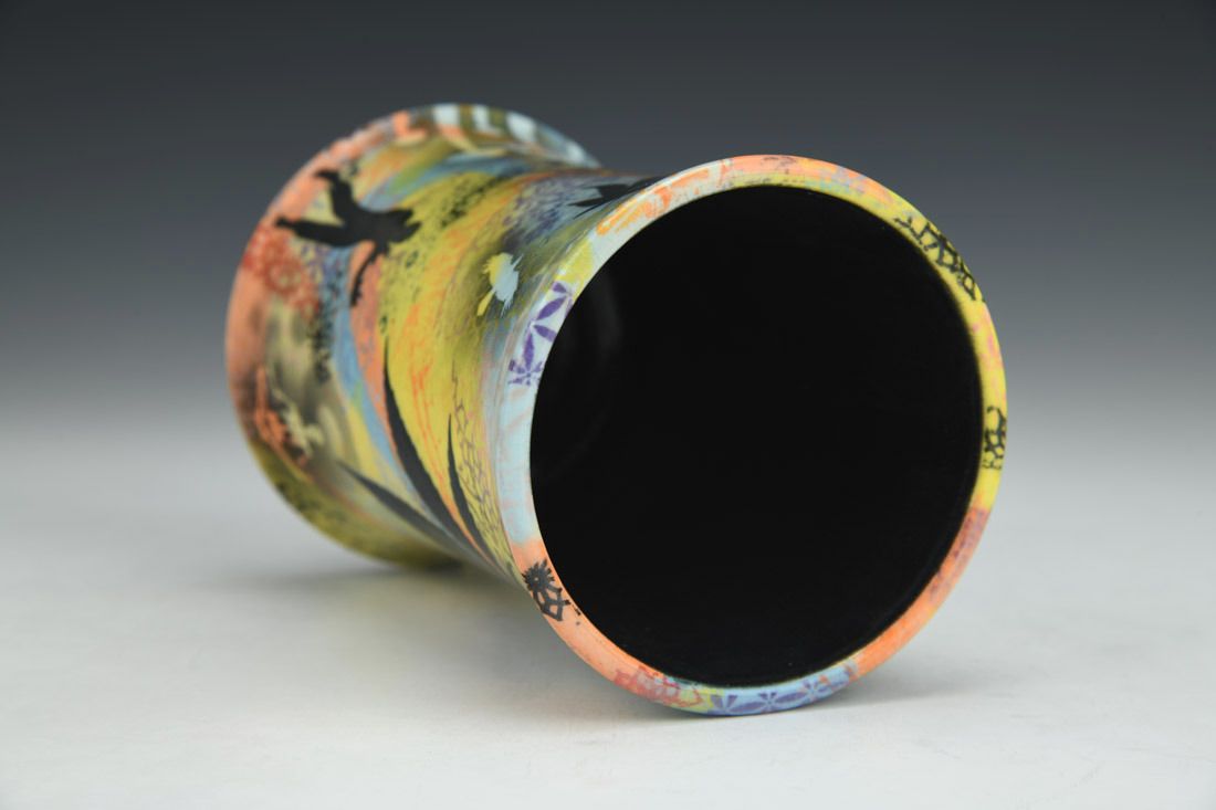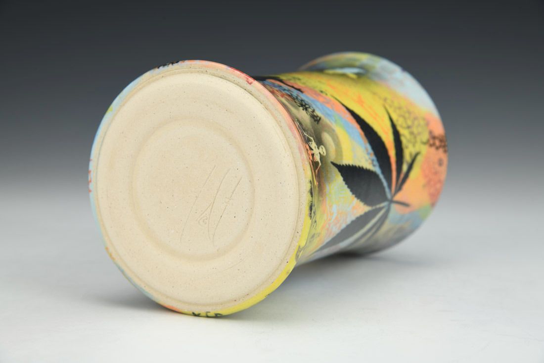 Stoneware, wheel thrown, underglaze, glaze, cone 6 oxidation fired, 5 x 3.5 x 3.5 inches.
