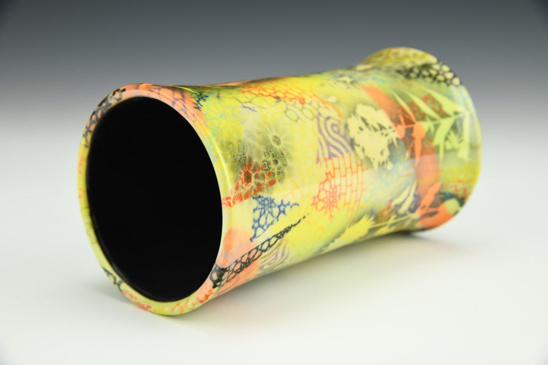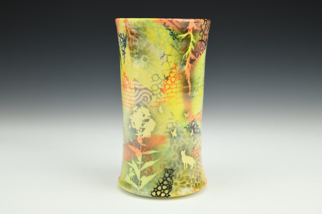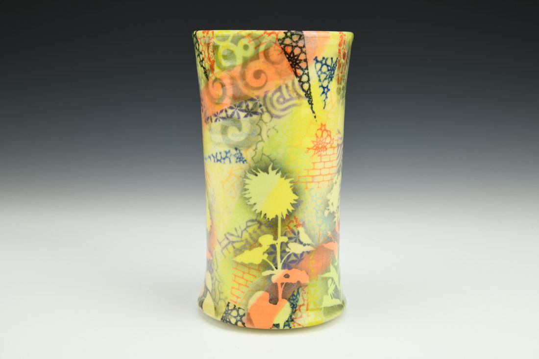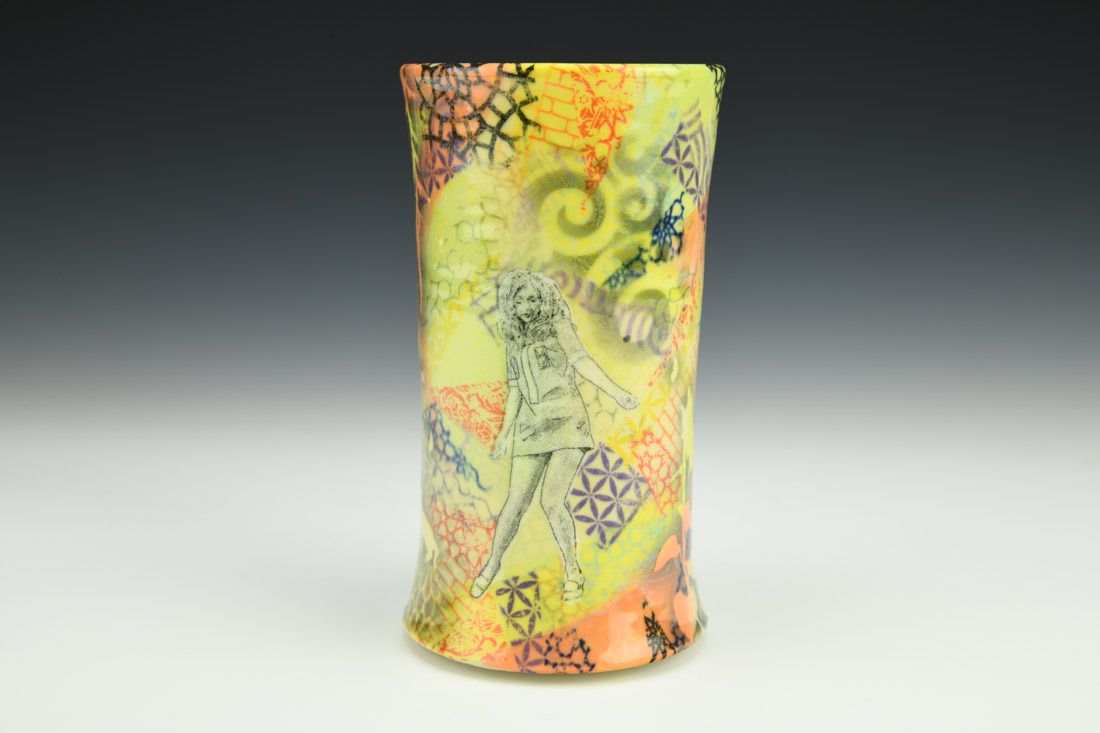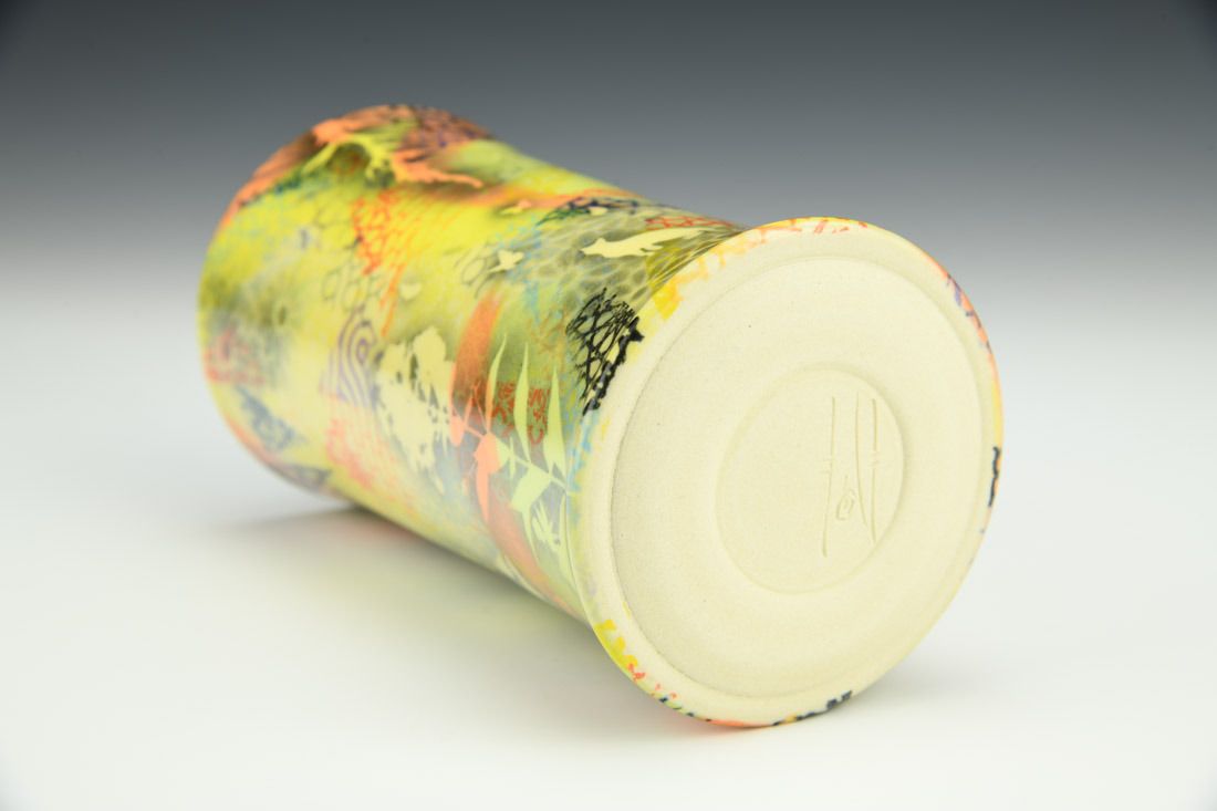 White stoneware, wheel thrown, underglaze, glaze, cone 6 fired, 6 x 3.25 x 3.25 inches.