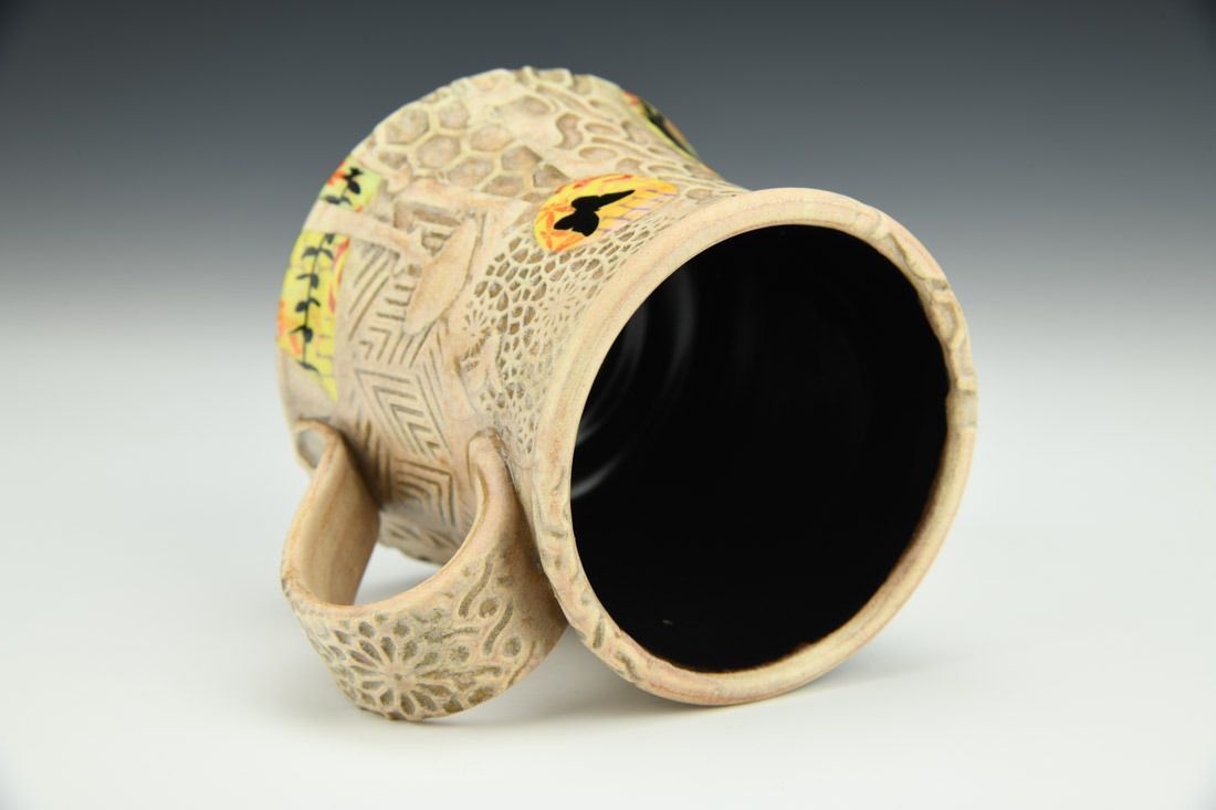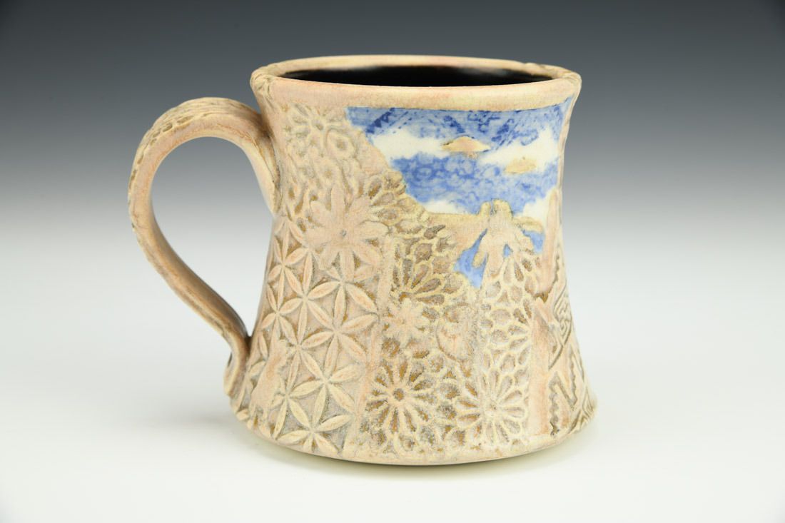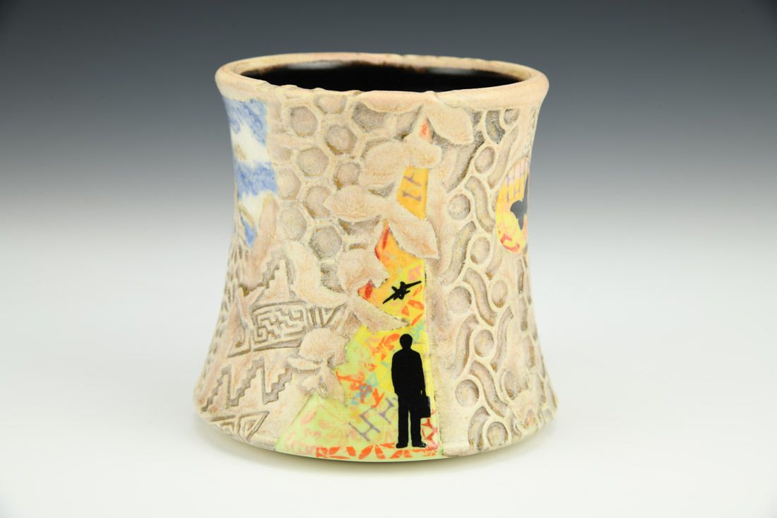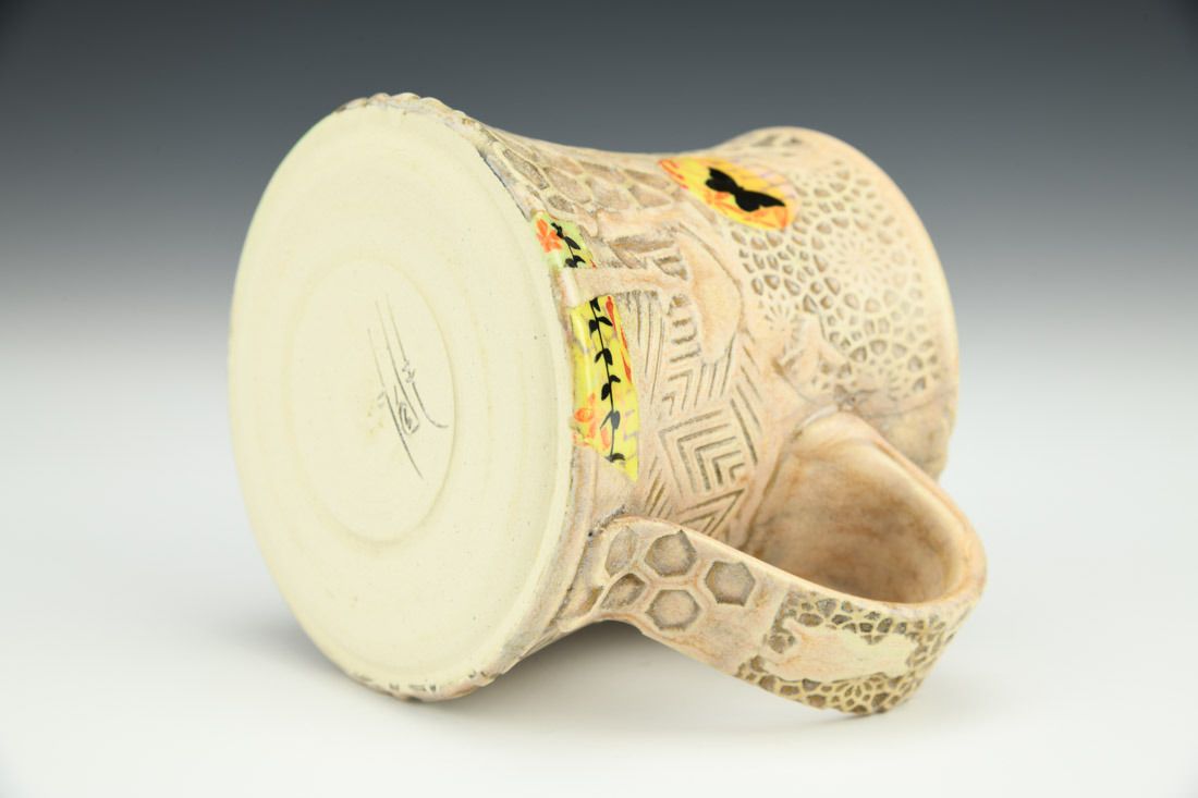 White stoneware, wheel thrown, underglaze, glaze, cone 6 fired, 3.75 x 5 x 4 inches.