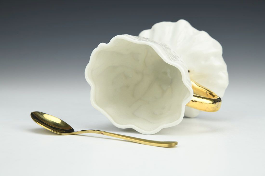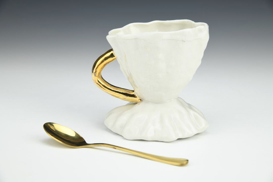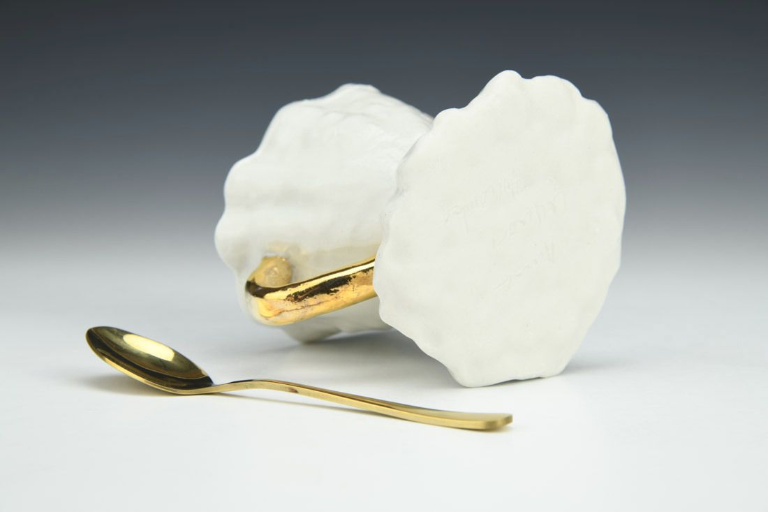 Porcelain with gold-finished stainless steel spoon, slipcast and hand built, gold luster, mid-range electric fired, 3.5 x 4 x 3.25 inches.