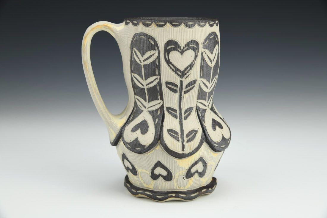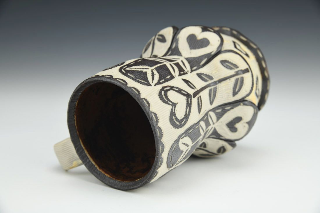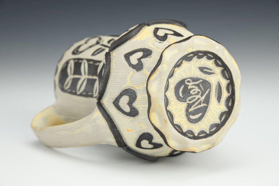 B-Mix, wheel thrown and altered, sgraffito, underglaze, cone 10 reduction fired, 5.25 x 4 x 3.5 inches.