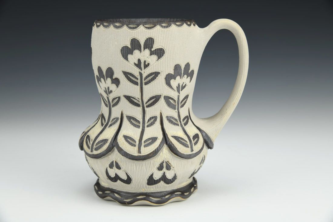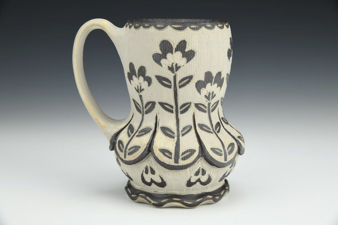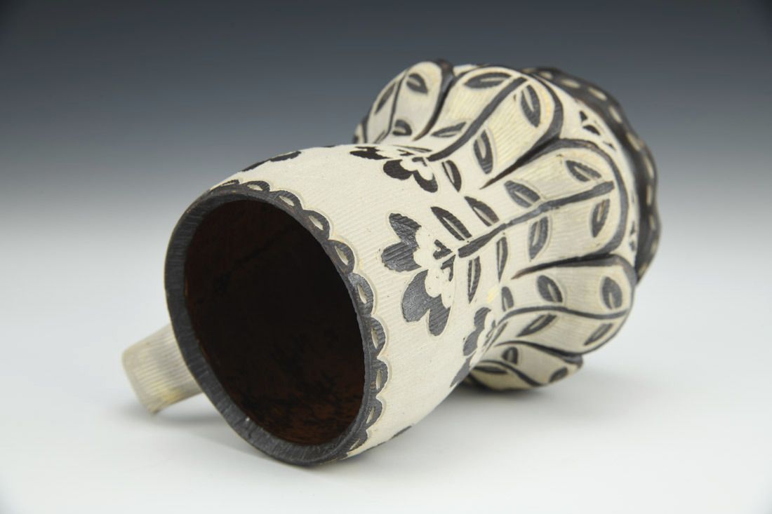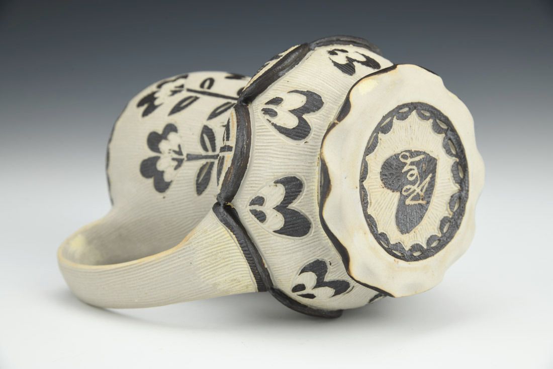 B-Mix, wheel thrown and altered, sgraffito, underglaze, cone 10 reduction fired, 5 x 4.5 x 4 inches.