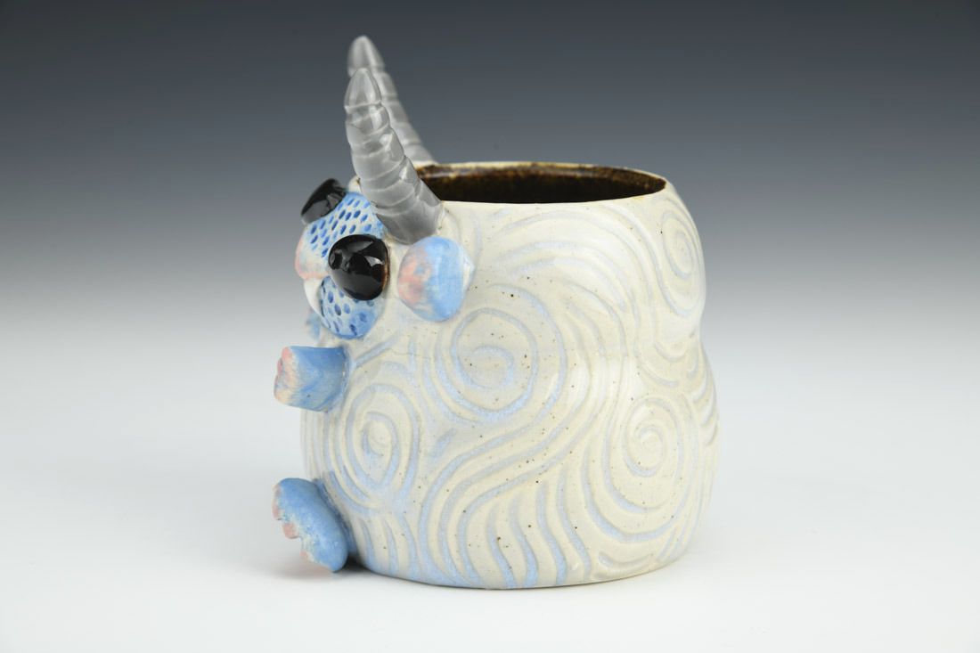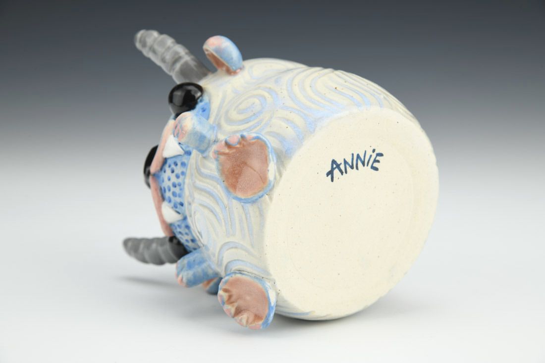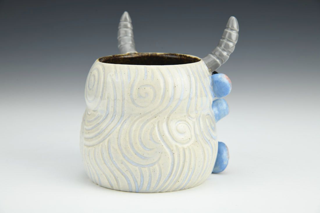 Stoneware, wheel thrown and hand built, underglaze, glaze, electric fired, 4 x 3.5 x 3.75 inches.