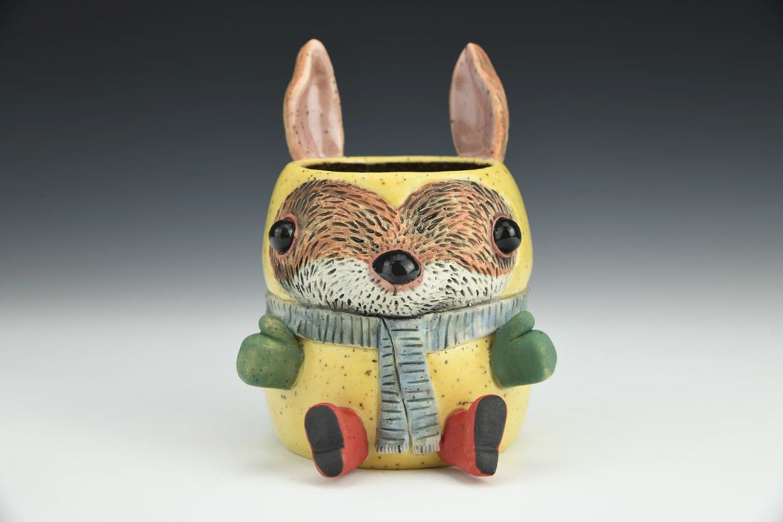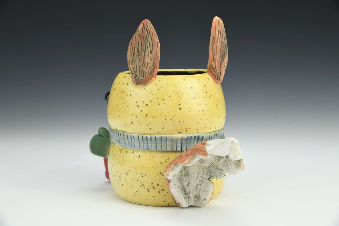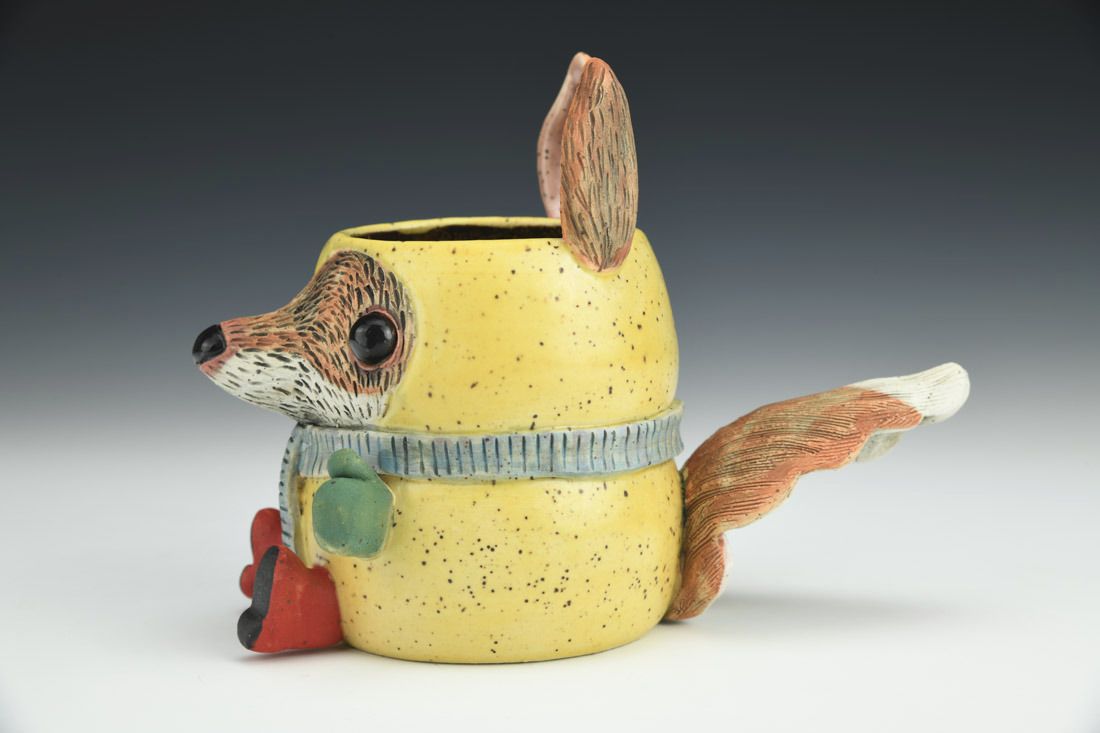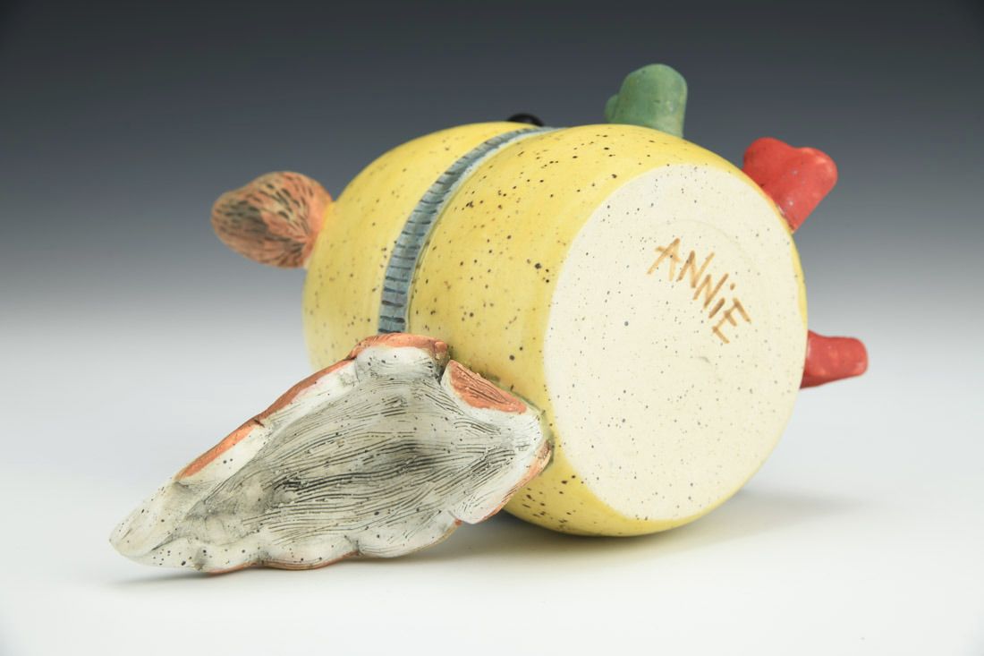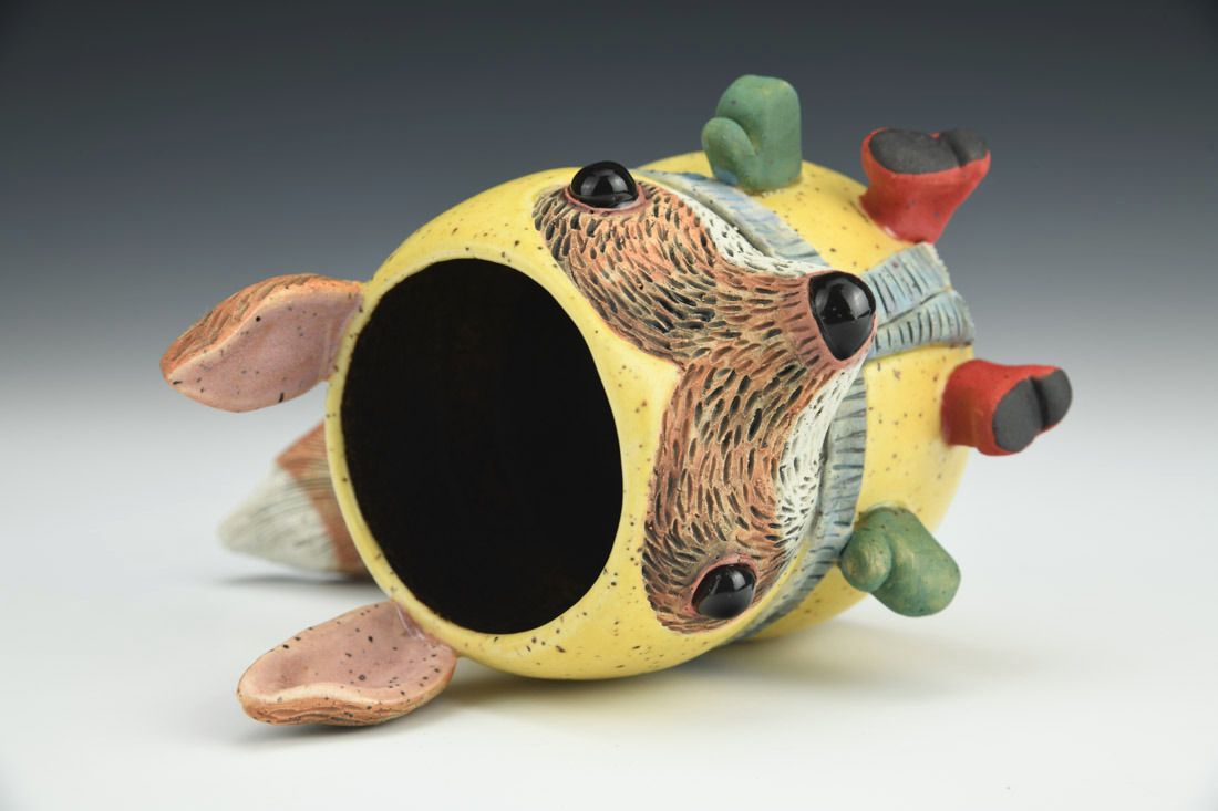 Stoneware, wheel thrown and hand built, underglaze, glaze, electric fired, 5 x 7 x 4 inches.
