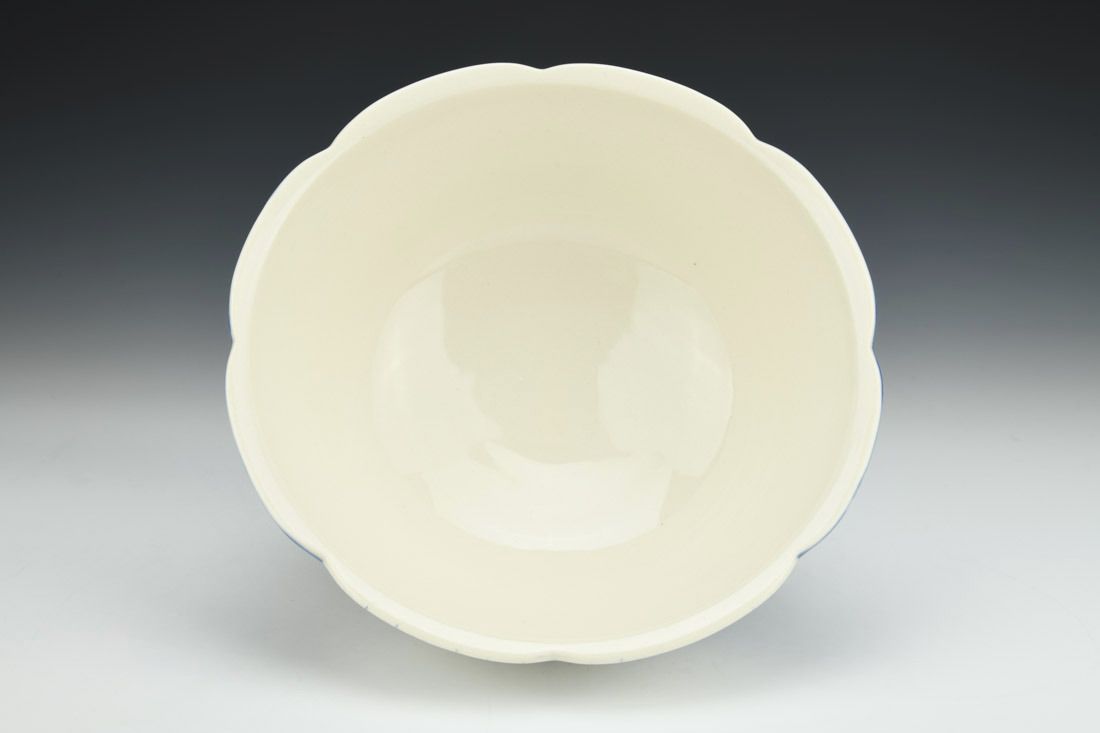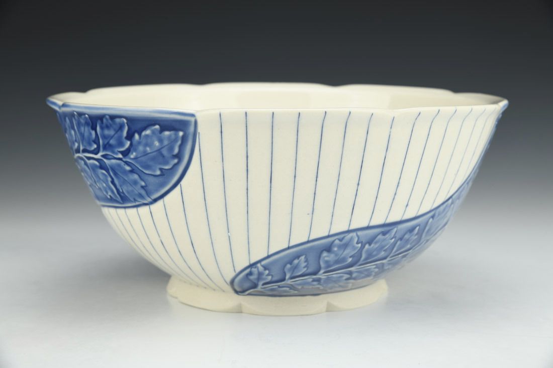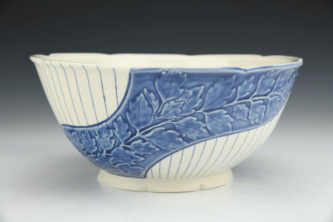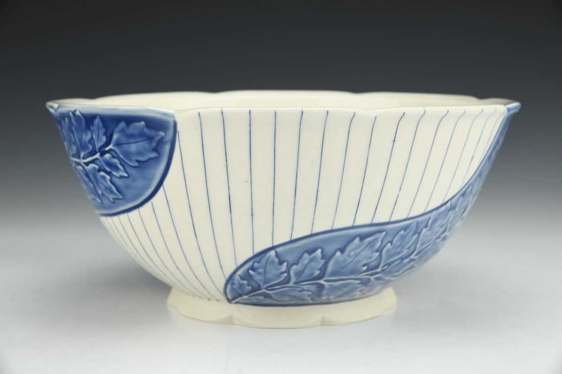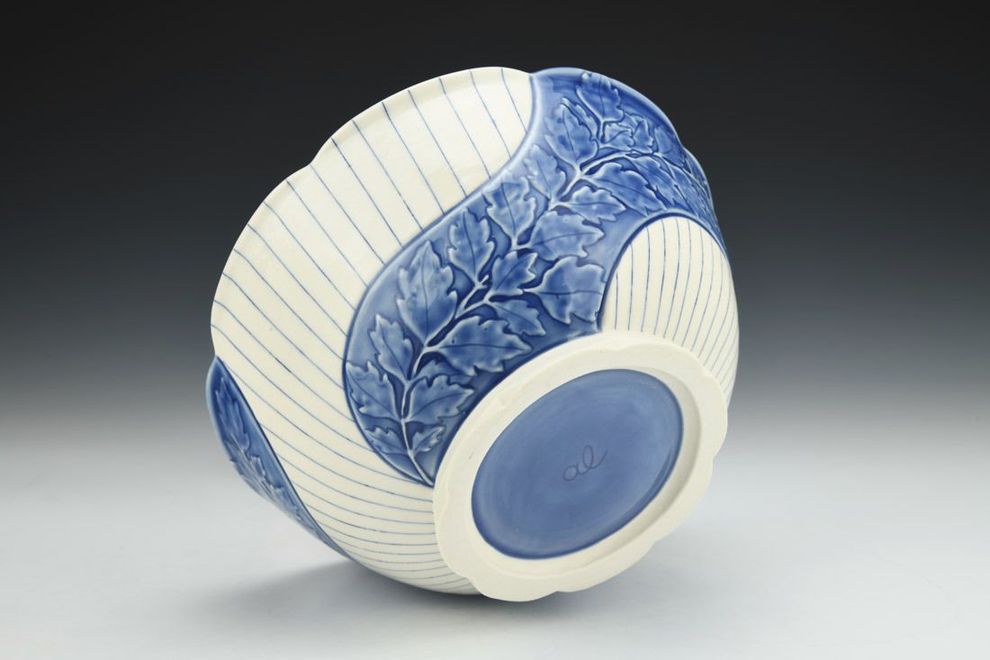 Porcelain, wheel thrown, mishima, slip trailed, slip, underglaze, glaze, cone 6 oxidation fired, 3.75 x 8.75 x 8.75 inches.
