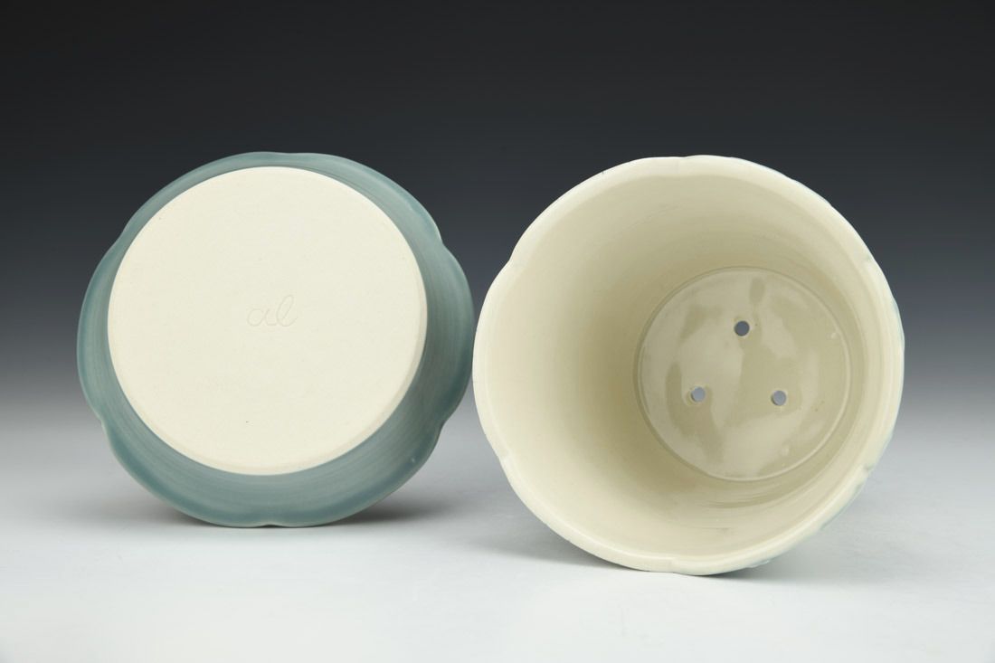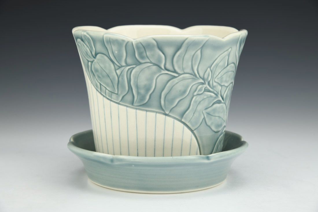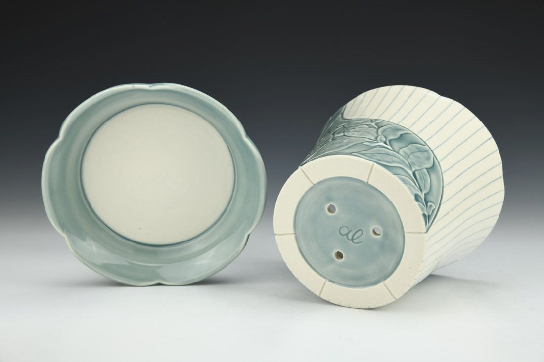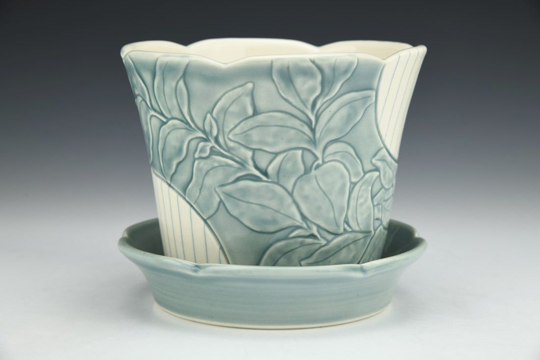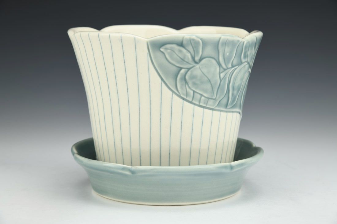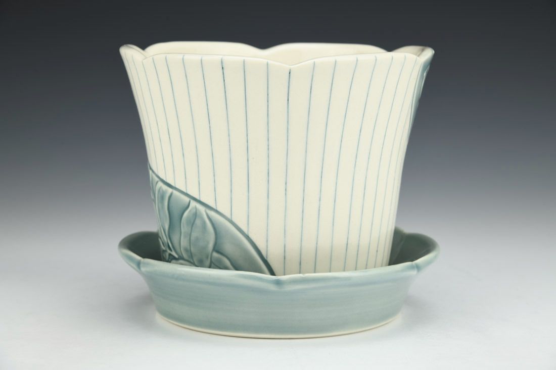 Porcelain, wheel thrown, mishima, slip trailed, slip, underglaze, glaze, cone 6 oxidation fired, 4.75 x 5.75 x 5.75 inches.