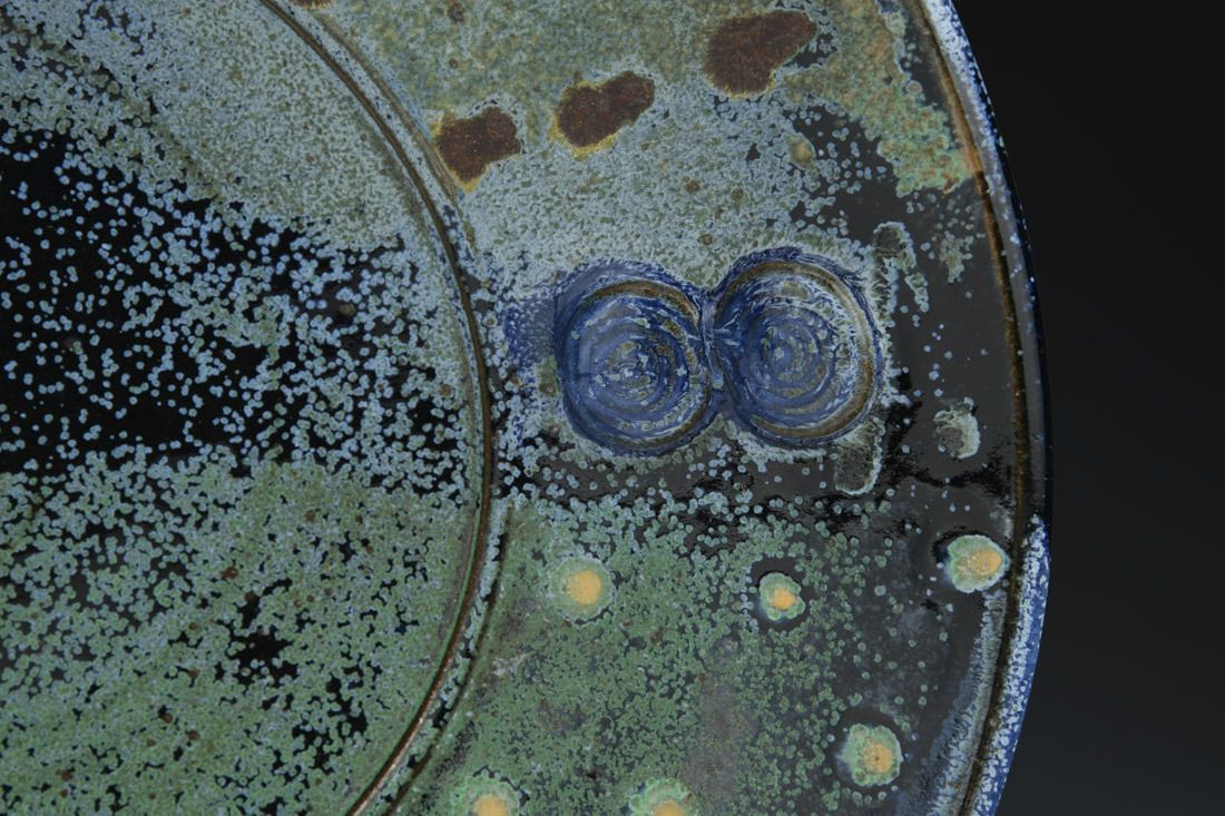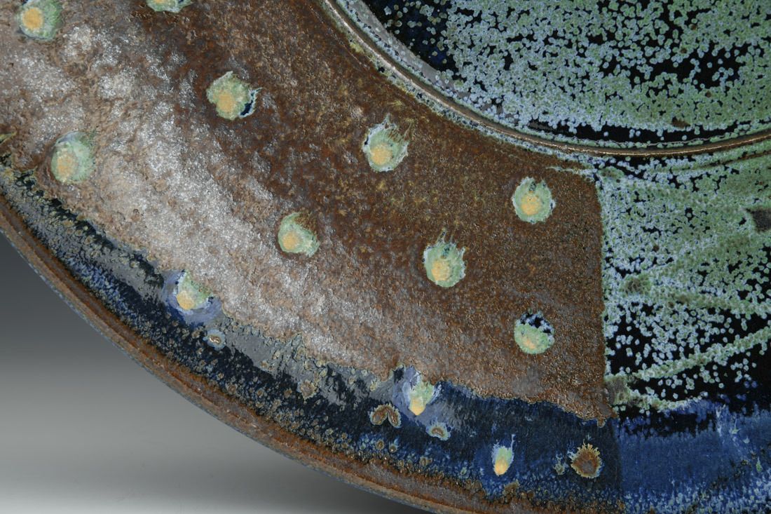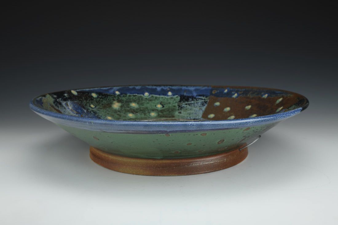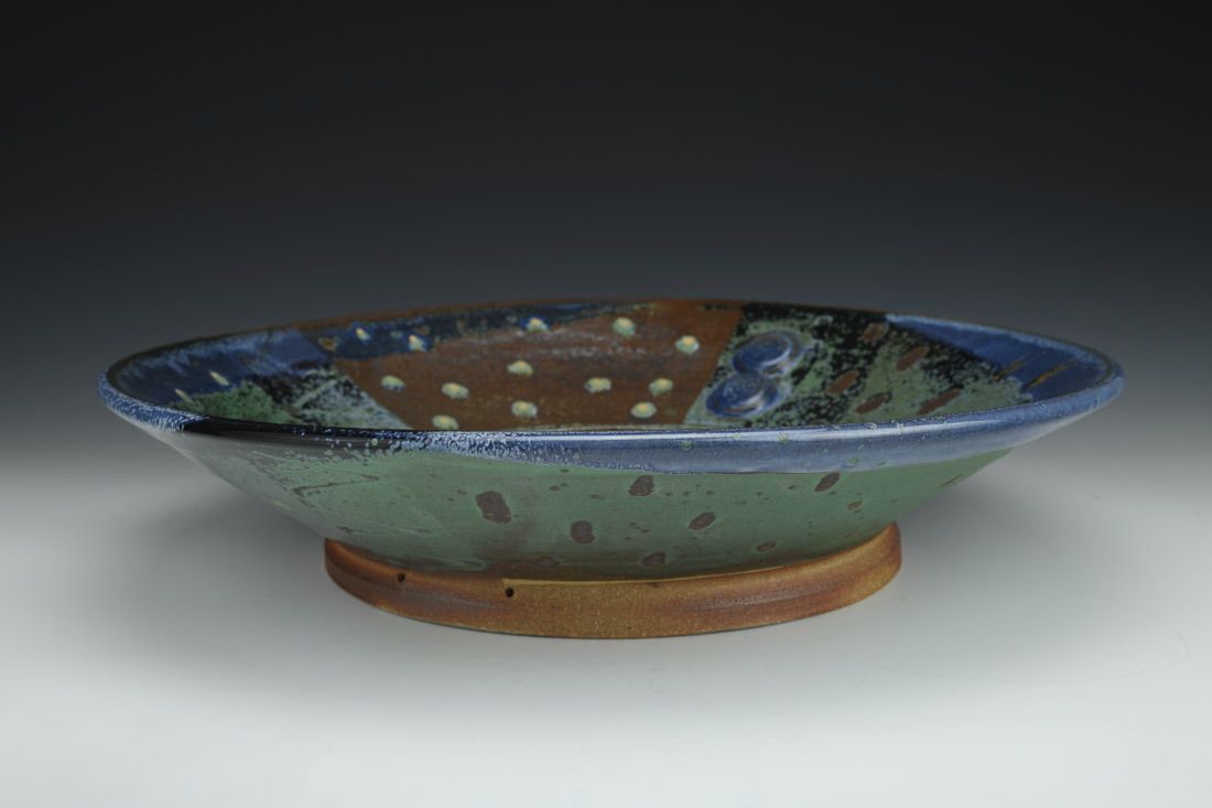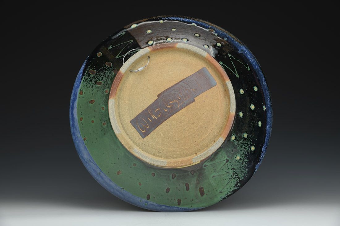 Jersey Wild Stoneware with wire, wheel thrown, soda/wood fired, 4 x 16.5 x 16.5 inches.