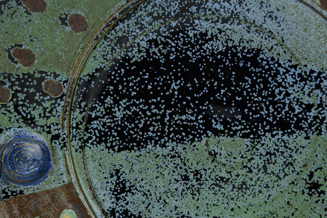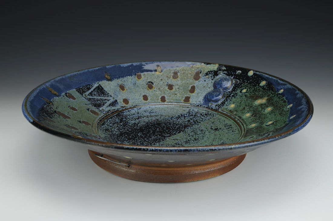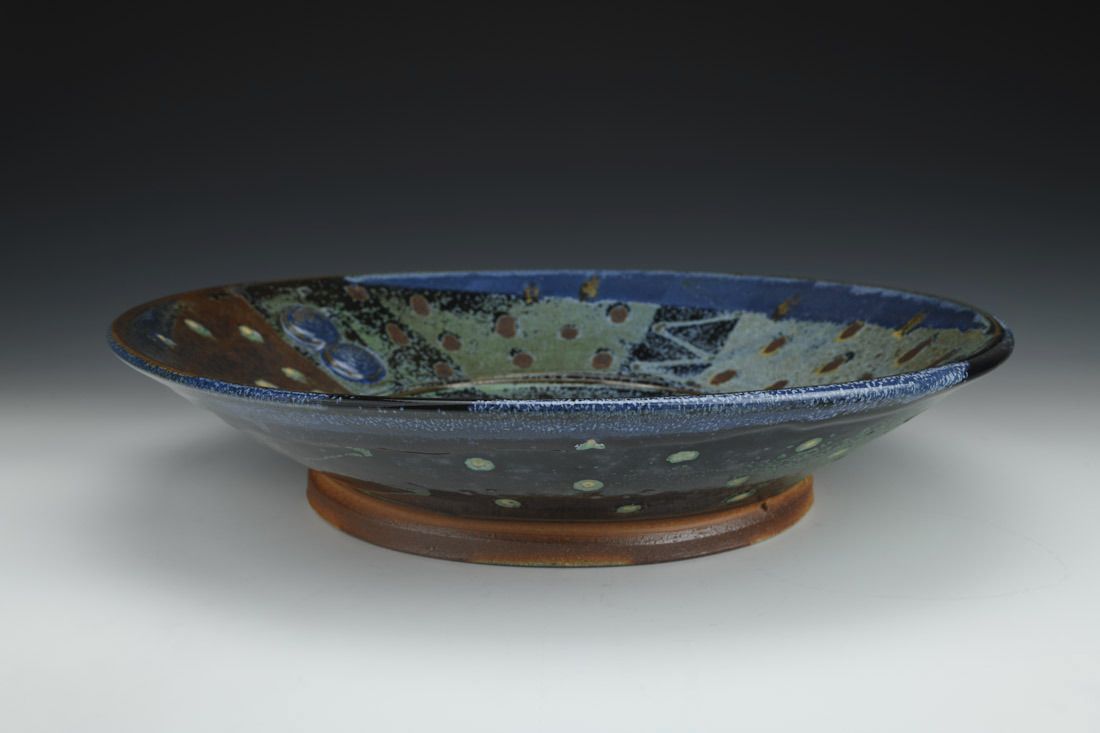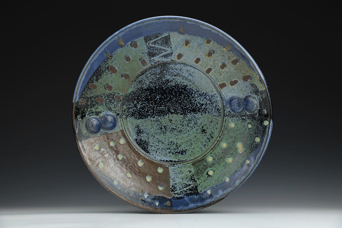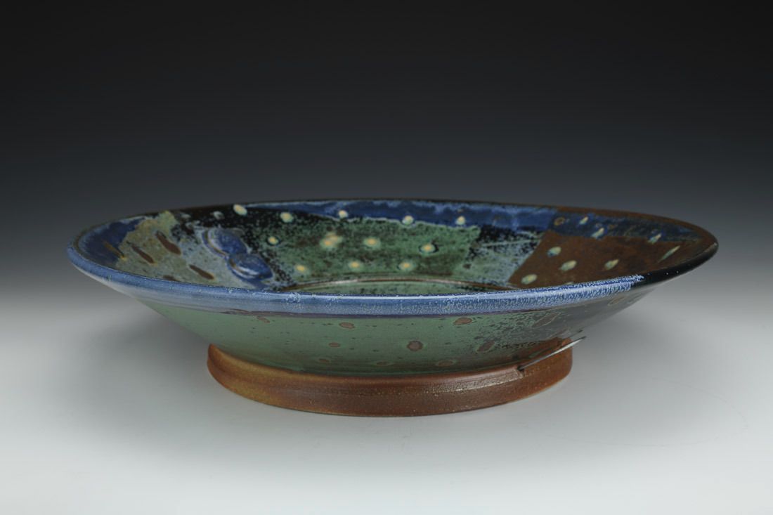 Jersey Wild Stoneware with wire, wheel thrown, soda/wood fired, 4 x 16.5 x 16.5 inches.