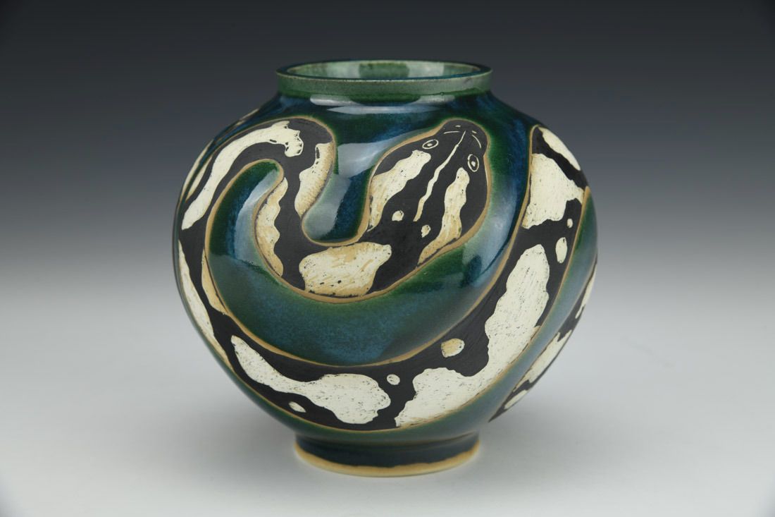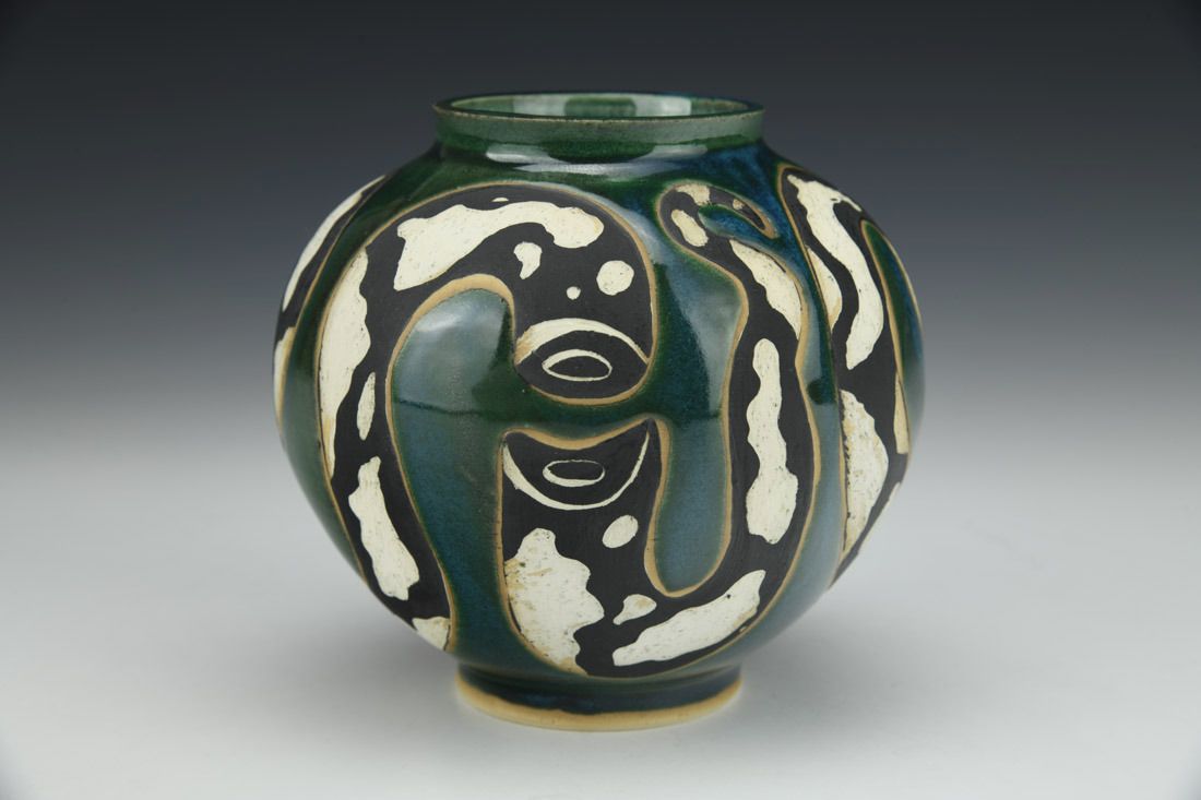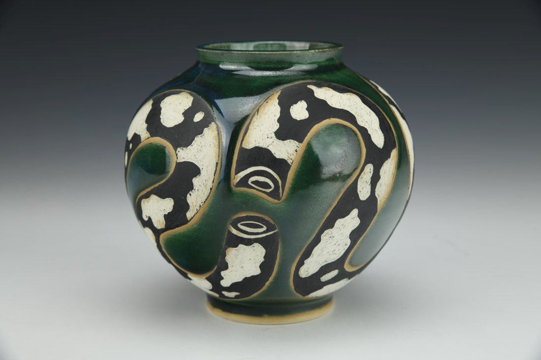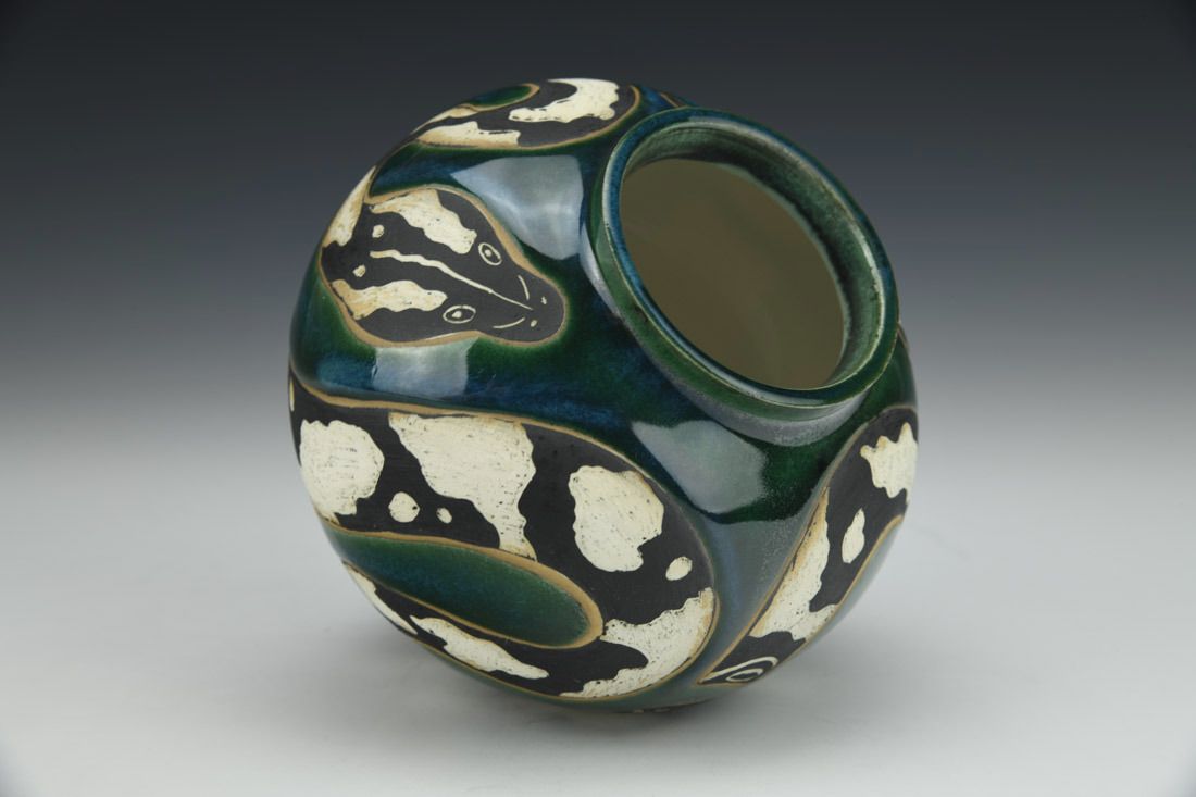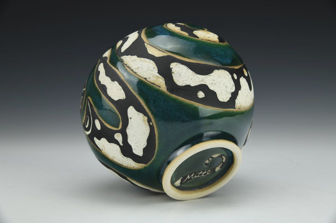 B-mix, wheel thrown, underglaze, cone 5 oxidation fired, 4.5 x 5 x 5 inches.