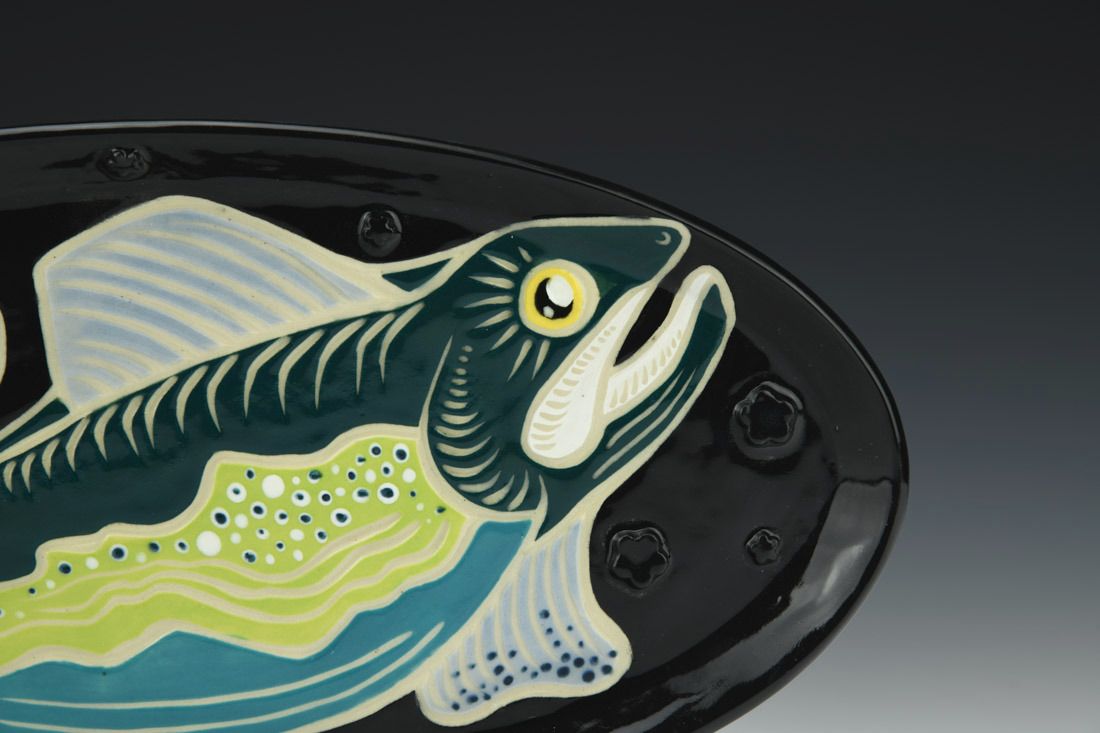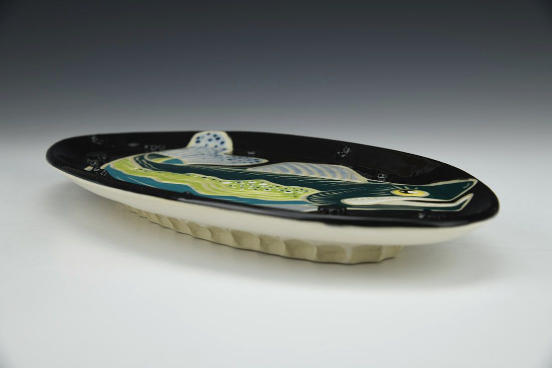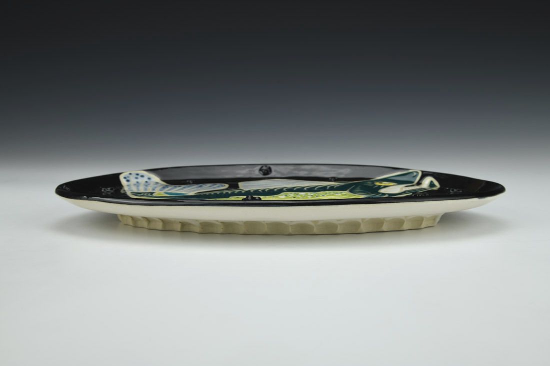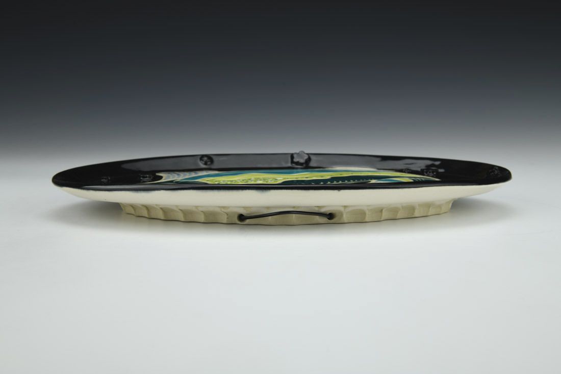 B-mix with hanging wire, hand built with slabs, underglaze, cone 5 oxidation fired, 1 x 11 x 5.75 inches.