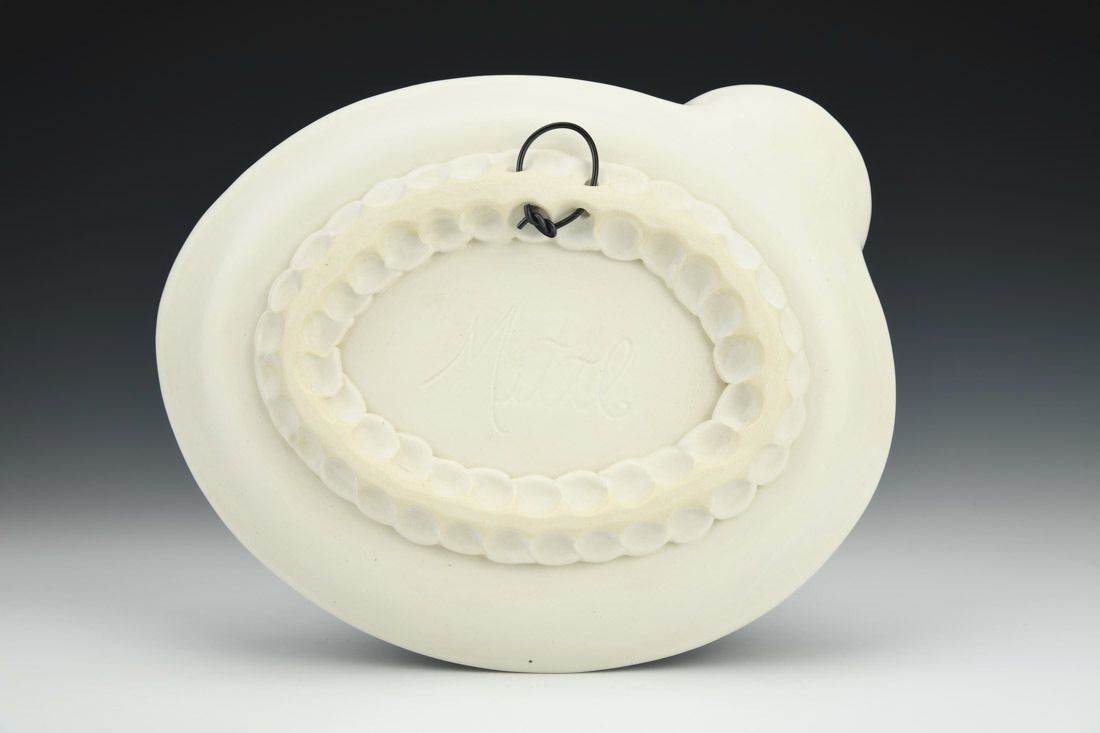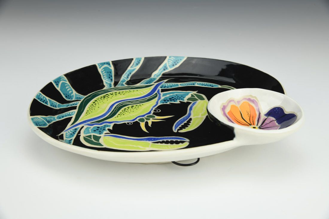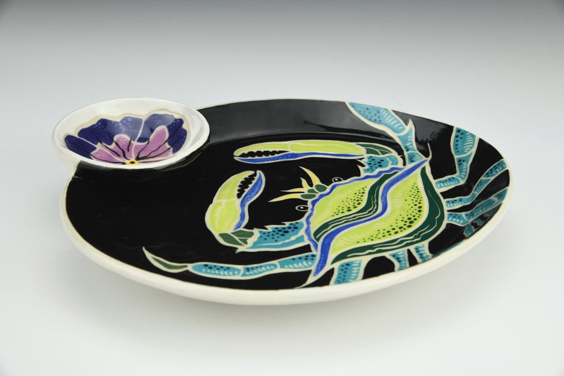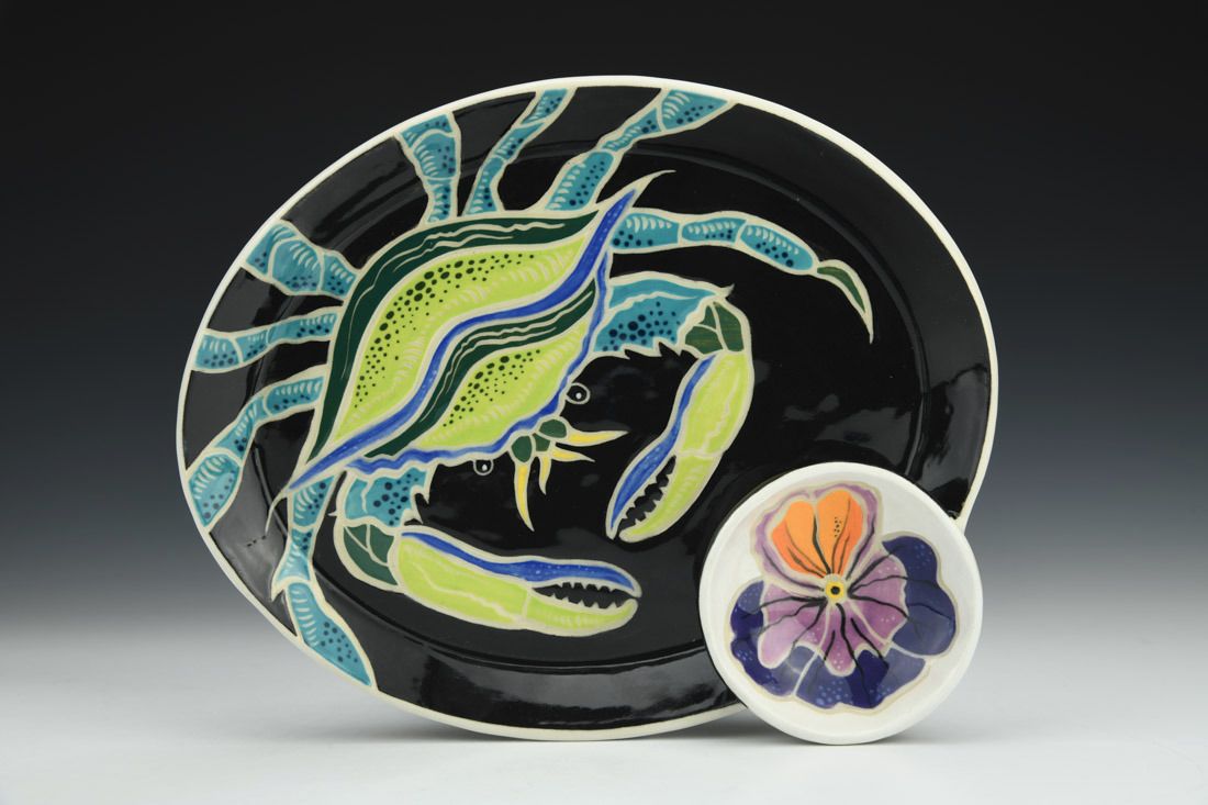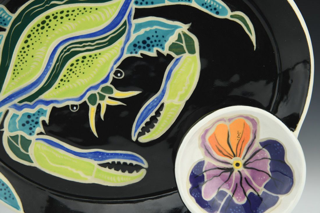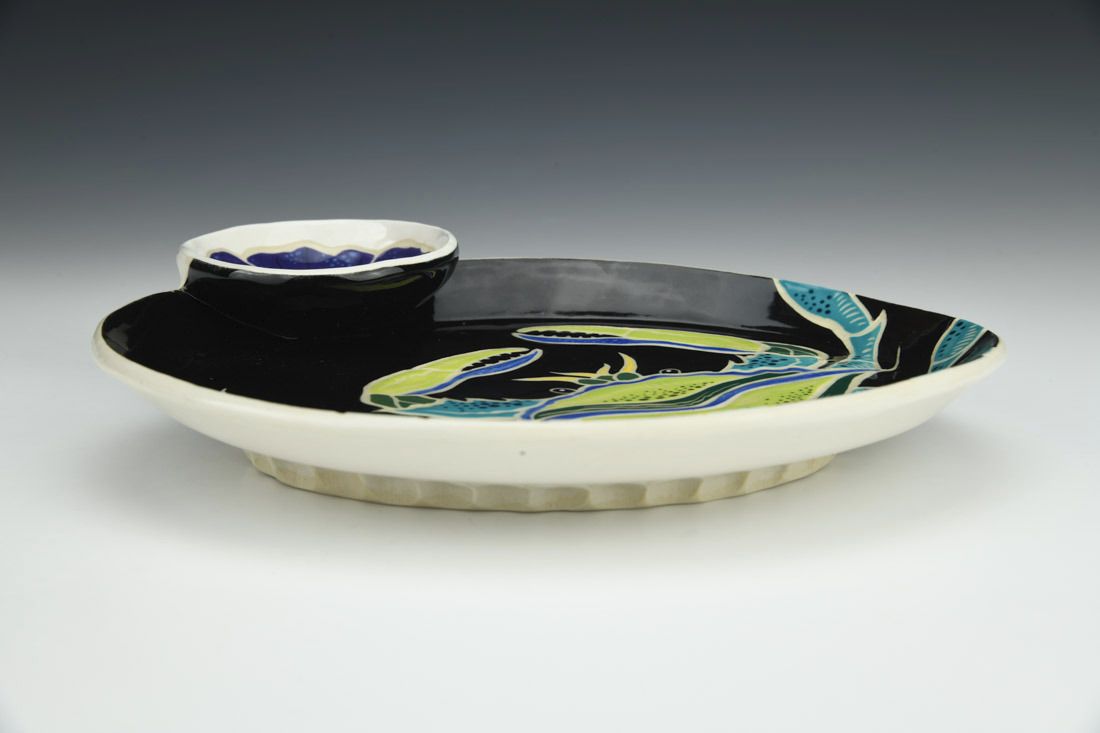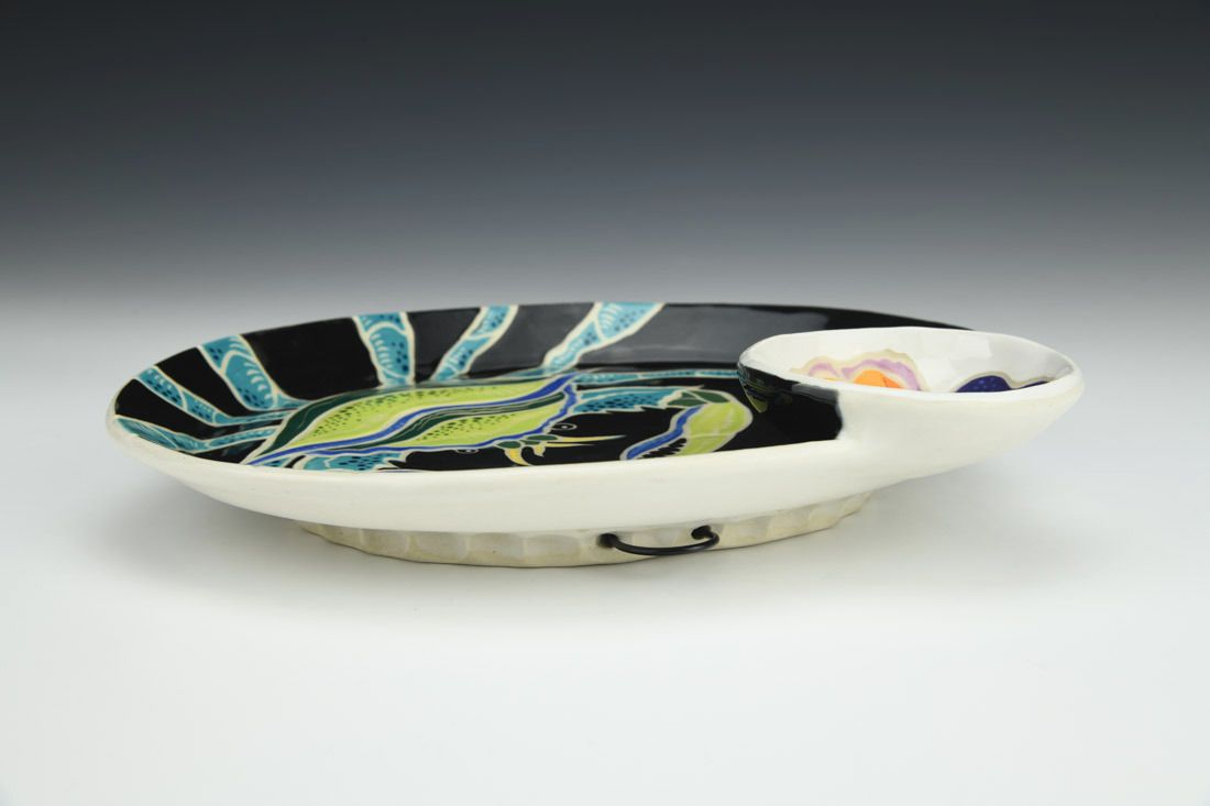B-Mix, wheel thrown, sgraffito, underglazes, glaze, cone 5 electric fired, 1.75 x 7.5 x 9 inches.