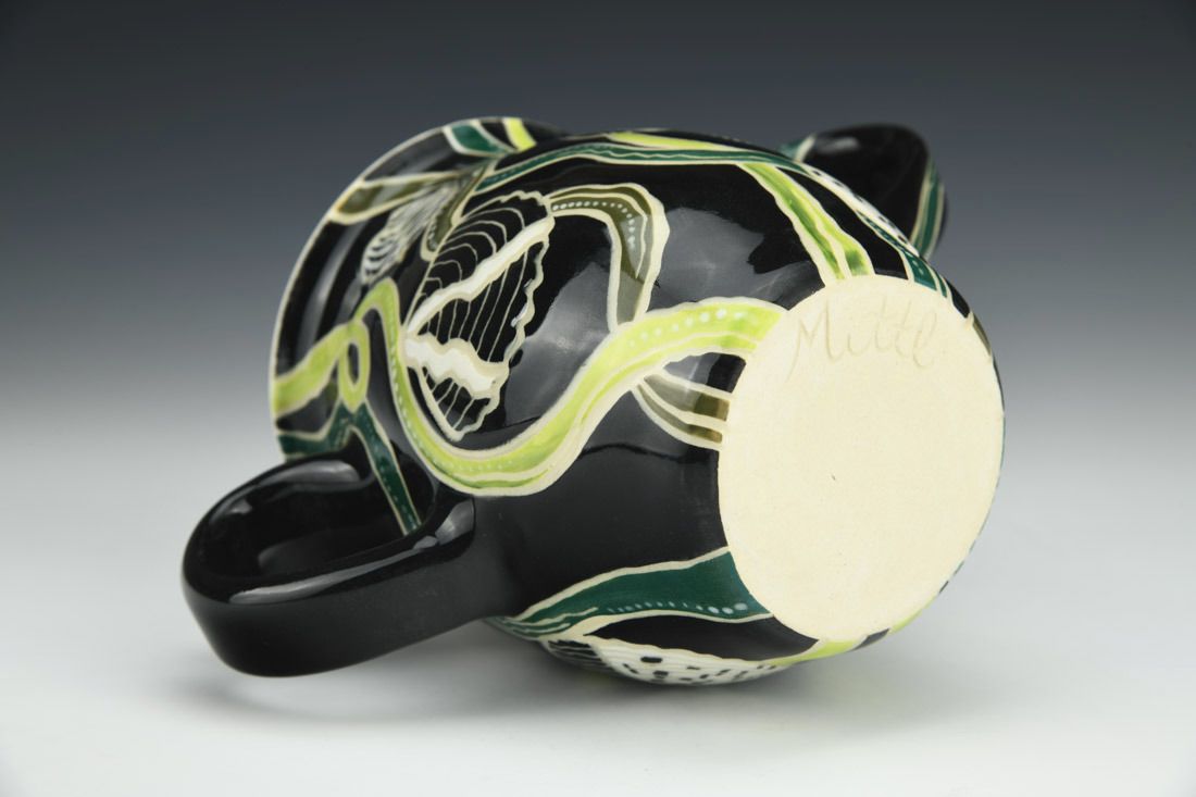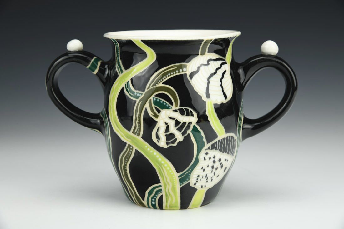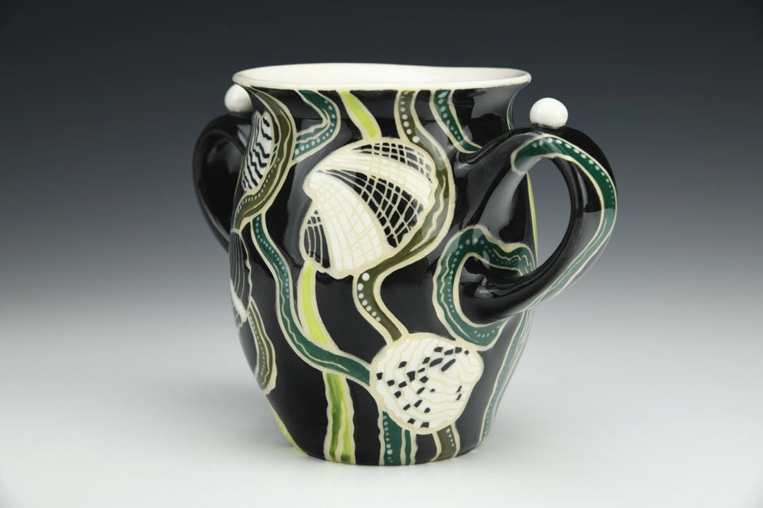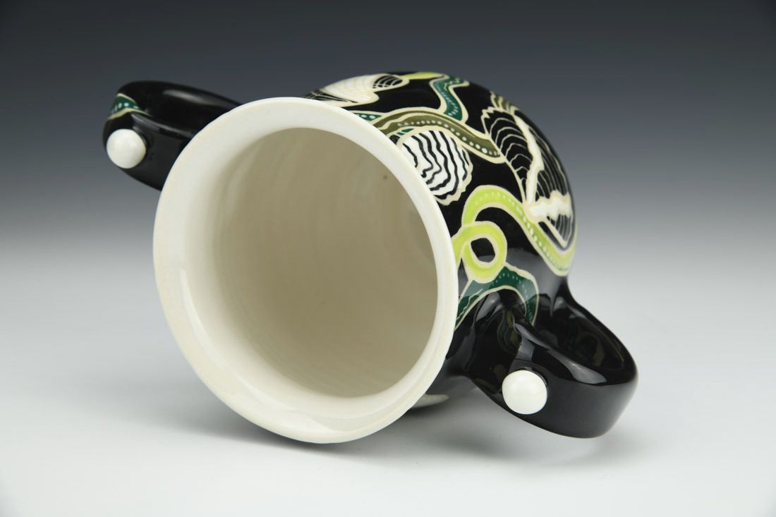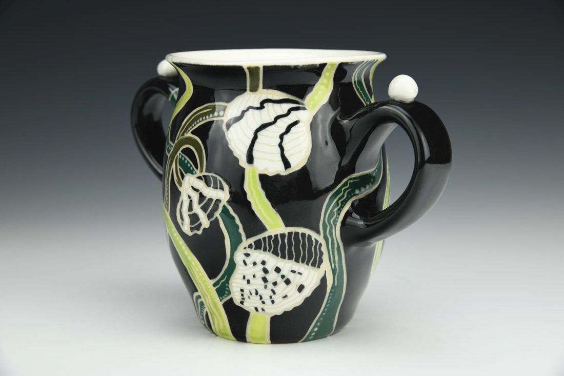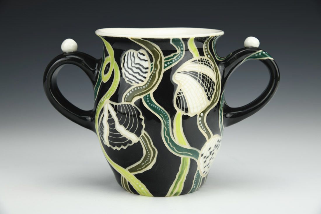 B-Mix, wheel thrown, sgraffito, underglazes, glaze, cone 5 electric fired, 4.75 x 7 x 3.5 inches.