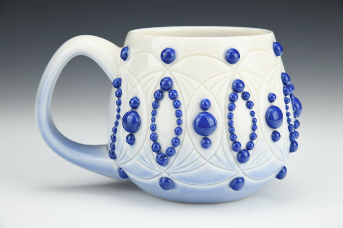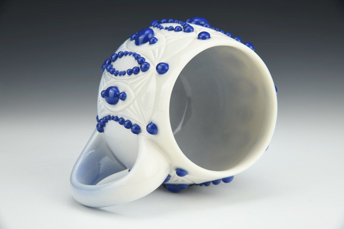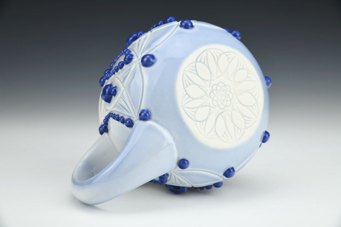 Porcelain, slipcast, hand carved, slip trailed, cone 6 electric fired, 3.75 x 6 x 4.5 inches.