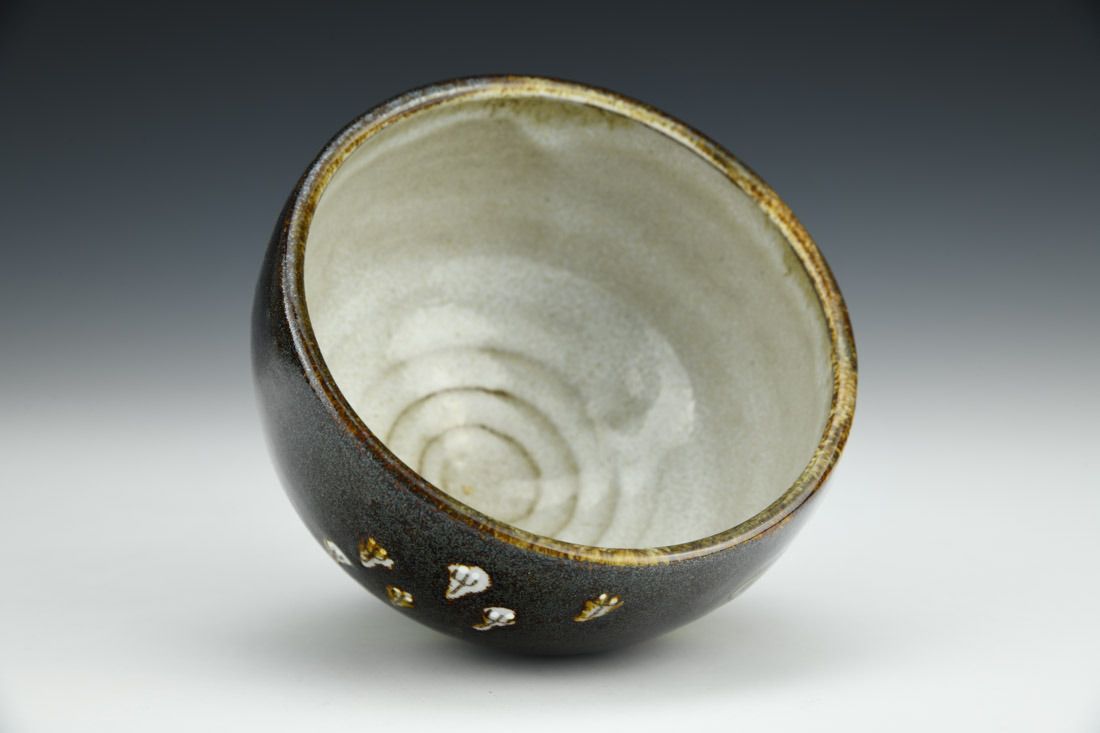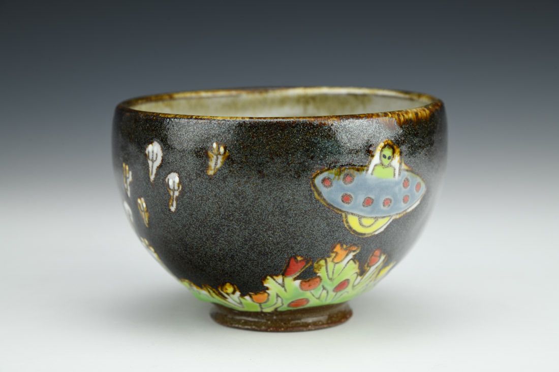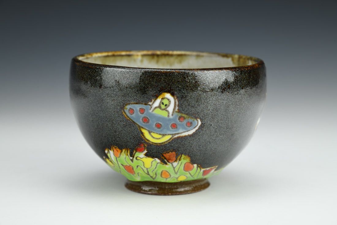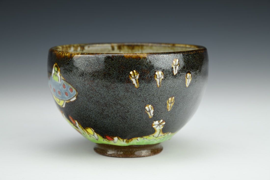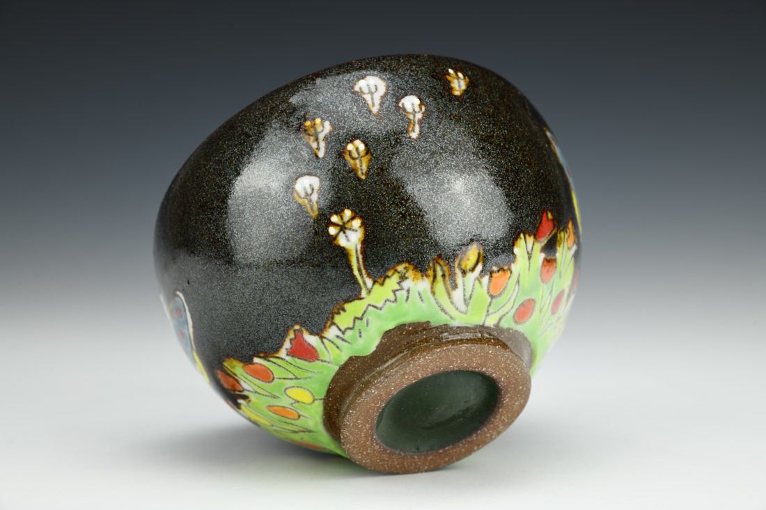 Red stoneware, wheel thrown, porcelain slip, underglaze, cone 6 oxidation fired, 2.75 x 4 x 4 inches.