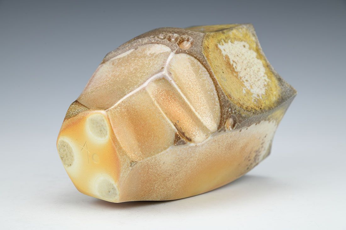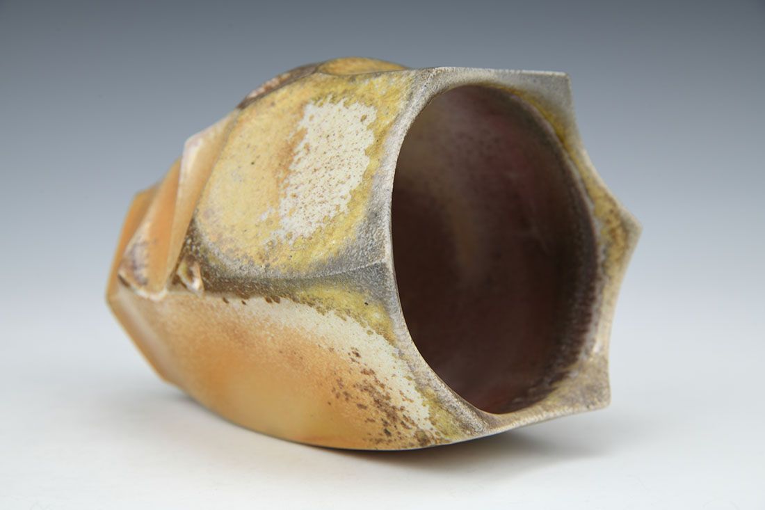Porcelain with grog, wheel thrown and altered, shino liner glaze, cone 10 reduction woodfired, 4.75 x 3.5 x 3.75 inches.