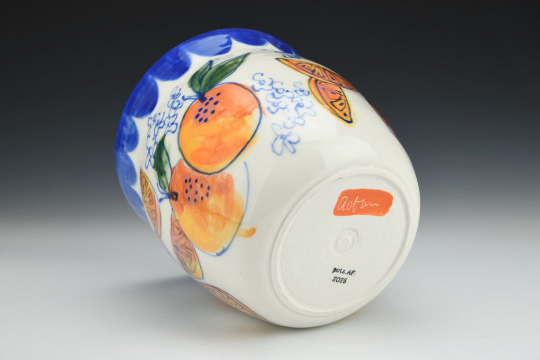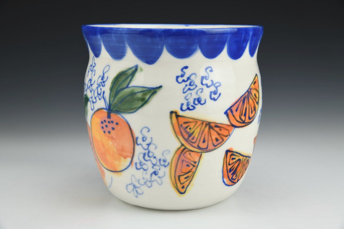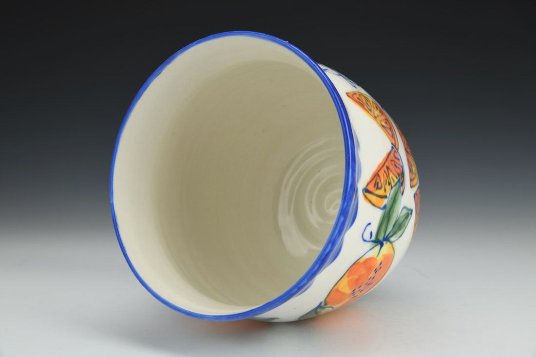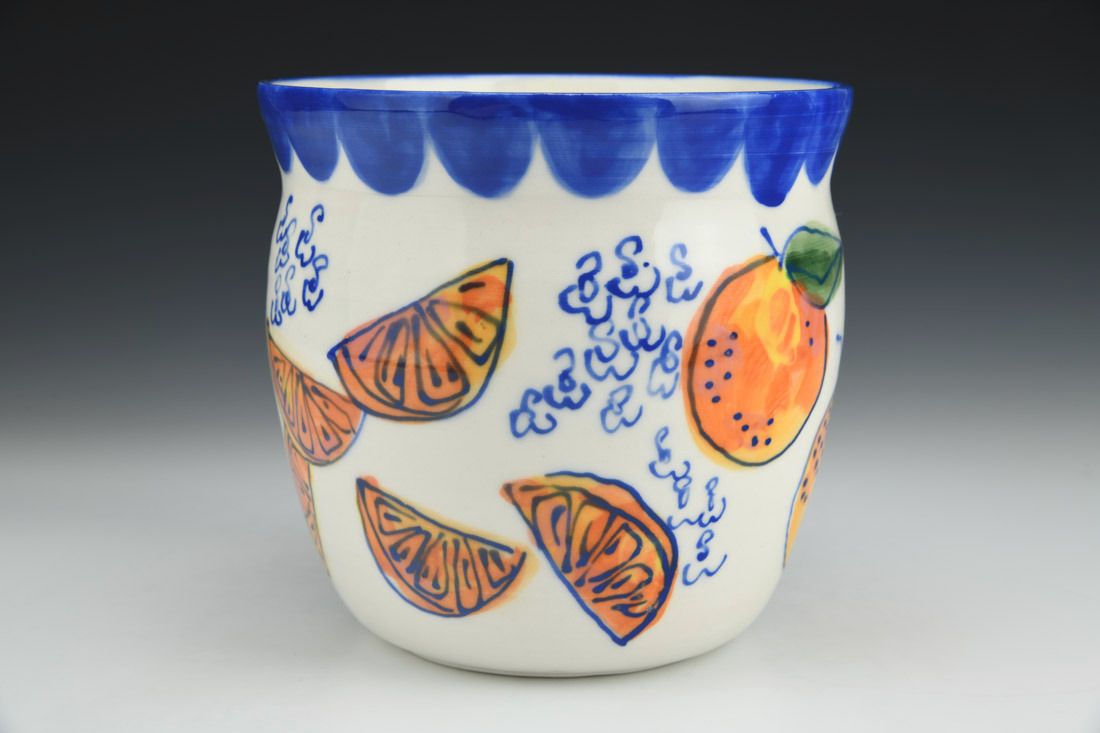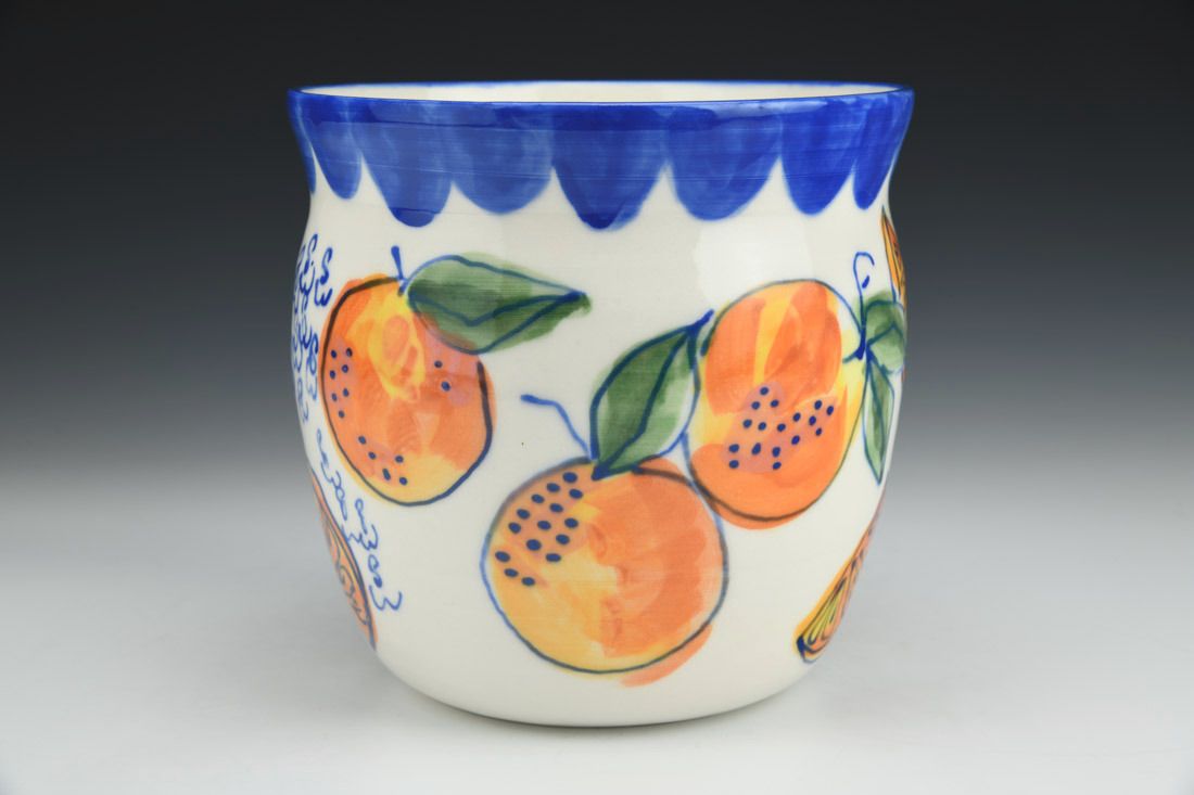 Porcelain, wheel thrown, hand painted, cone 6 oxidation fired, 6.5 x 6.75 x 6.5 inches.