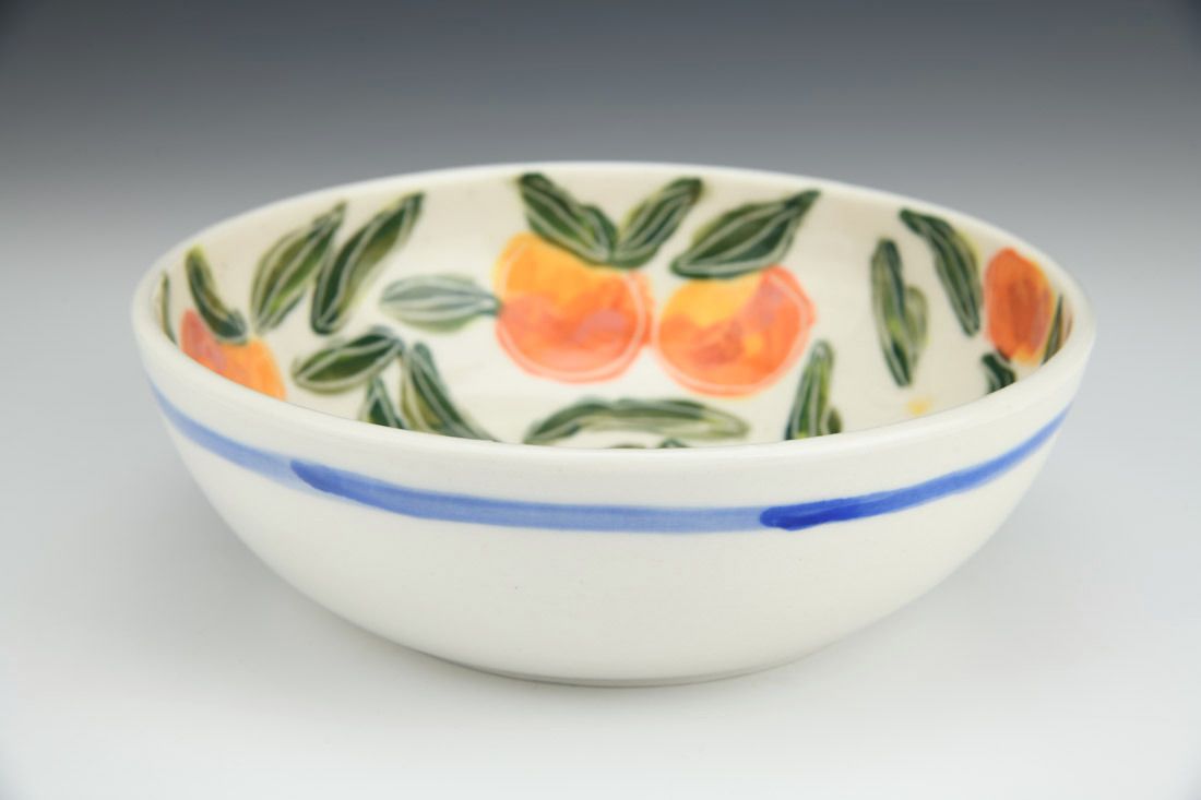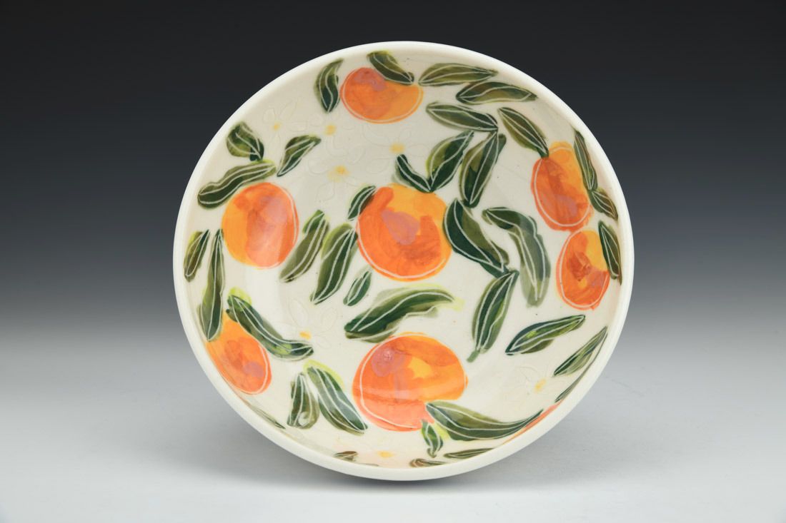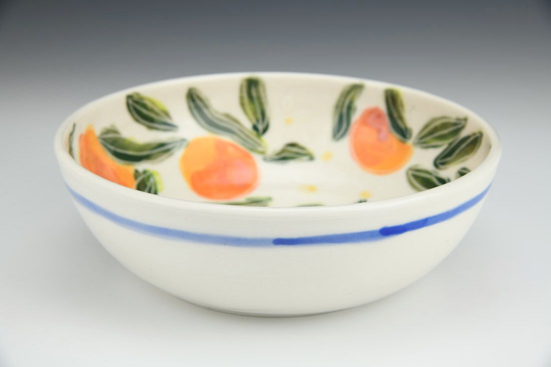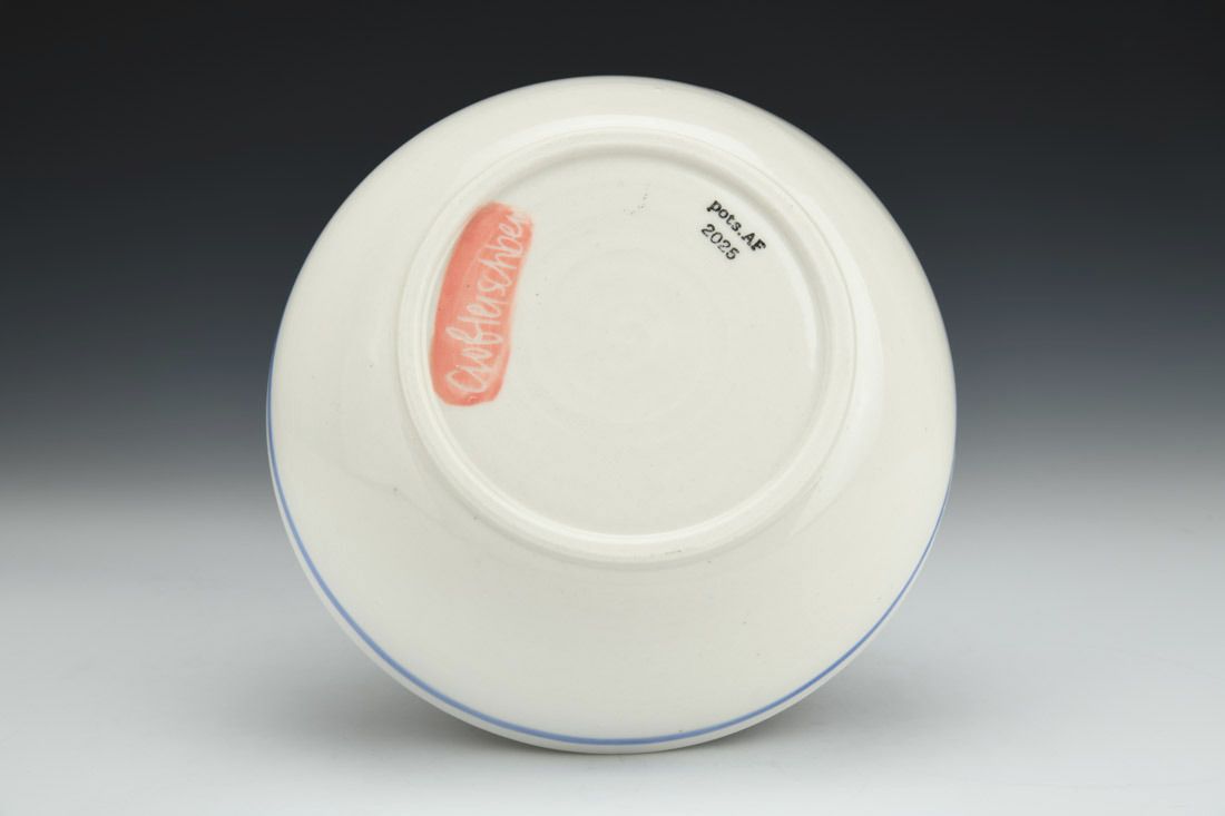 Porcelain, wheel thrown, hand painted, cone 6 oxidation fired, 2.5 x 7.5 x 7.5 inches.