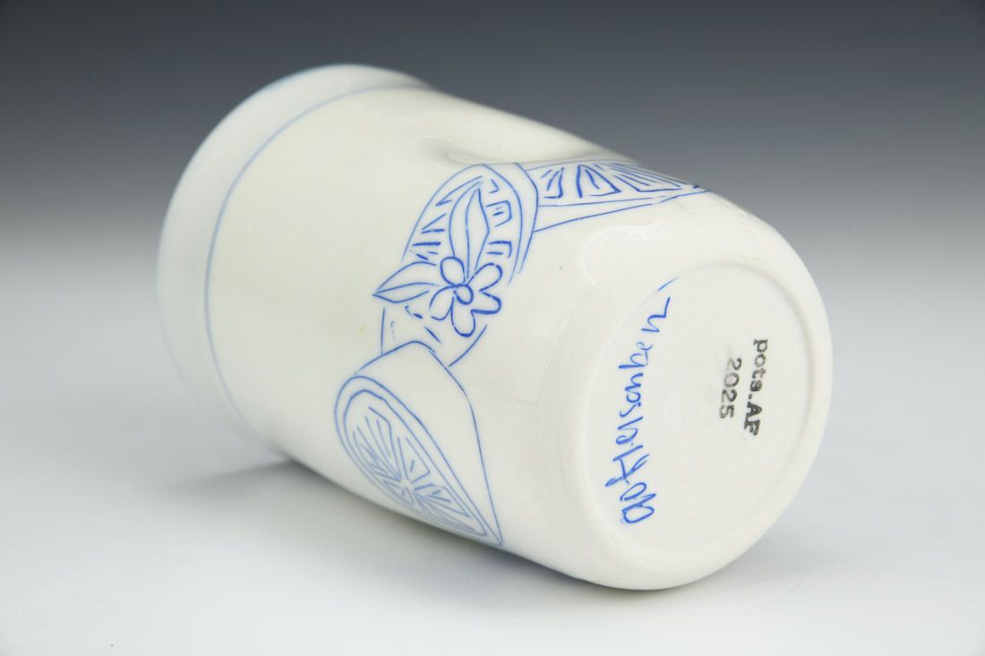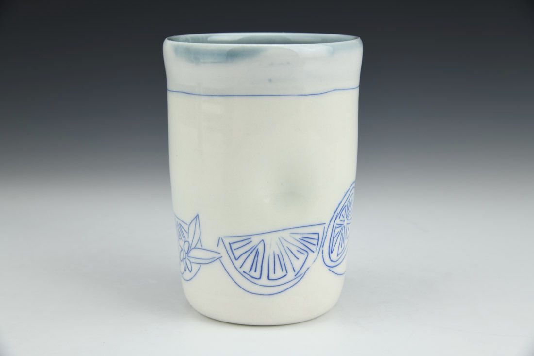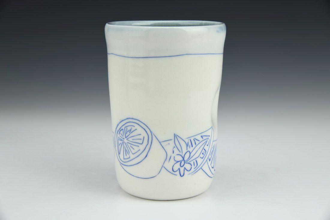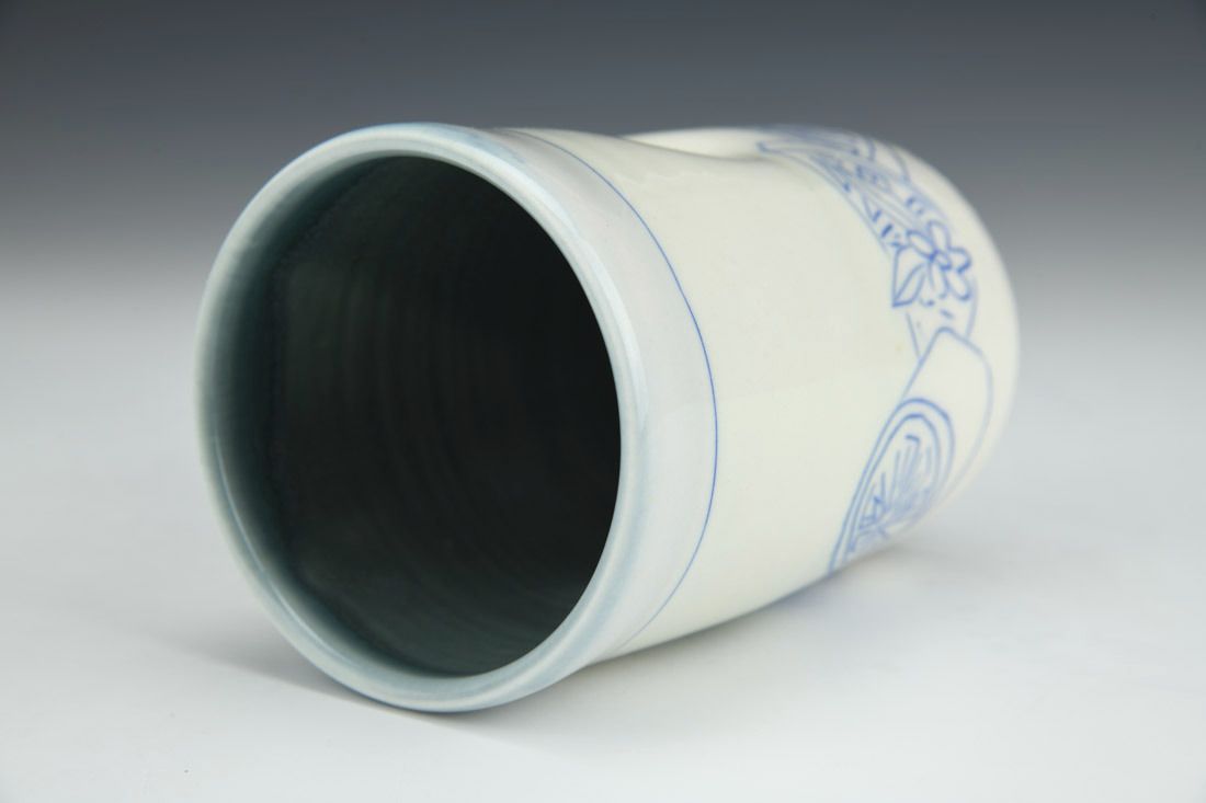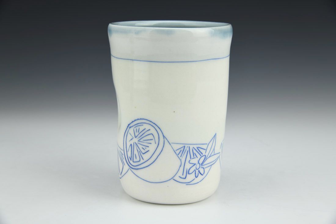 Porcelain, wheel thrown, hand inlaid, cone 6 oxidation fired, 4.75 x 3.5 x 3.5 inches.