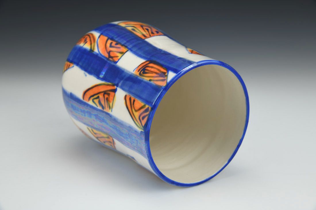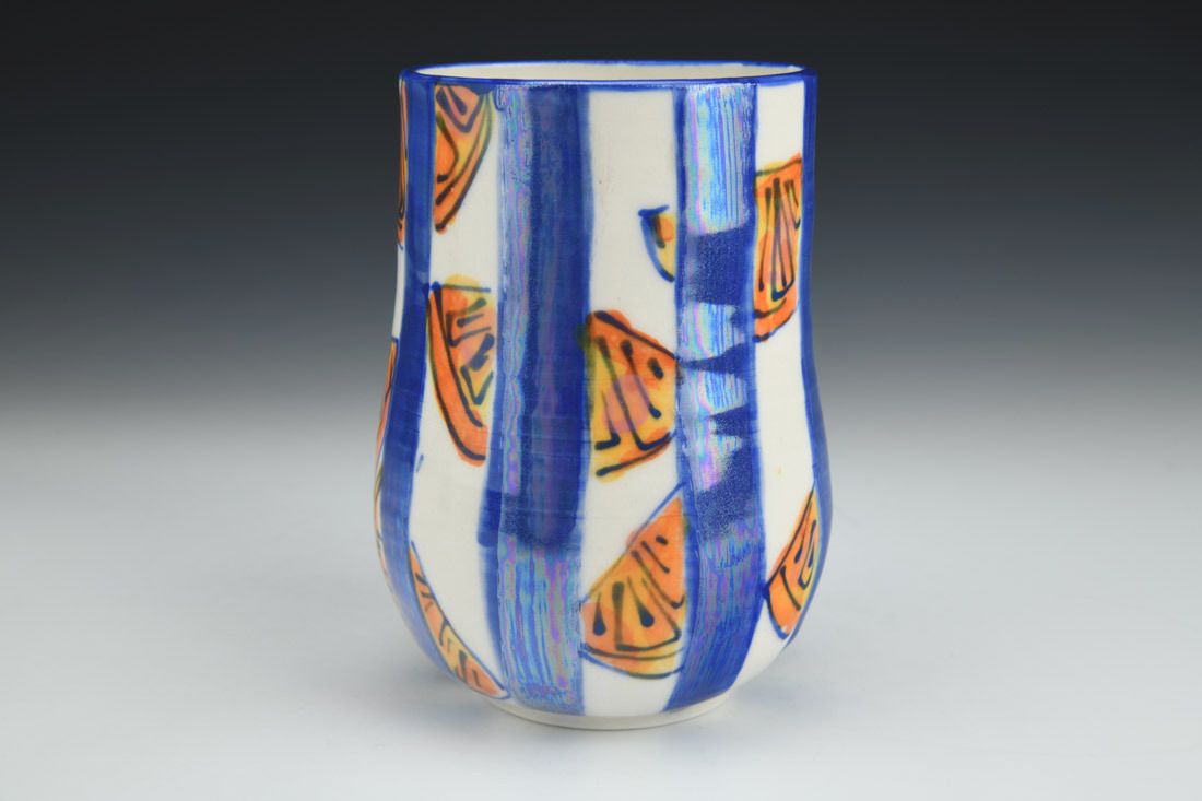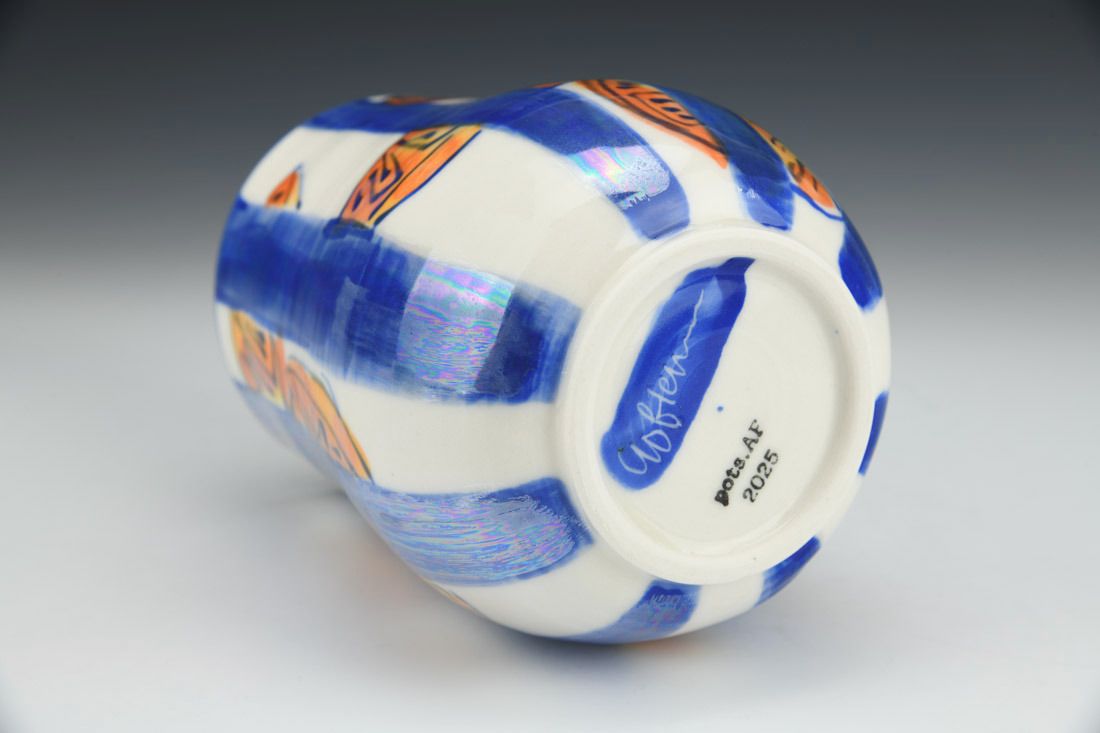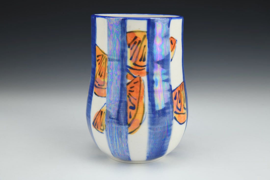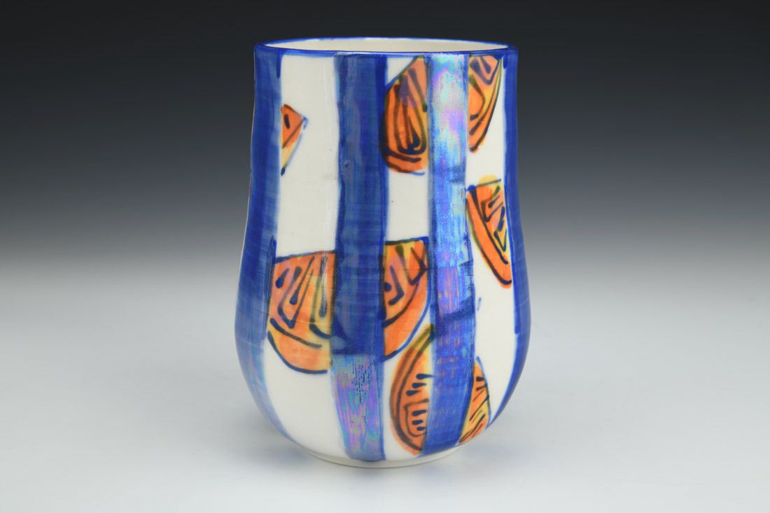 Porcelain, wheel thrown, hand painted, mother of pearl luster, cone 6 oxidation fired, 6.25 x 4.25 x 4.25 inches.