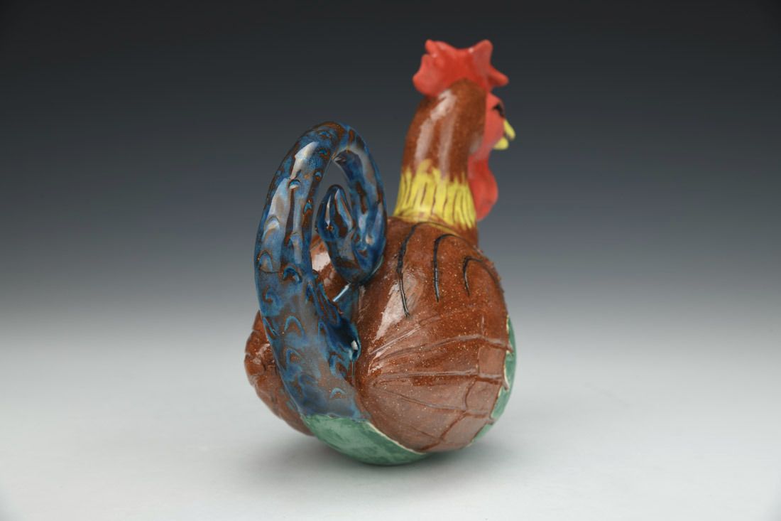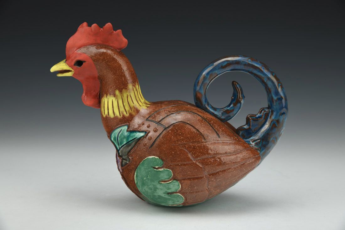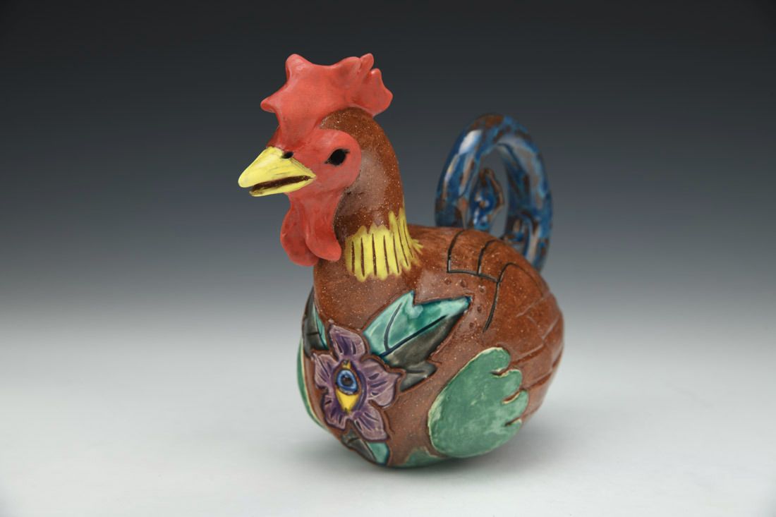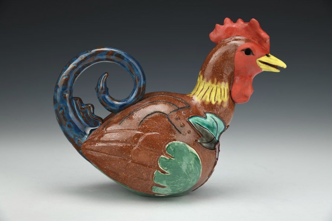 Red earthenware, hand built, slip trailed, engobe, underglaze, glaze, cone 04 electric fired, 5.5 x 7.25 x 3.25 inches.