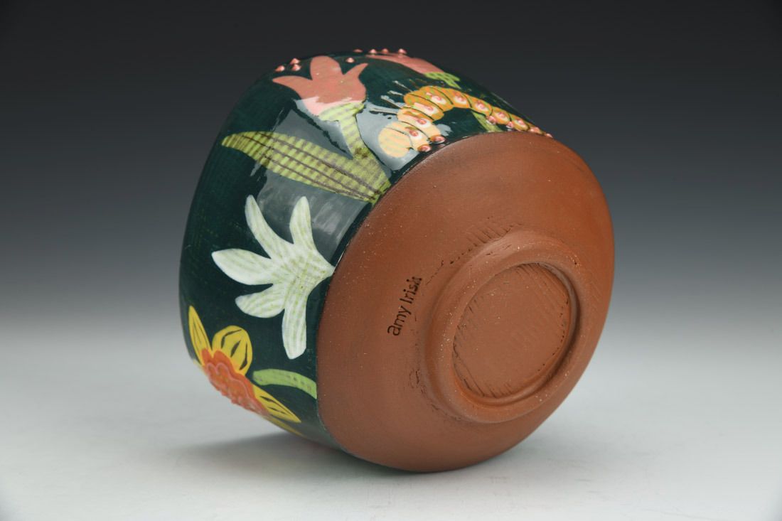 Red earthenware, wheel thrown and hand built, slip, underglaze, terra sigillata, cone 1 oxidation fired, 3.75 x 5.25 x 5.25 inches.