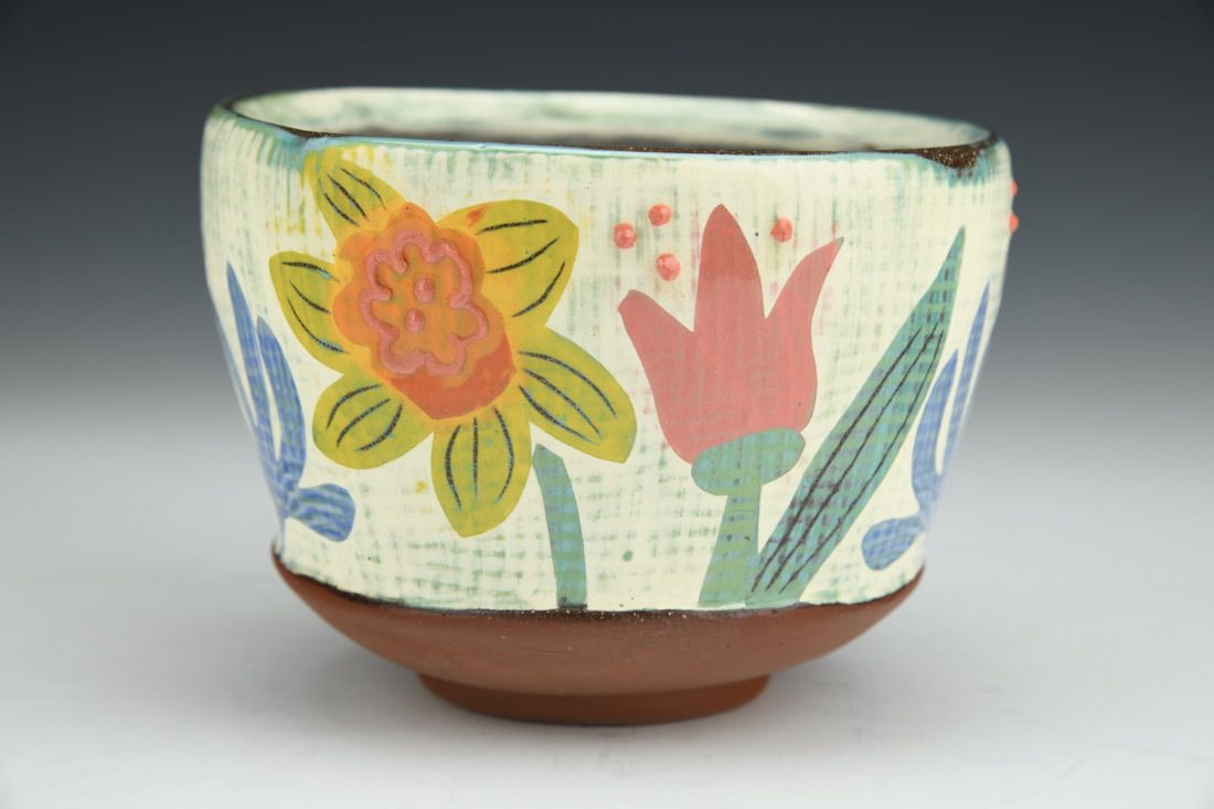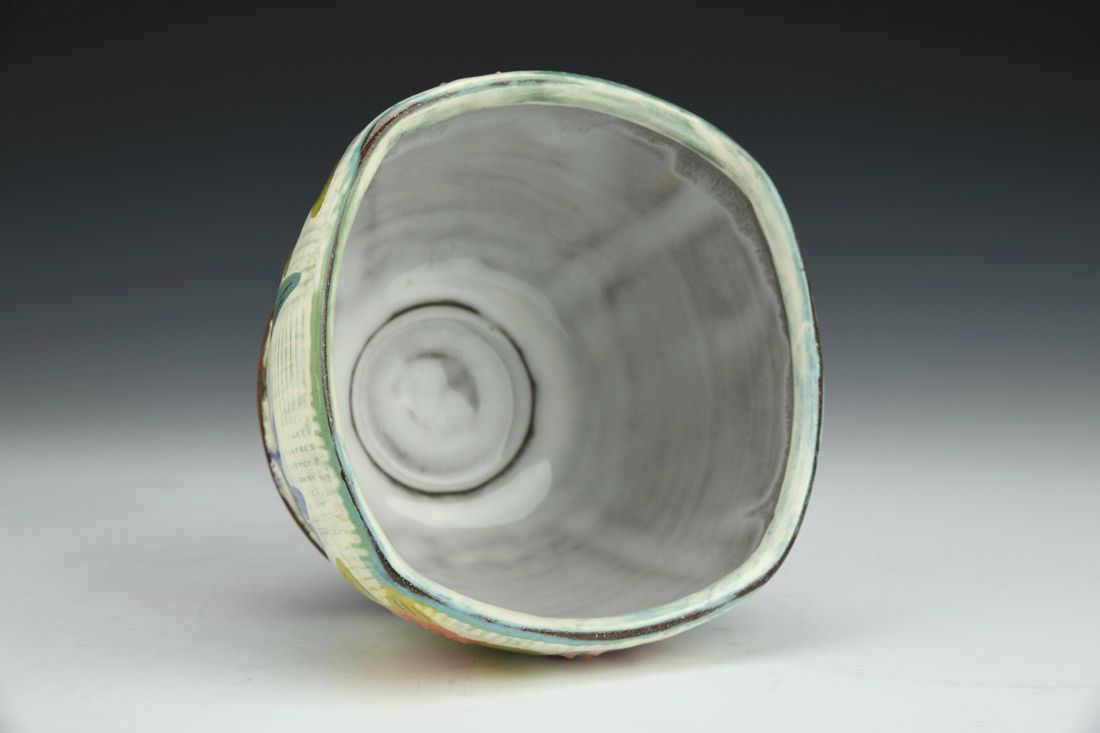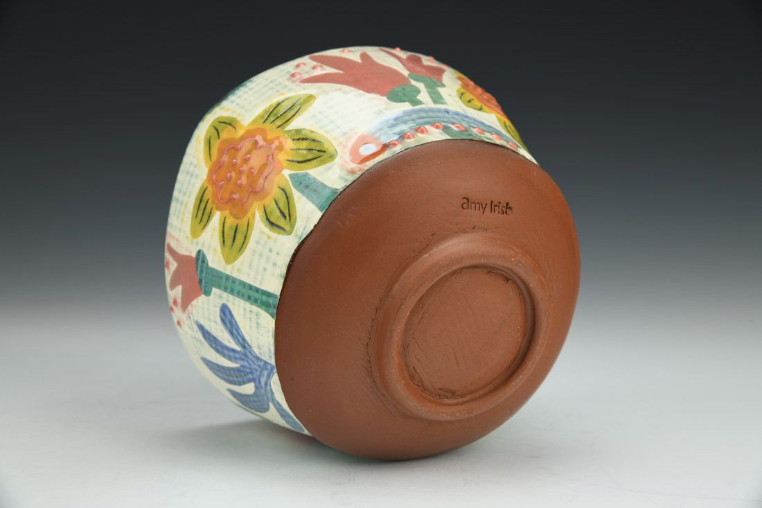 Red earthenware, wheel thrown and hand built, slip, underglaze, terra sigillata, cone 1 oxidation fired, 3.75 x 5.25 x 5.25 inches.