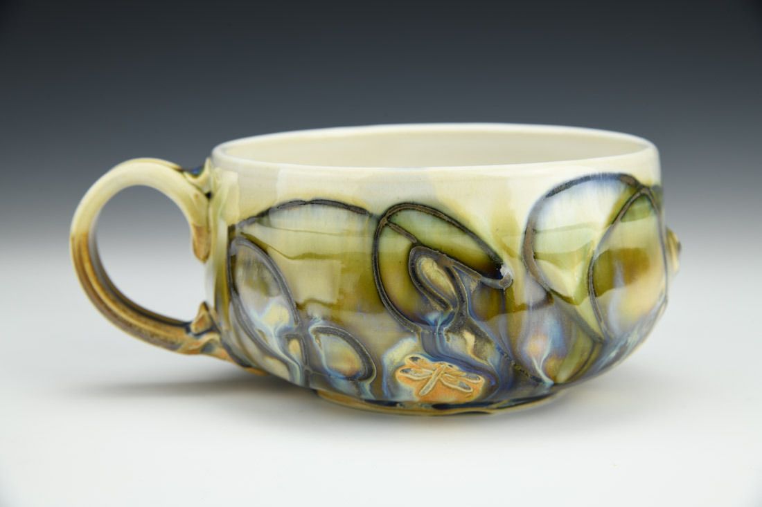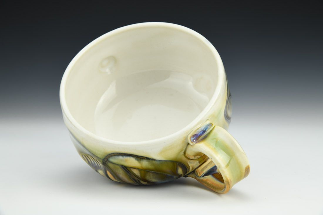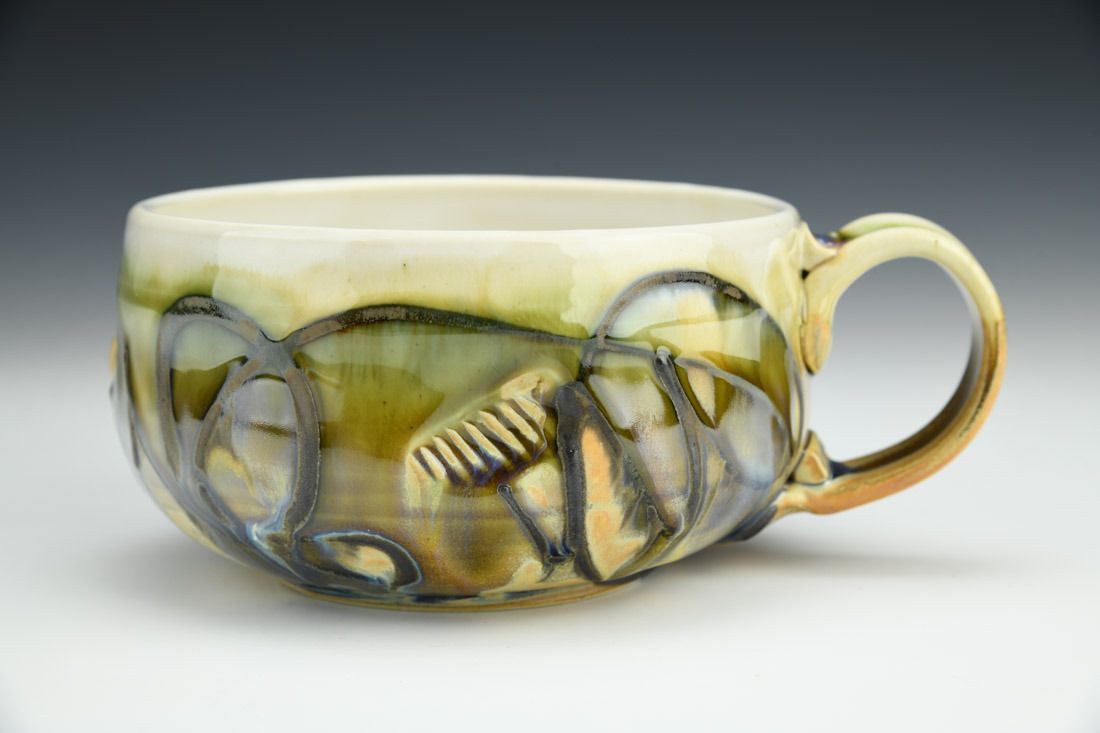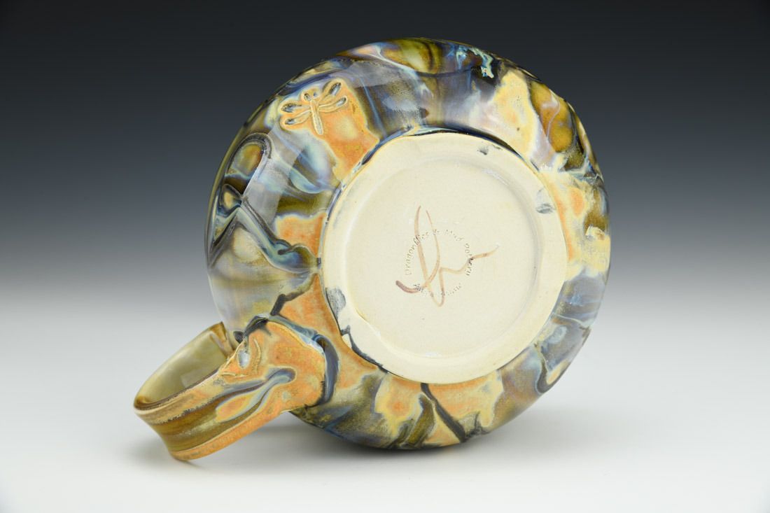 Stoneware, wheel thrown, slip trailed, stamped, black slip, multiple layered glazes, cone 6 oxidation fired, 2.75 x 7 x 5.5 inches.
