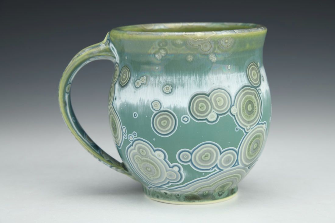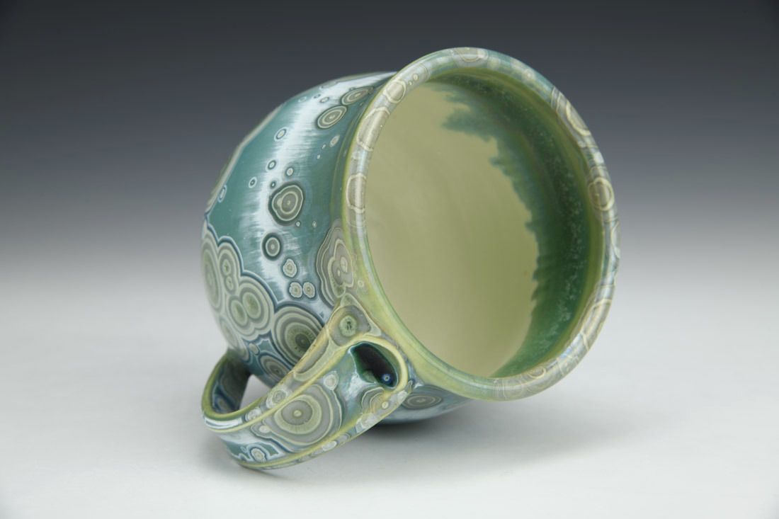 Grolleg porcelain, wheel thrown with pulled handle, oxide wash, crystalline glaze, acid etched, cone 10 crystalline fired, 4 x 5 x 3.5 inches.