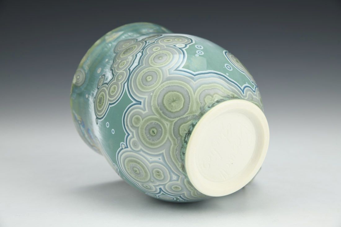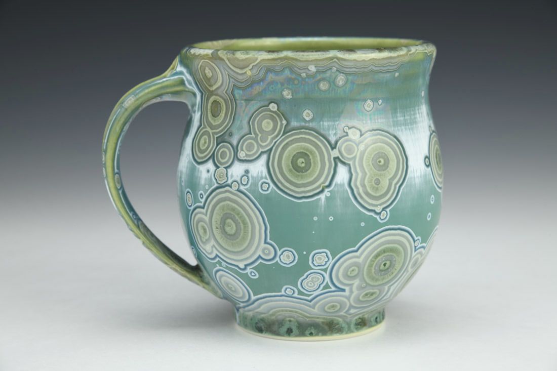 Grolleg porcelain, wheel thrown with pulled handle, oxide wash, crystalline glaze, acid etched, cone 10 crystalline fired, 4 x 5 x 3.5 inches.