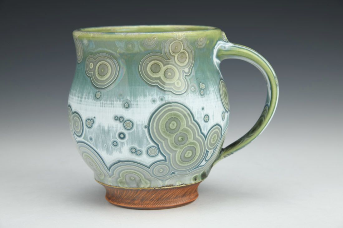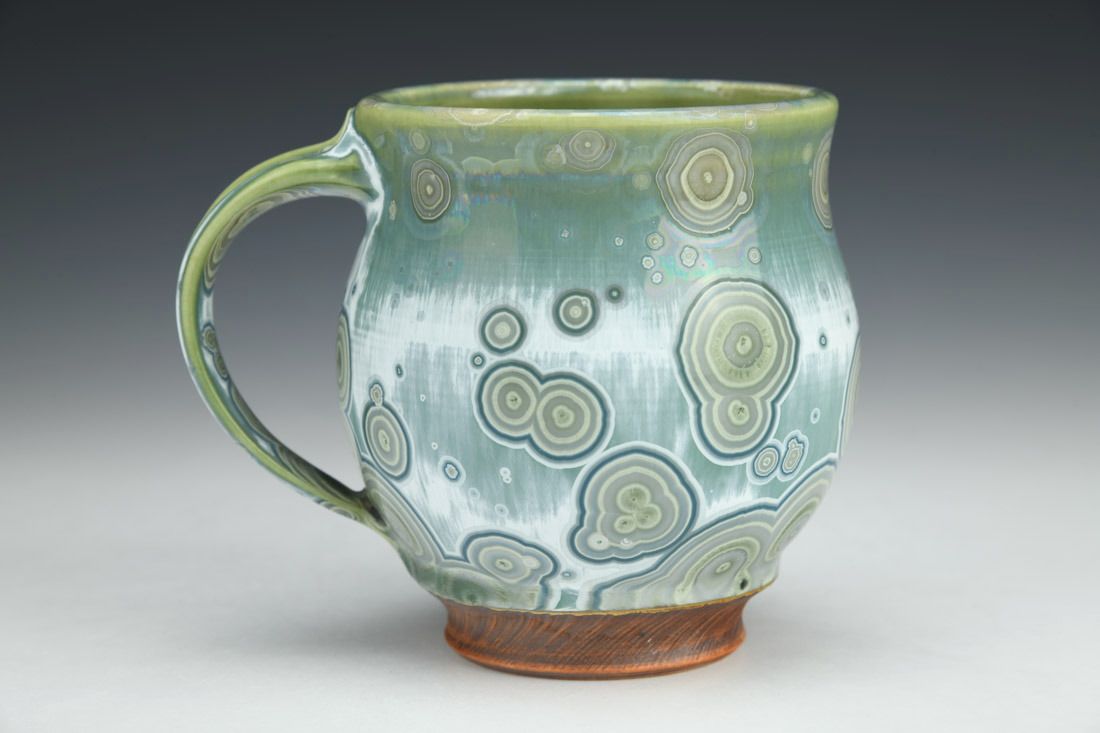 Grolleg porcelain, wheel thrown with pulled handle, oxide wash, crystalline glaze, acid etched, cone 10 crystalline fired, 4 x 5 x 3.5 inches.