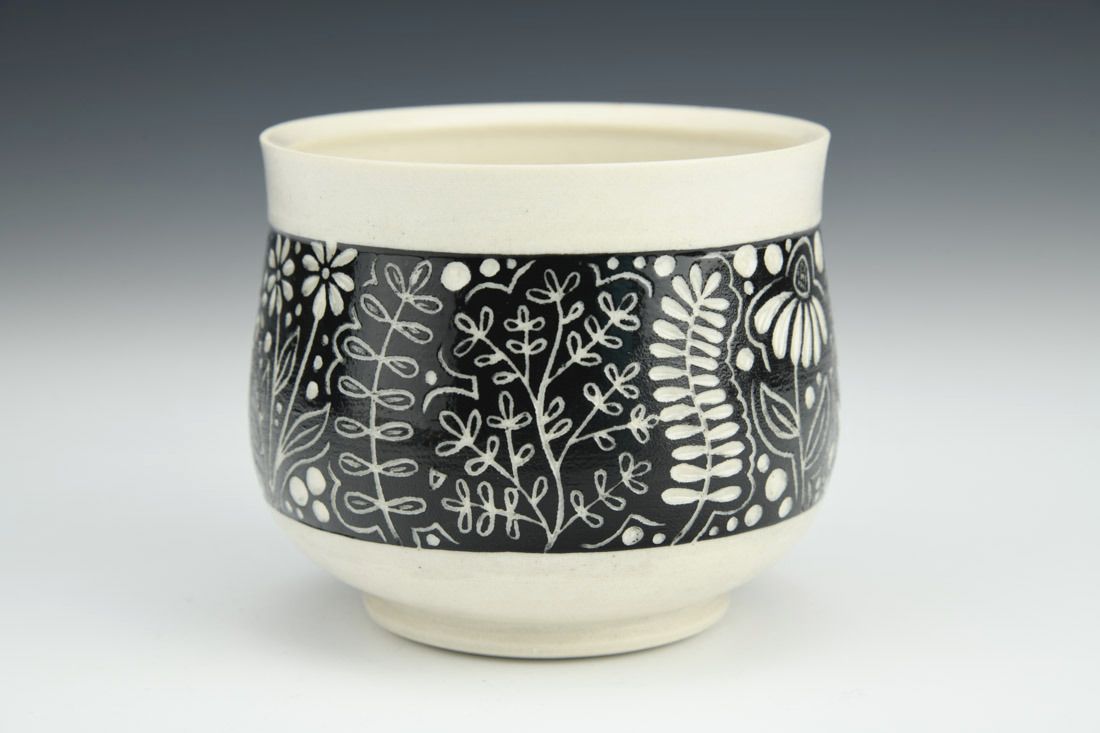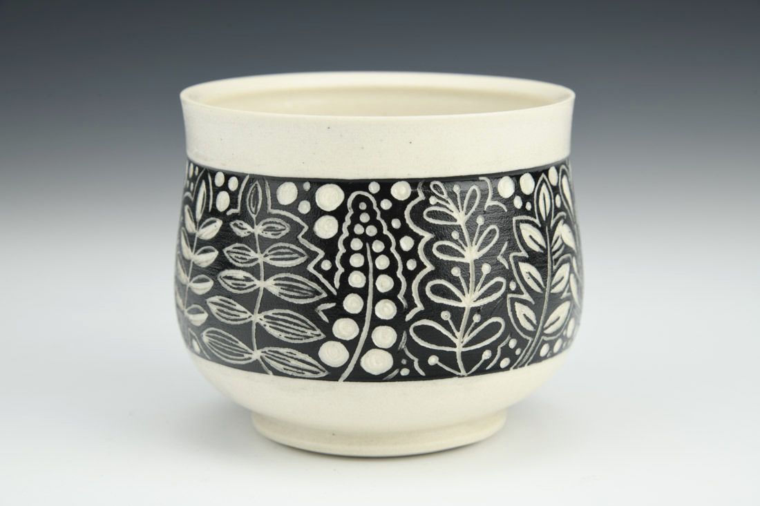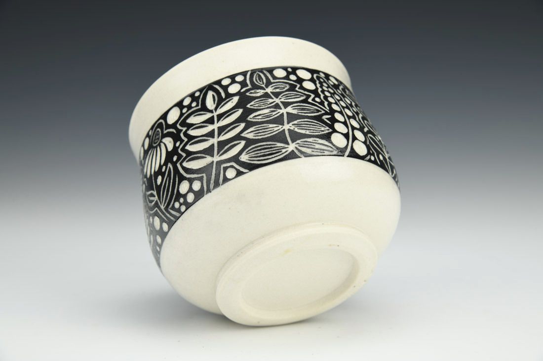 Porcelain, wheel thrown, underglaze, cone 6 oxidation fired, 3 x 3.25 x 3.25 inches.