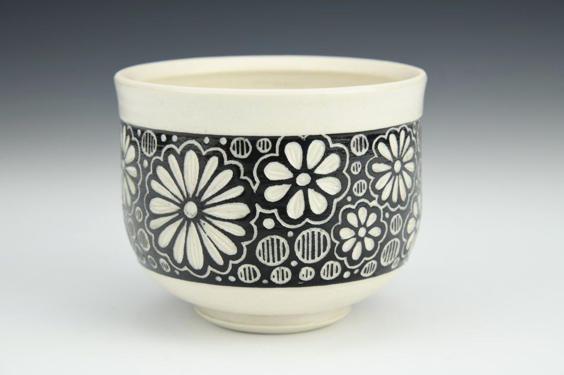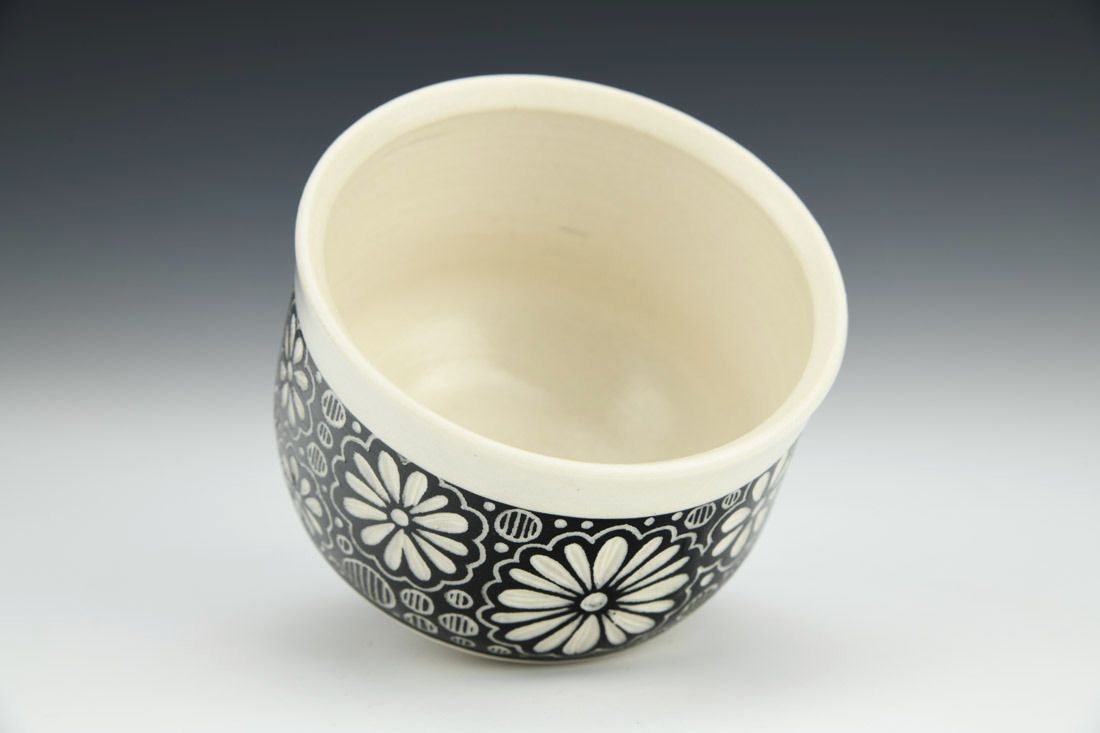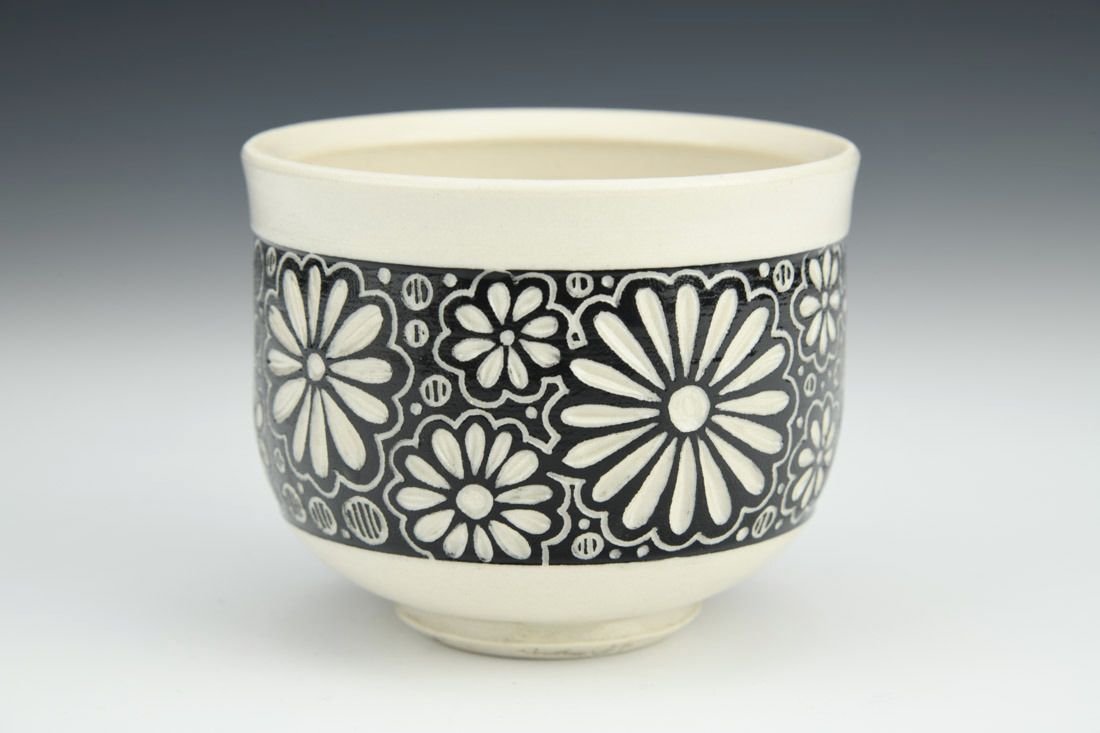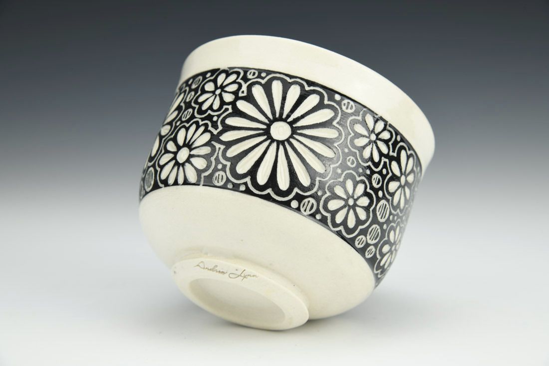 Porcelain, wheel thrown, underglaze, cone 6 oxidation fired, 3 x 3.5 x 3.5 inches.