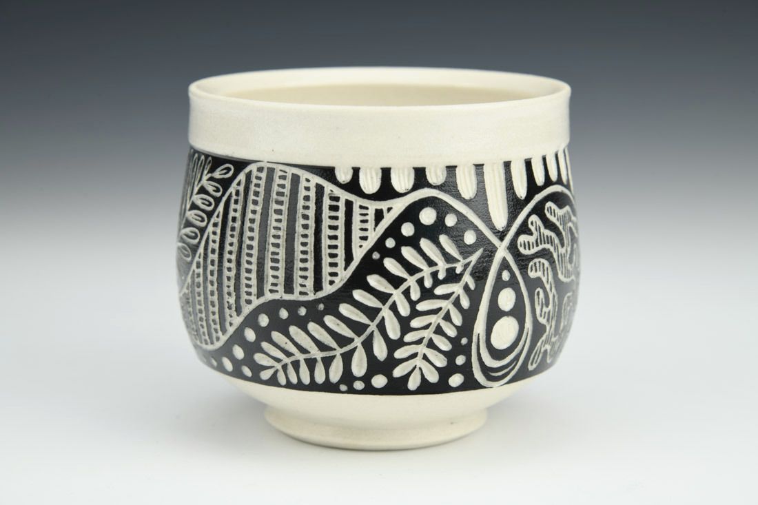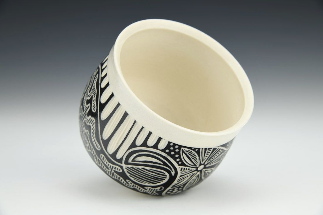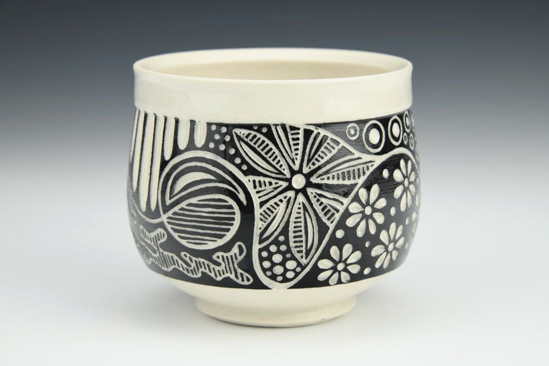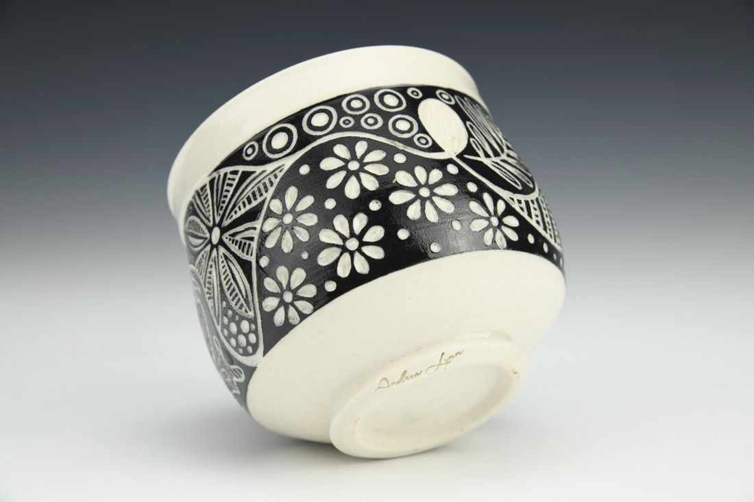 Porcelain, wheel thrown, underglaze, cone 6 oxidation fired, 3.25 x 3.5 x 3.5 inches.