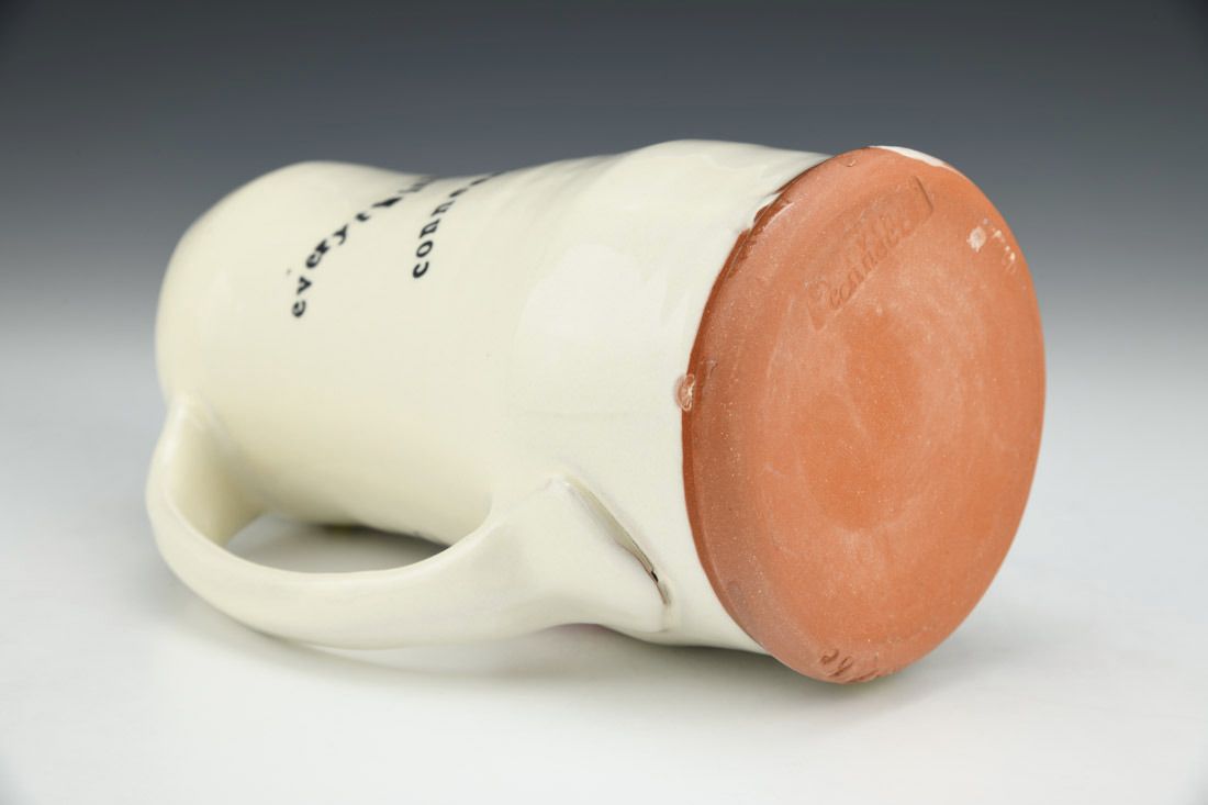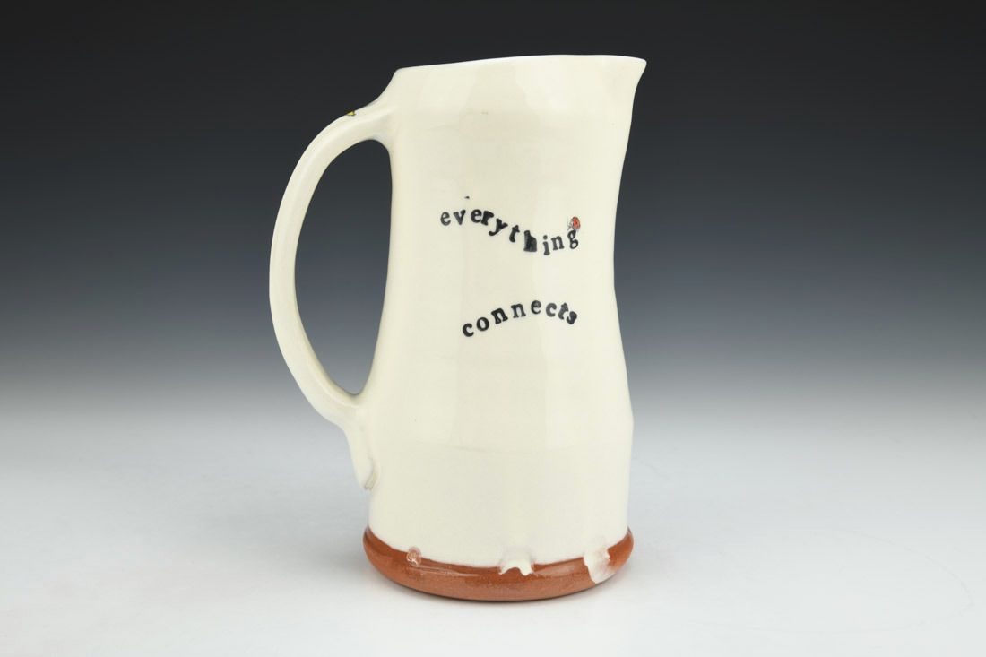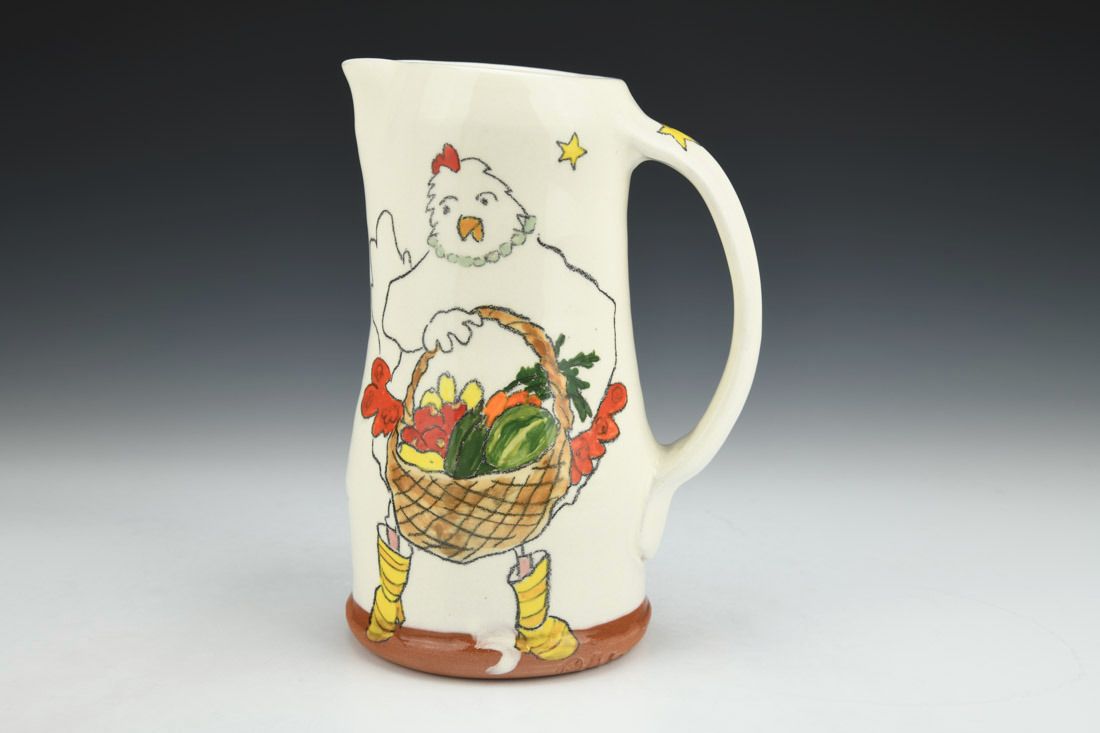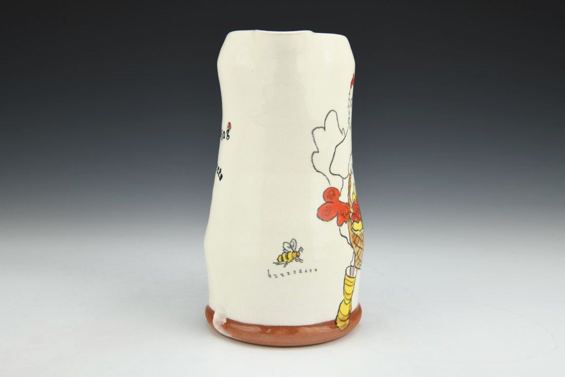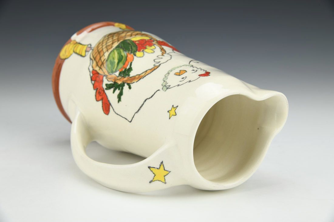 Earthenware, wheel thrown, white slip, ceramic pencil, underglaze, electric fired, 7.25 x 5 x 4.5 inches.