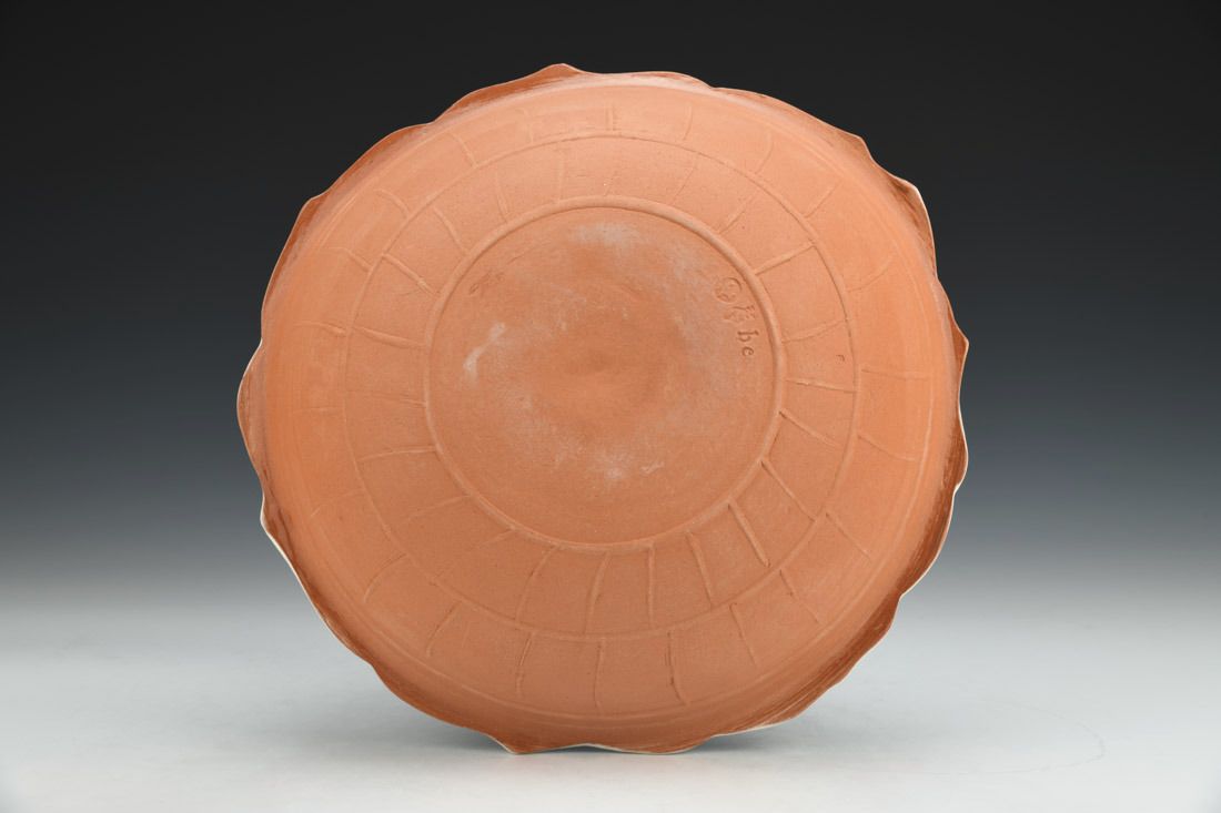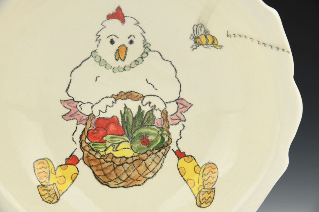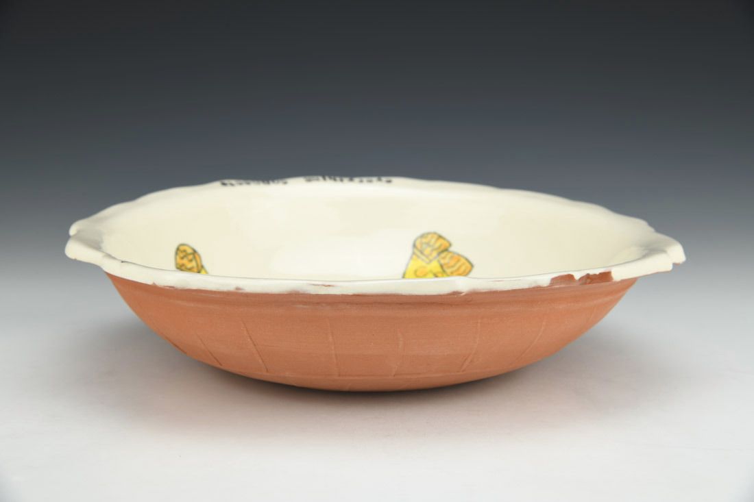 Earthenware, hand built with slabs in molds, white slip, ceramic pencil, underglaze, electric fired, 2.5 x 10.5 x 10.25 inches.