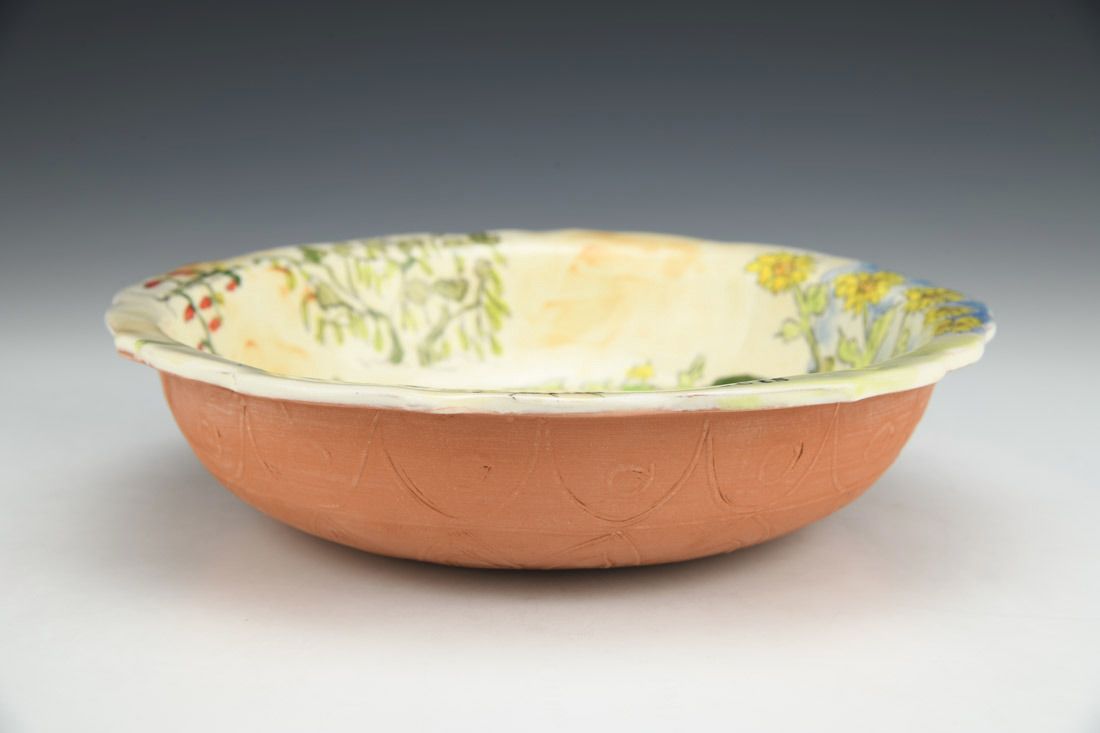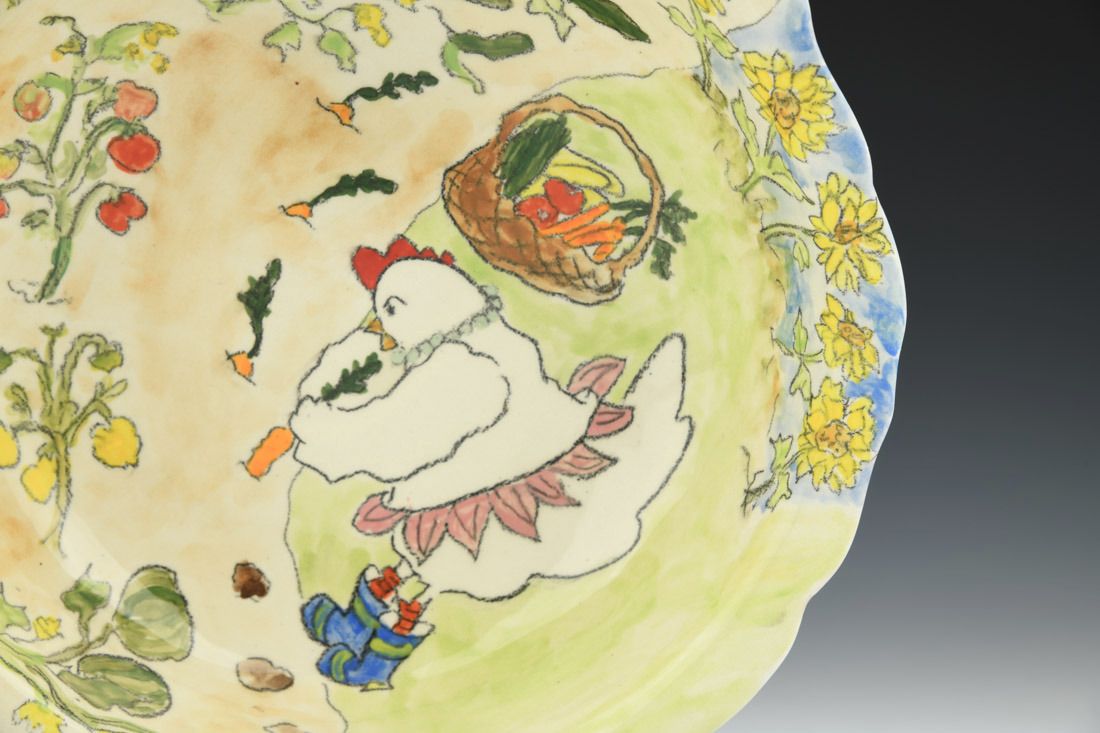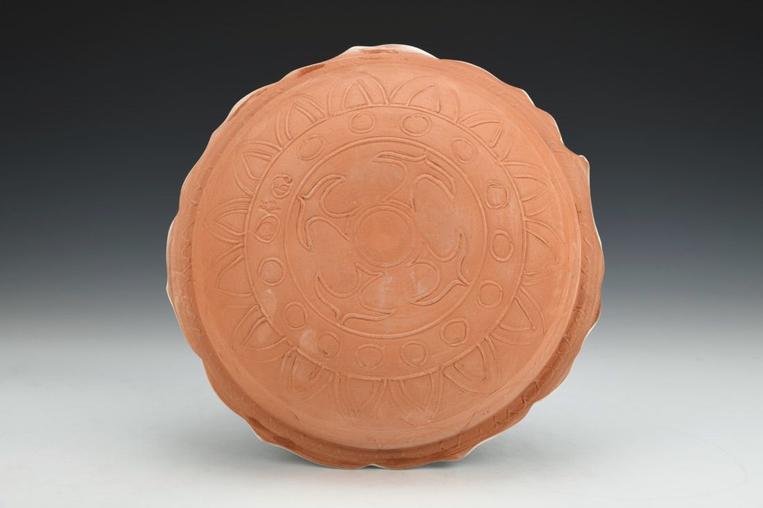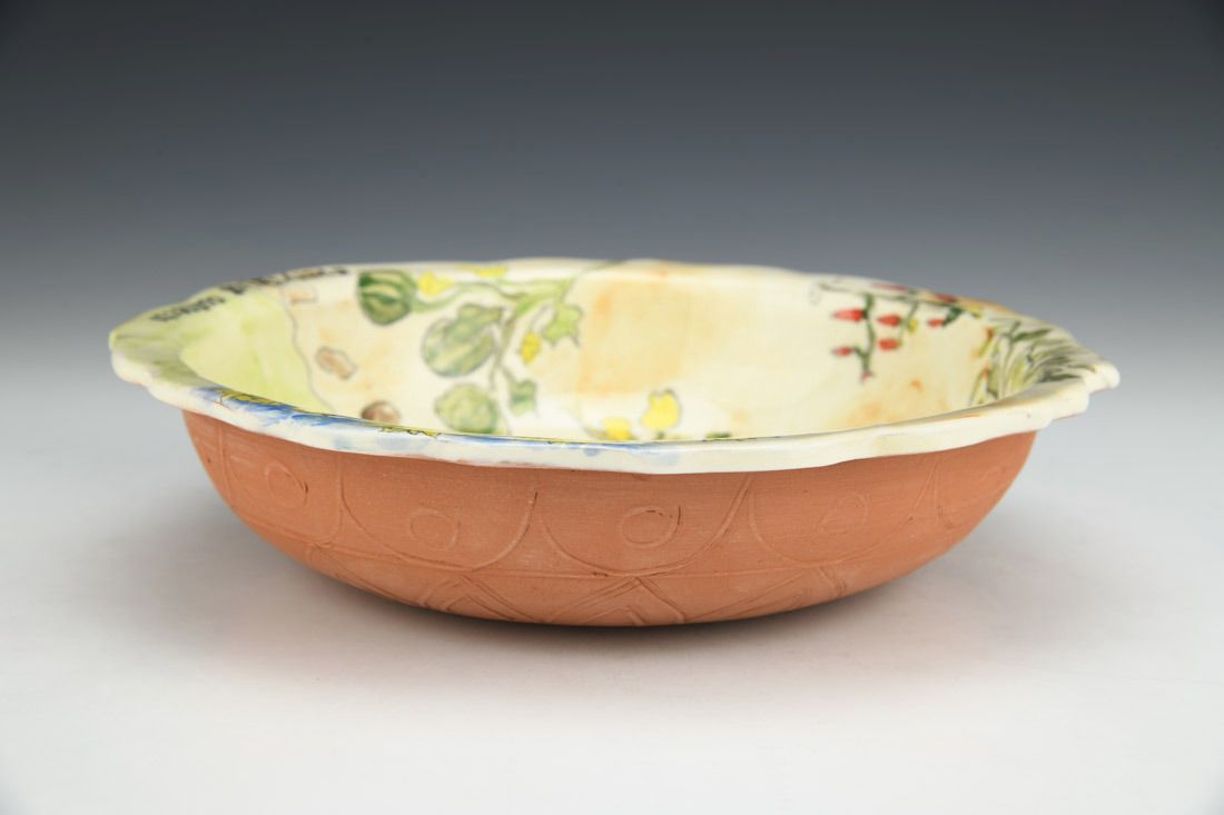Earthenware, hand built with slabs in molds, white slip, ceramic pencil, underglaze, electric fired, 2.25 x 8.75 x 9 inches.