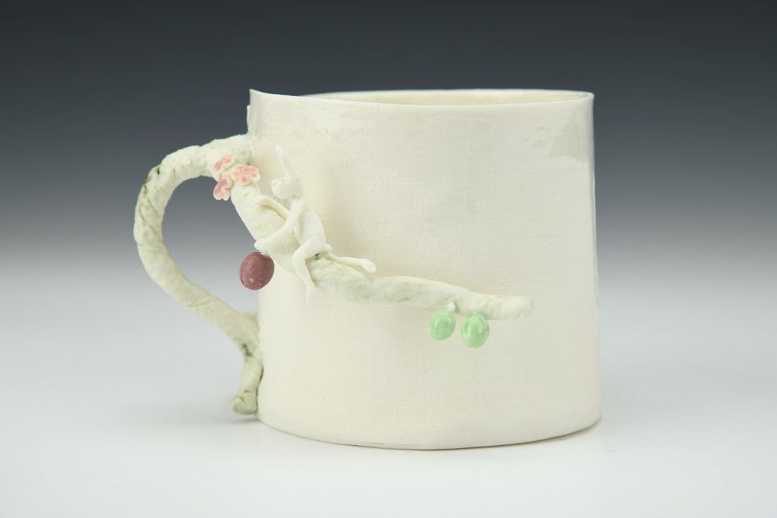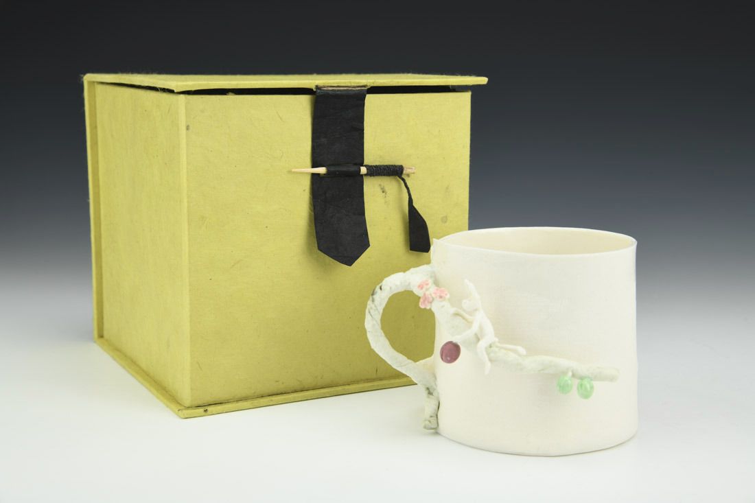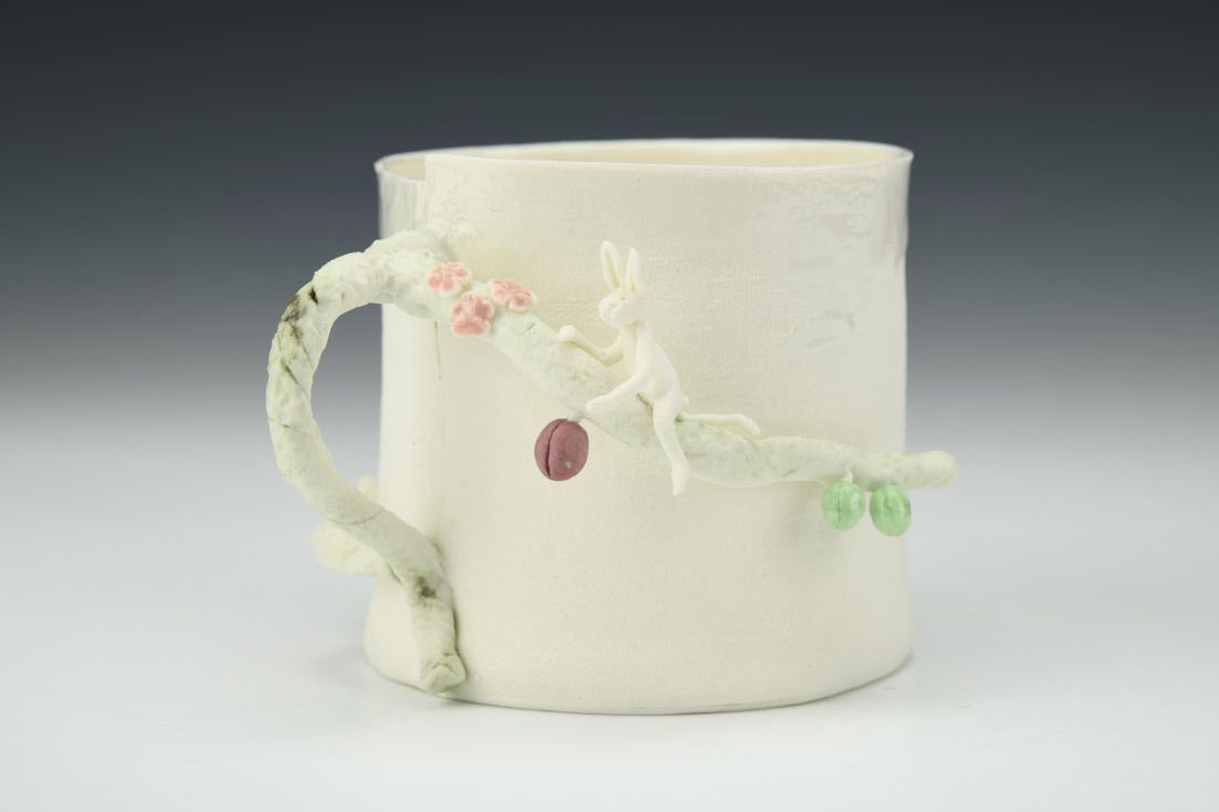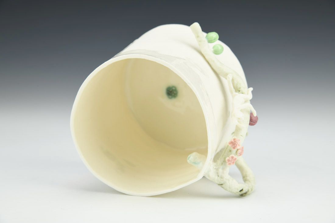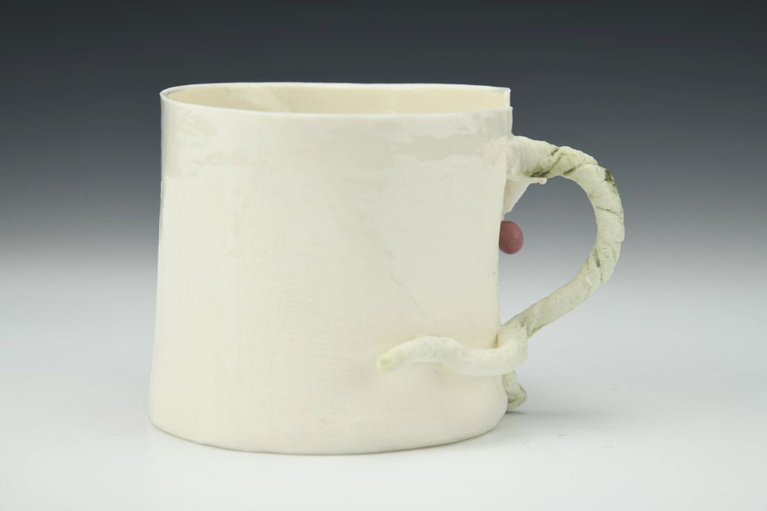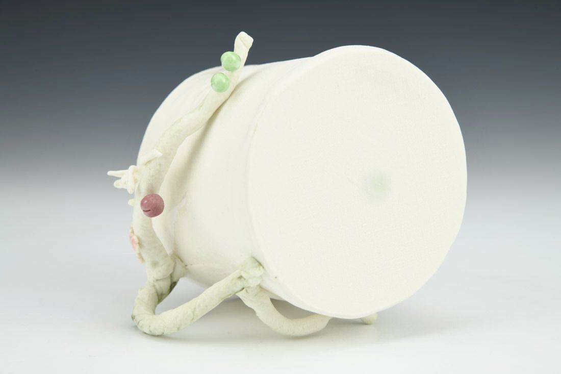 Porcelain flax clay and colored porcelain, hand built with slabs, sculptural elements, clear glaze, copper oxide, pink glaze, cone 7 electric fired, 3 x 4.25 x 3.5 inches.