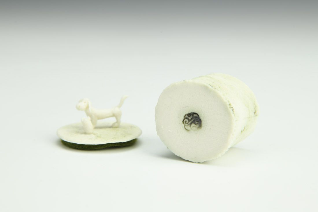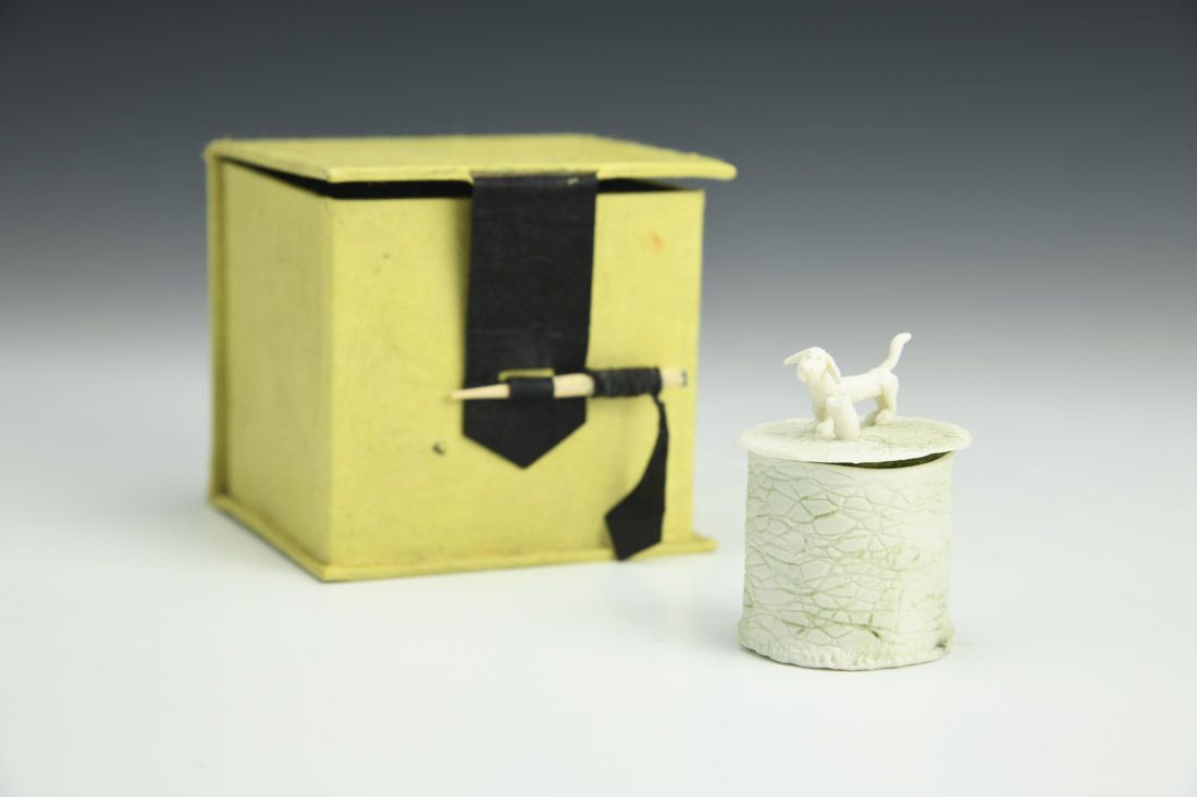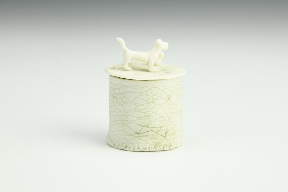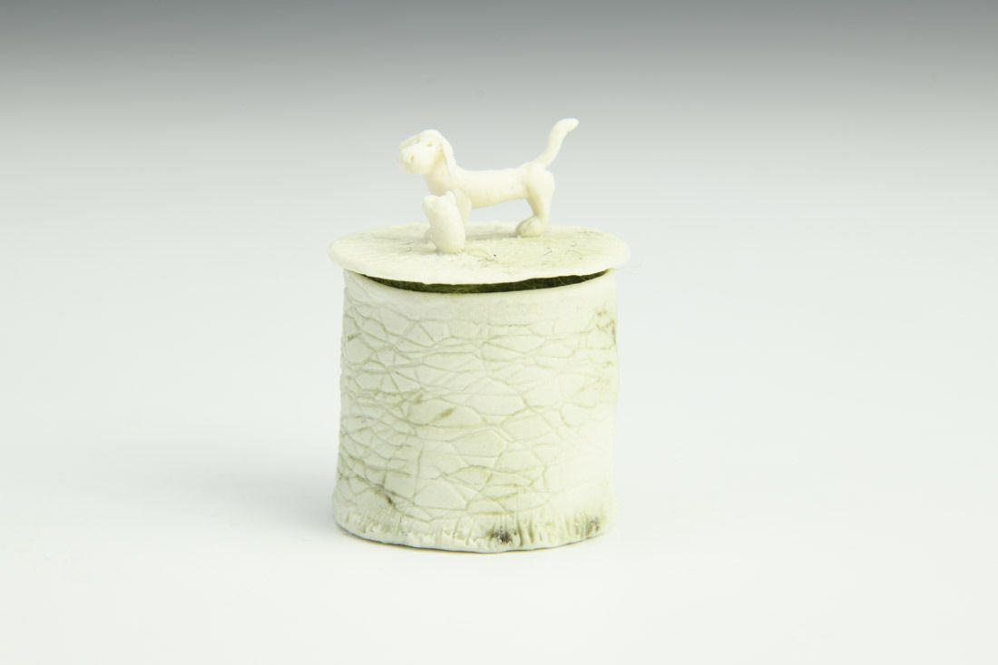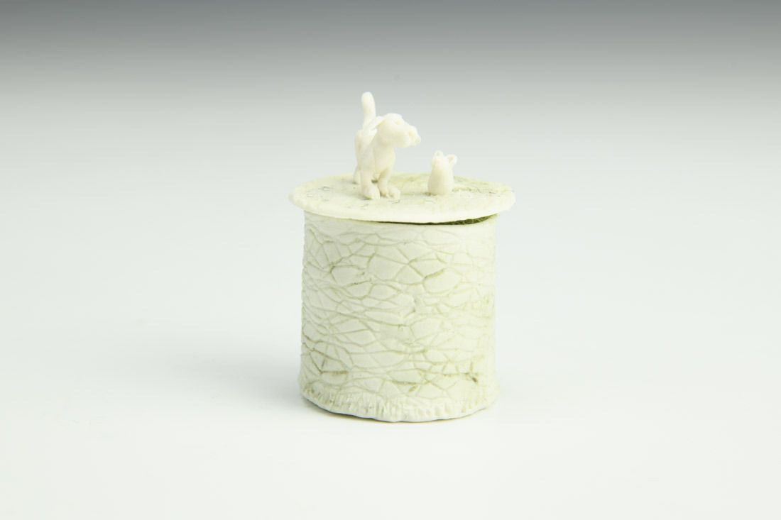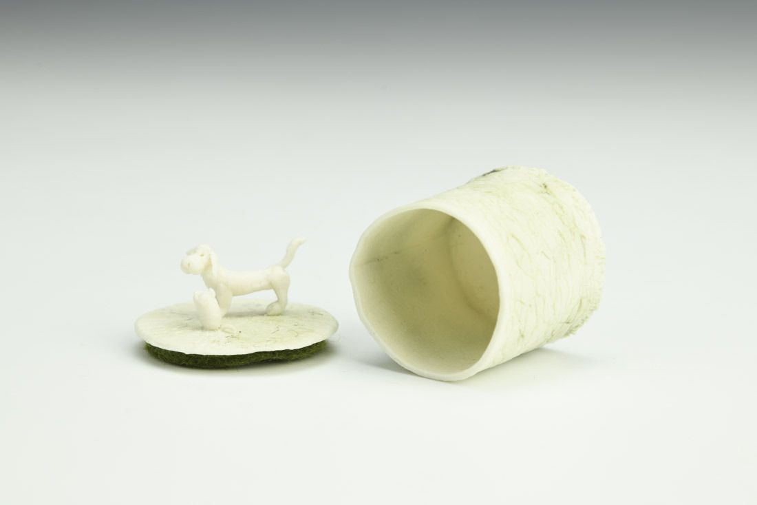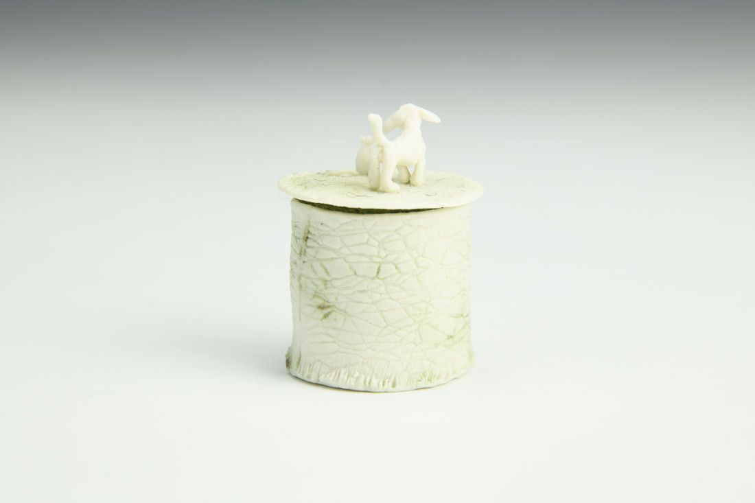 Porcelain paper clay with wool felt, hand built with slabs, green underglaze, copper oxide, cone 7 electric fired, 1.75 x 1.25 x 1.25 inches.