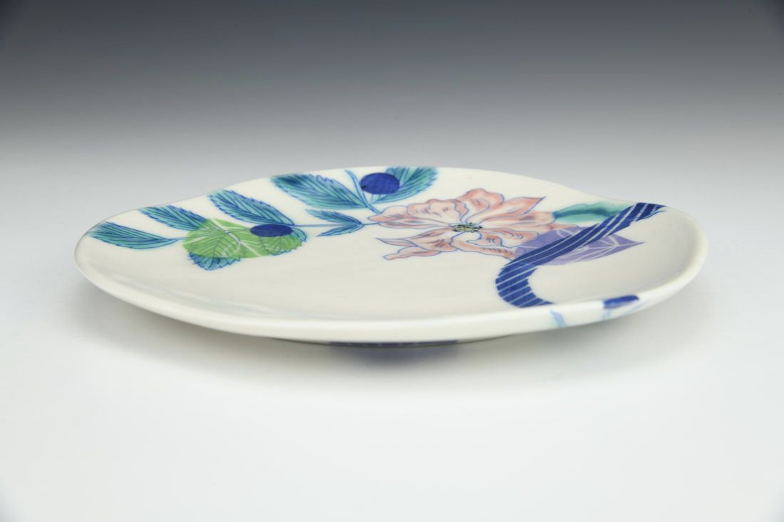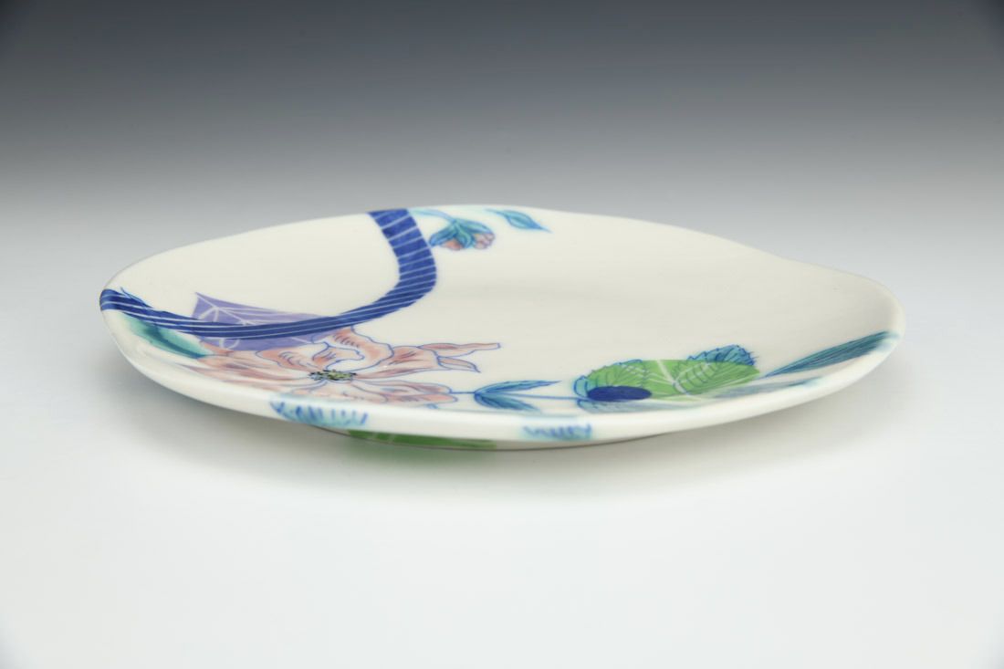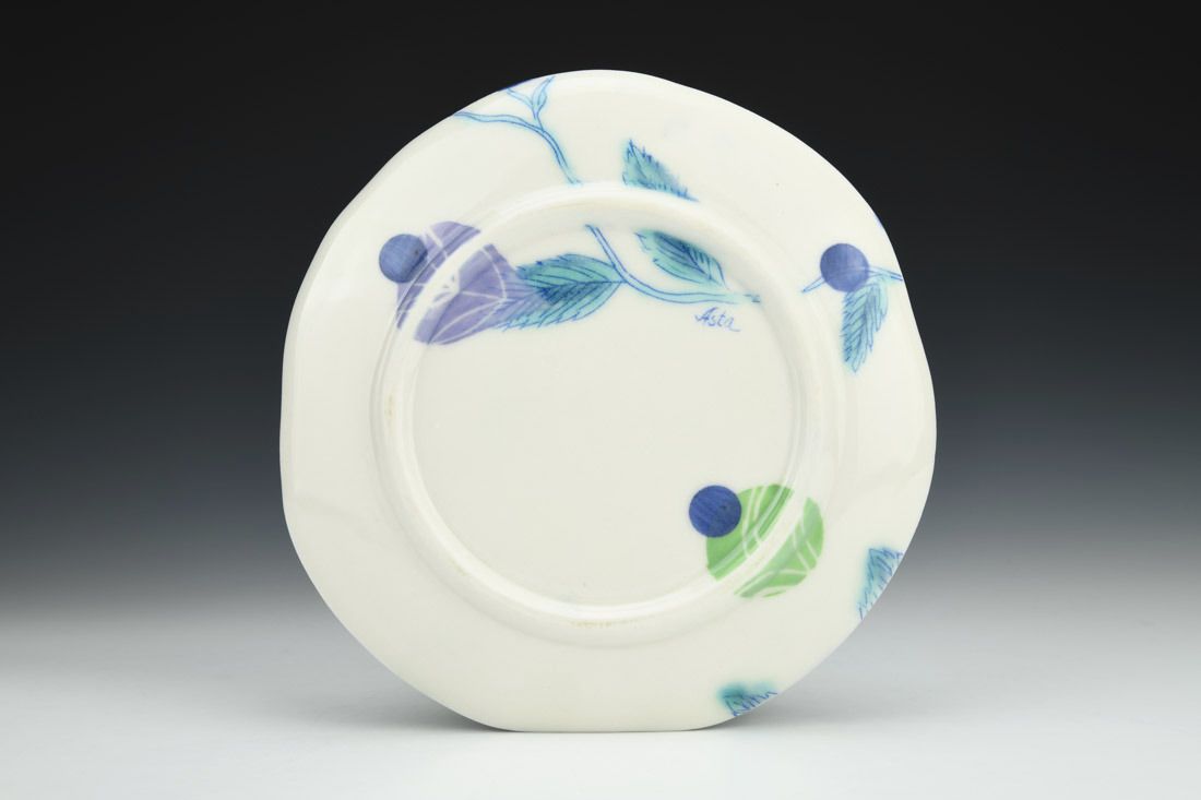 Porcelain, wheel thrown, cone 6 electric fired, 0.75 x 7.5 x 7.5 inches.