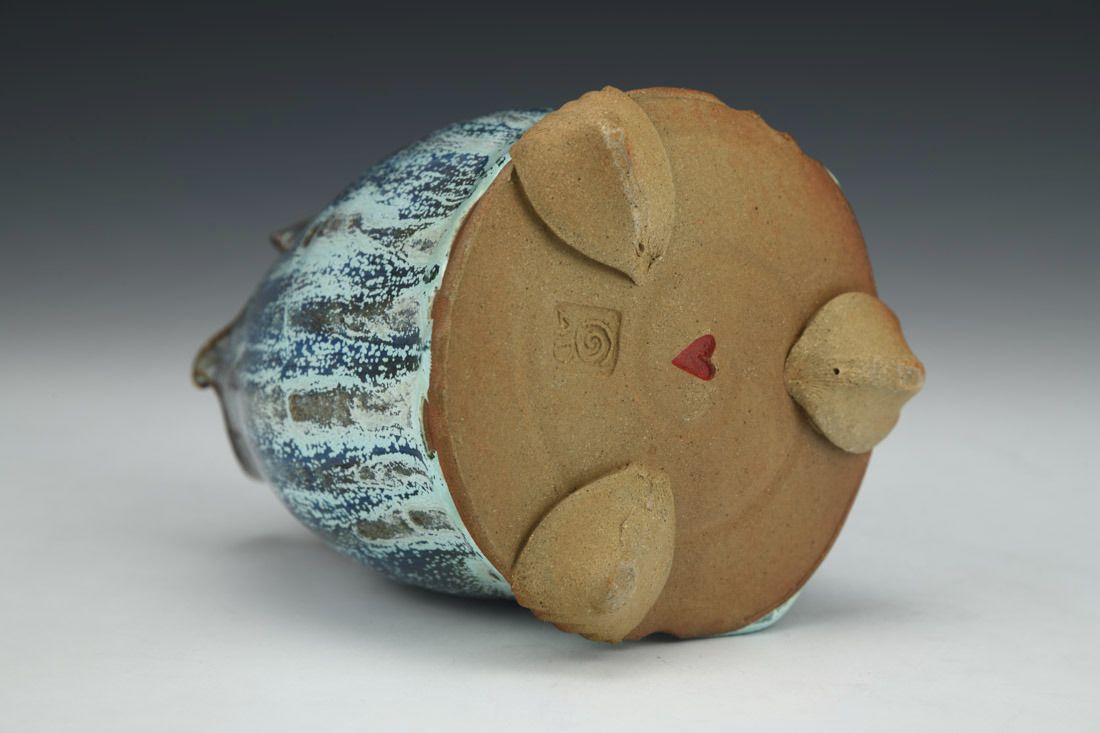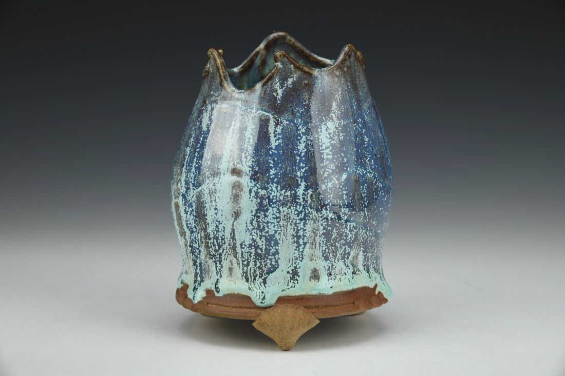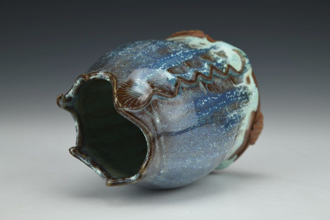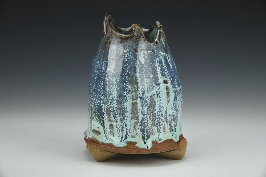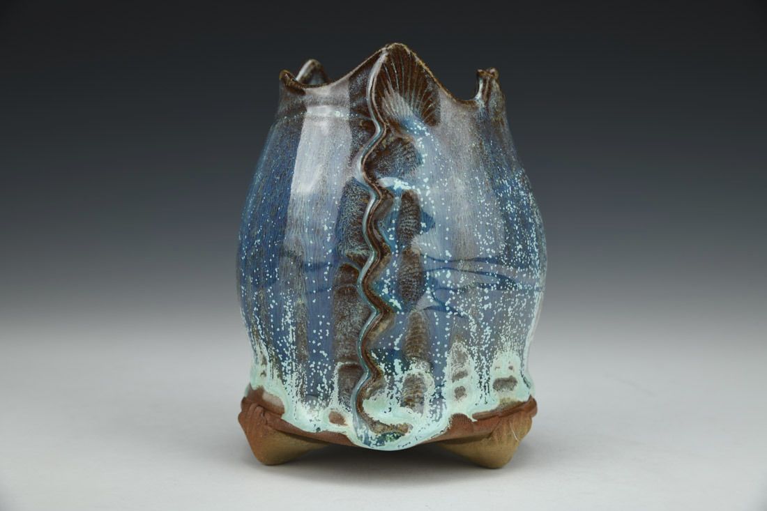 Toasted stoneware, hand built with slabs, cone 7 oxidation fired, 5 x 3.75 x 3.75 inches.