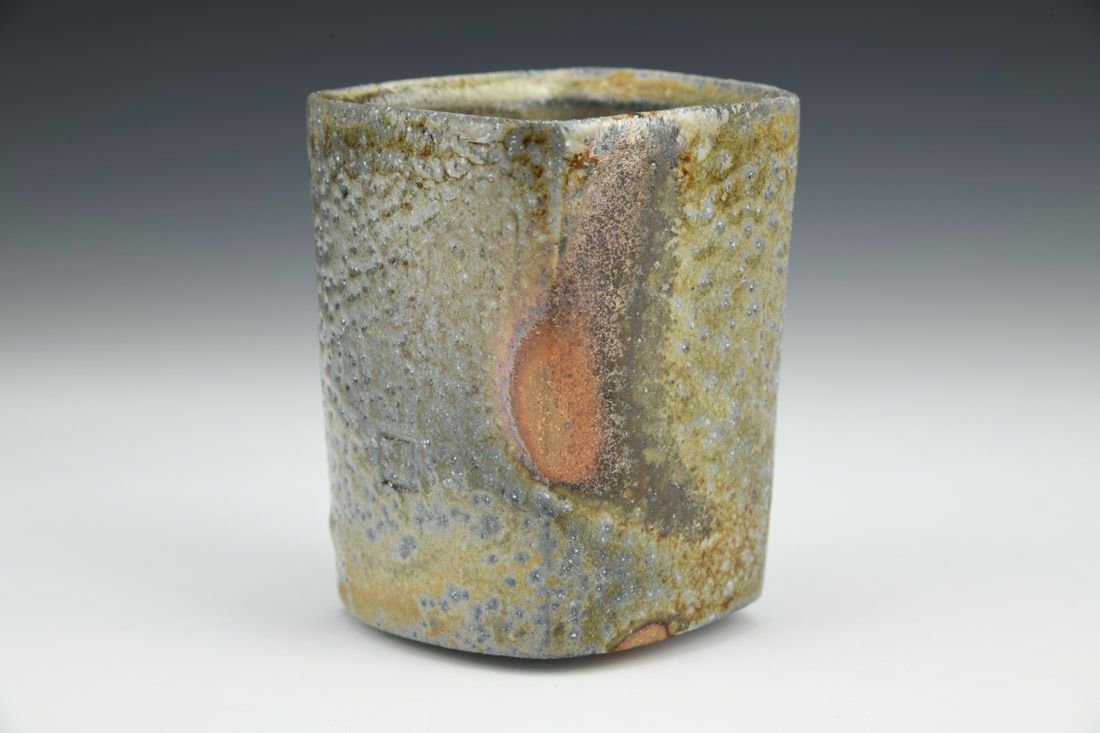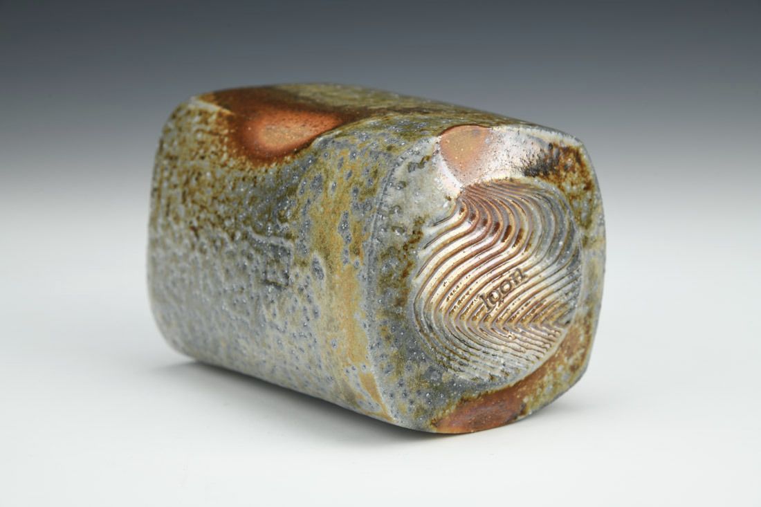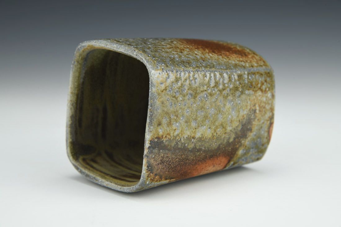 Tan stoneware, wheel thrown and altered, ash glaze, woodfired in train kiln, 4 x 3 x 3 inches.