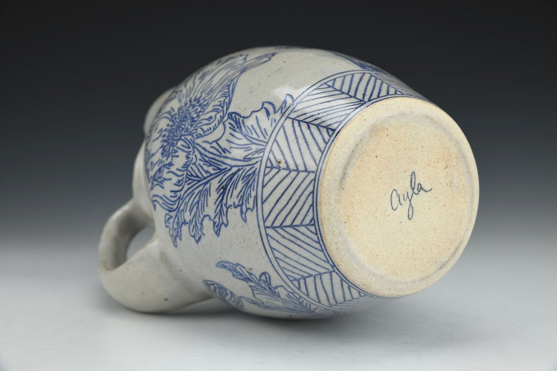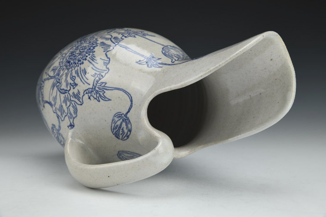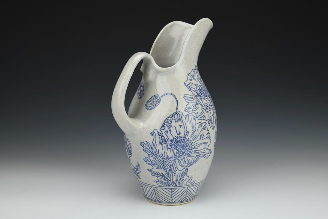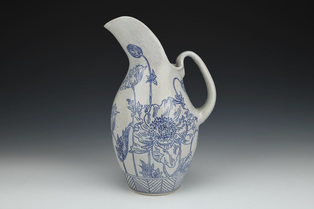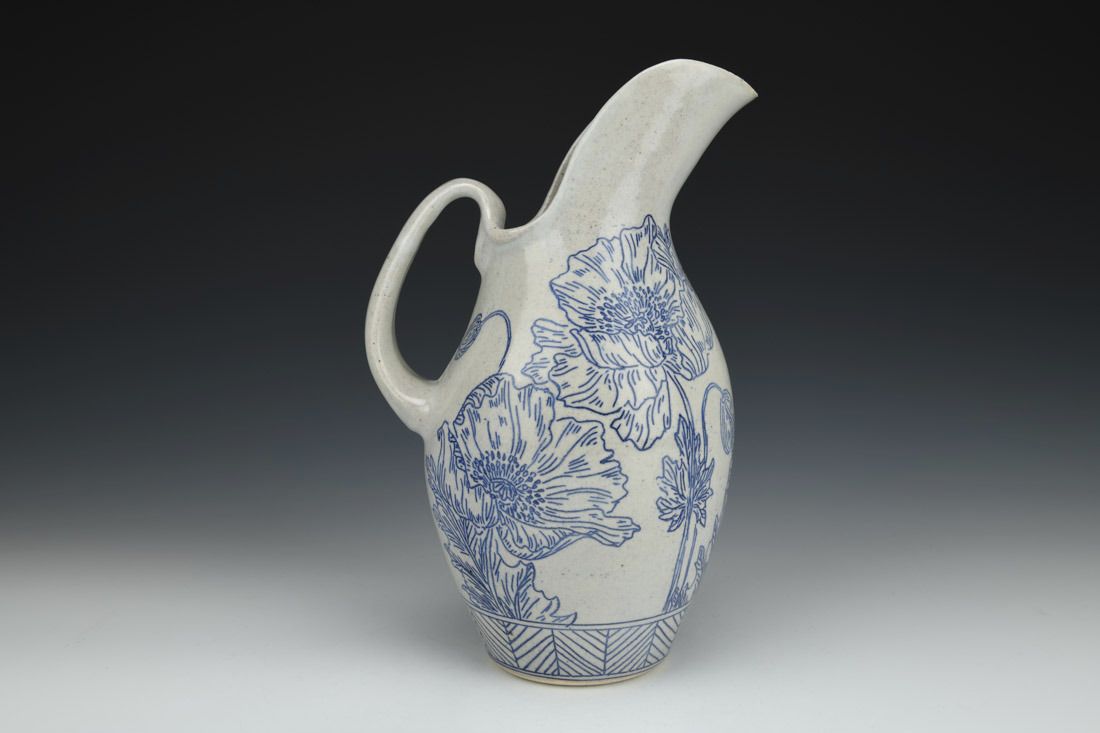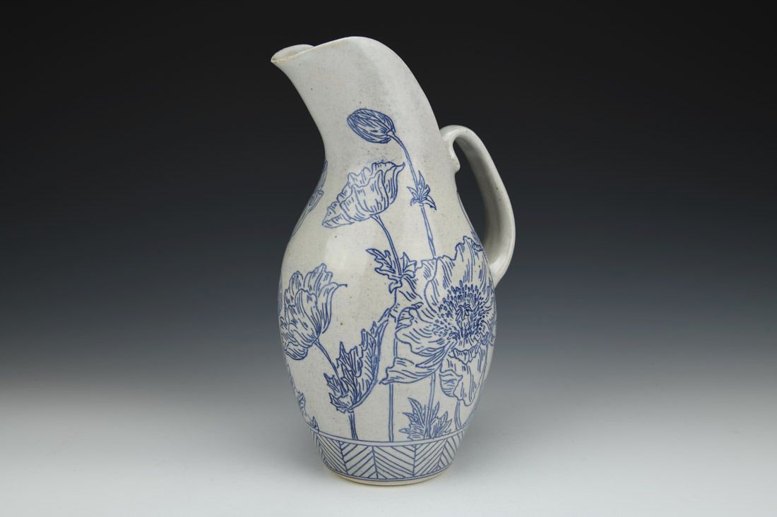 Stoneware, wheel thrown, mishima, underglaze, celadon glaze, cone 10 reduction fired, 10 x 6 x 5.5 inches.