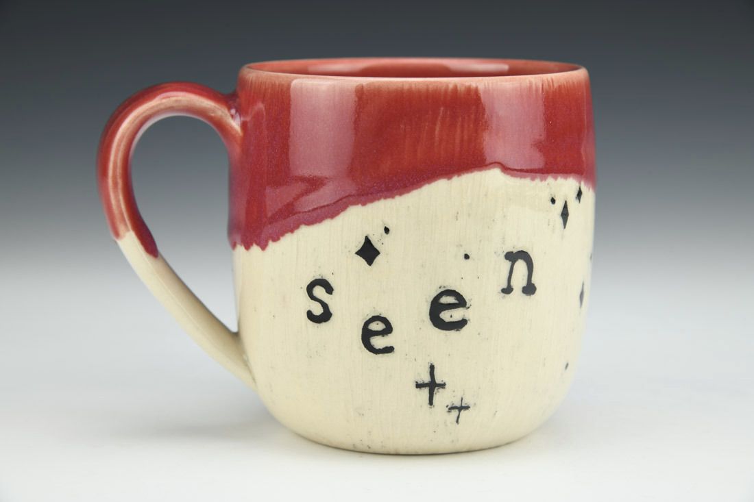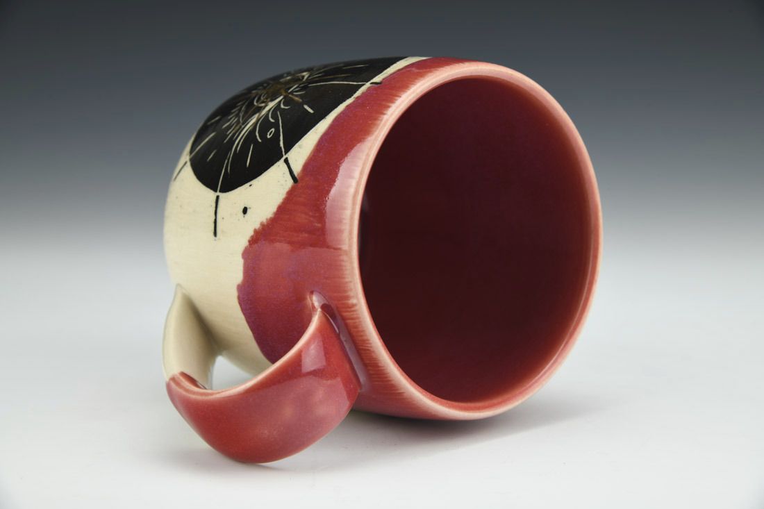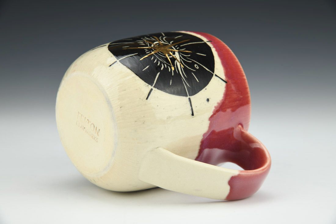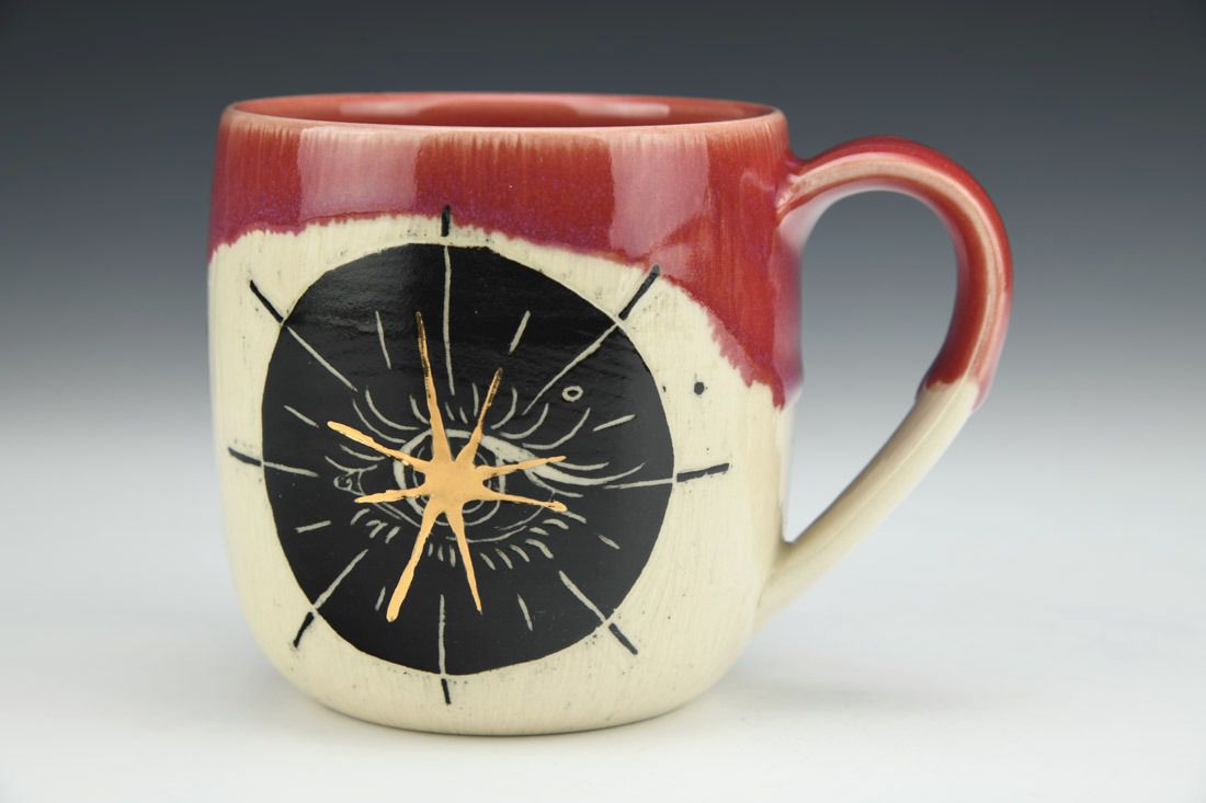 B-mix, wheel thrown, sgraffito, underglaze, glaze, gold luster, cone 6 electric fired, 3.75 x 5 x 3.75 inches.