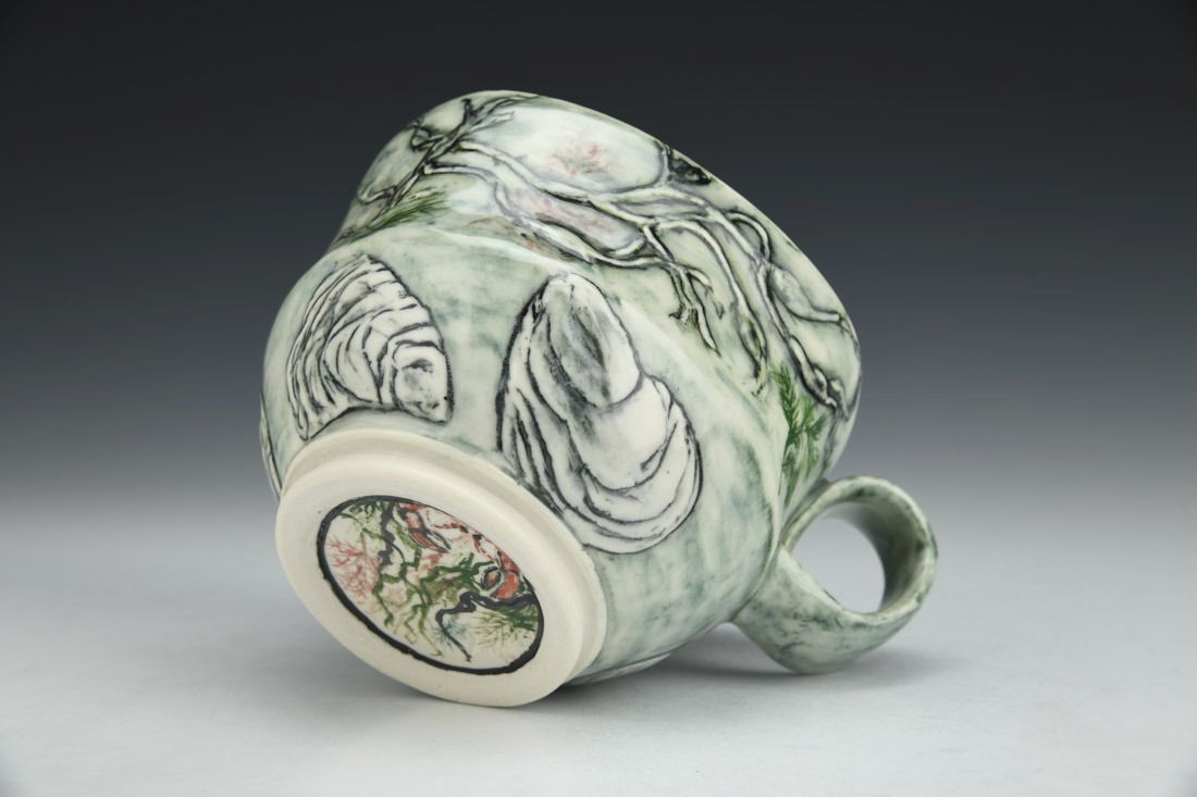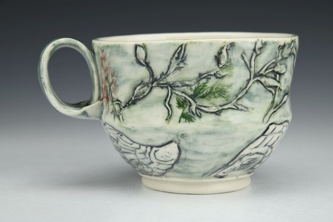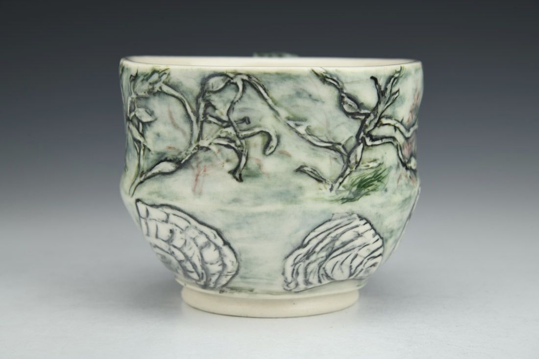Porcelain, wheel thrown and altered, carved, sgraffito, underglaze, glaze, cone 6 oxidation fired, 3.5 x 5.75 x 4.25 inches.