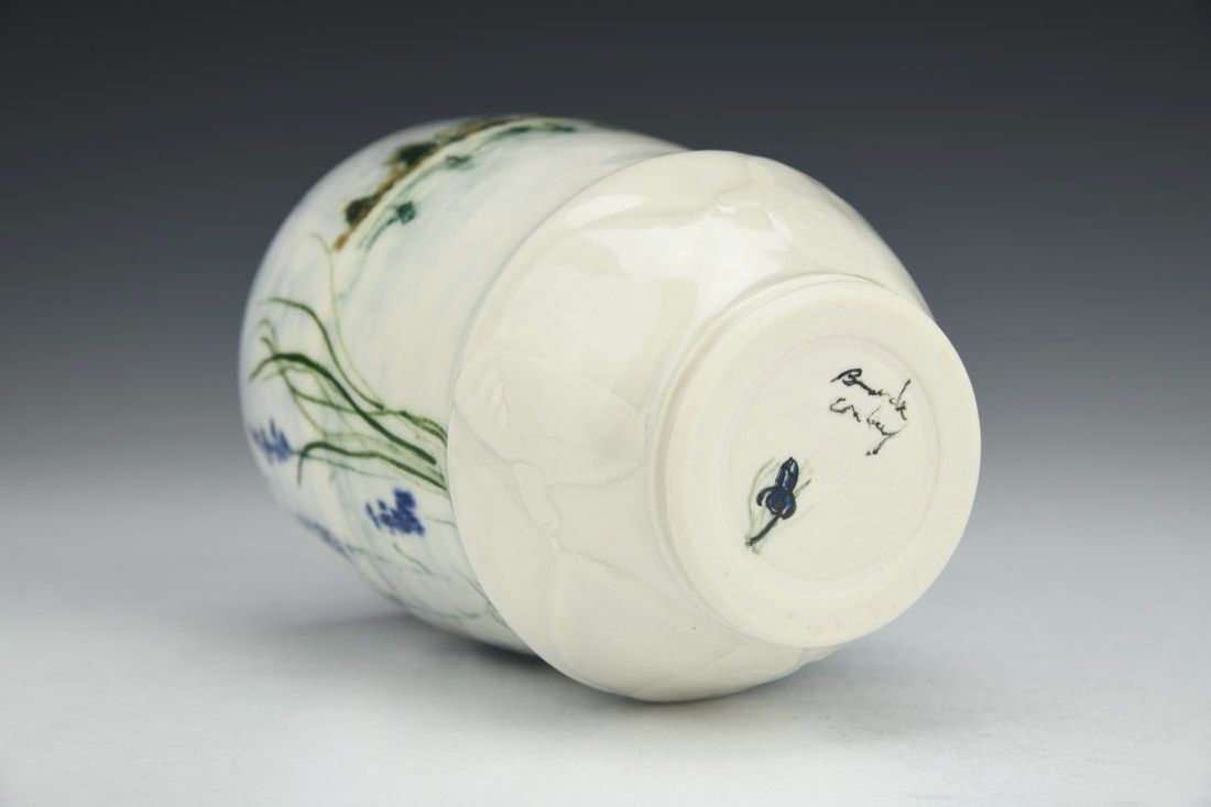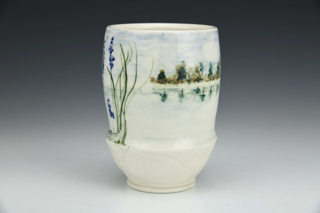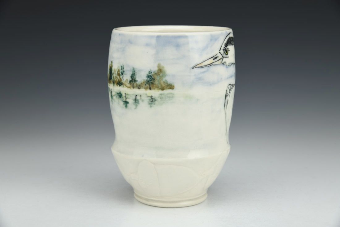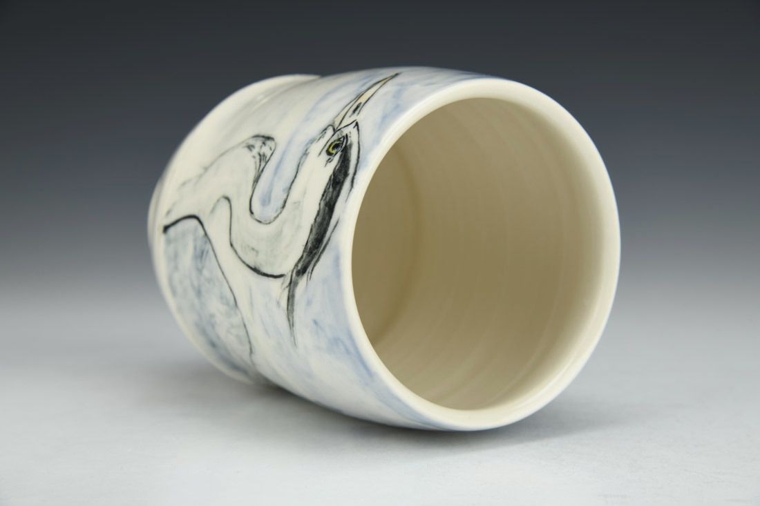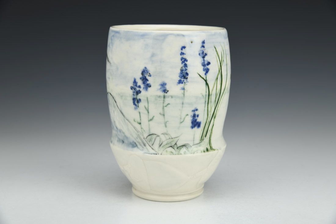 Porcelain, wheel thrown, carved, sgraffito, underglaze, glaze, cone 6 oxidation fired, 5 x 3.5 x 3.5 inches.